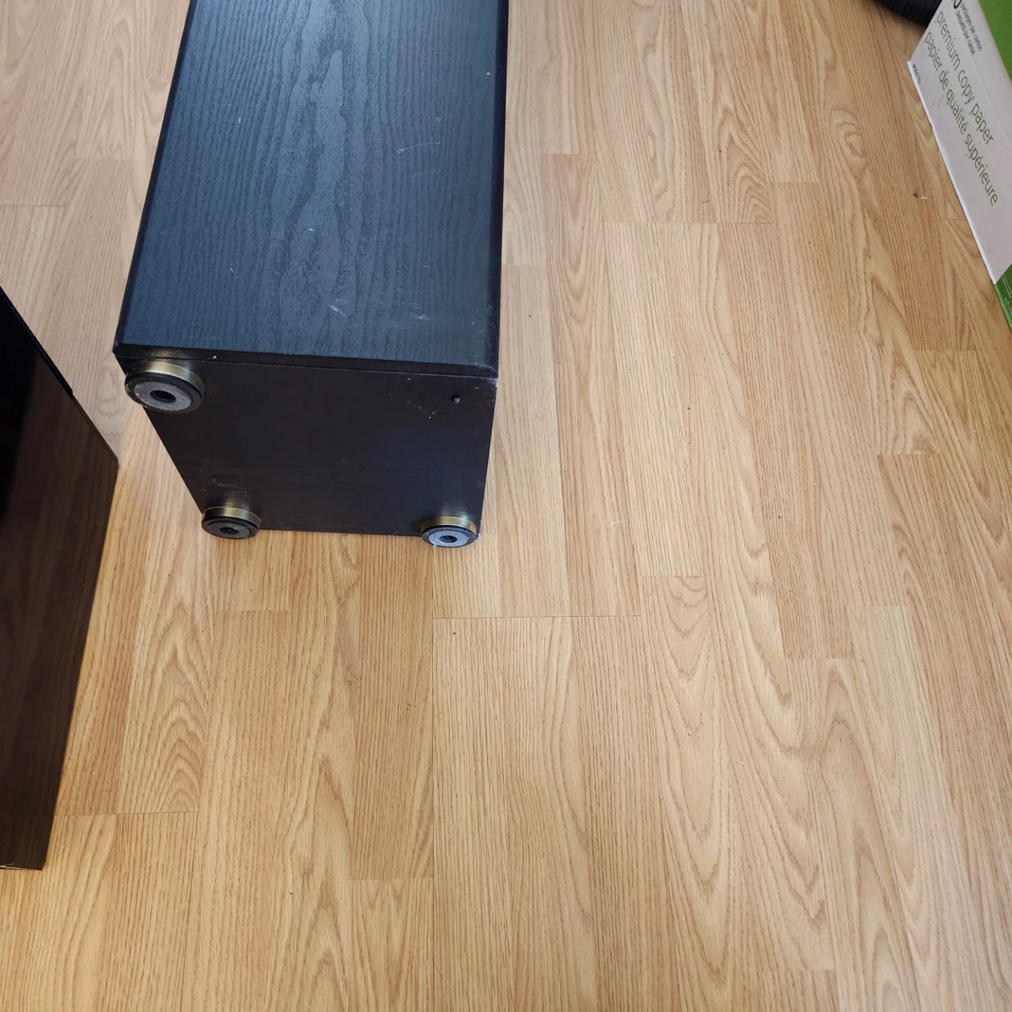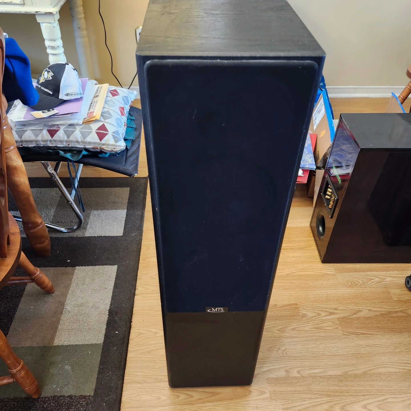 Pair of MTS floor standing speakers in black wood grain finish. These tower speakers are great for home audio setups. They feature a sleek design with black grilles. Includes adjustable feet. Missing 1 bottom foot as seen in picture.