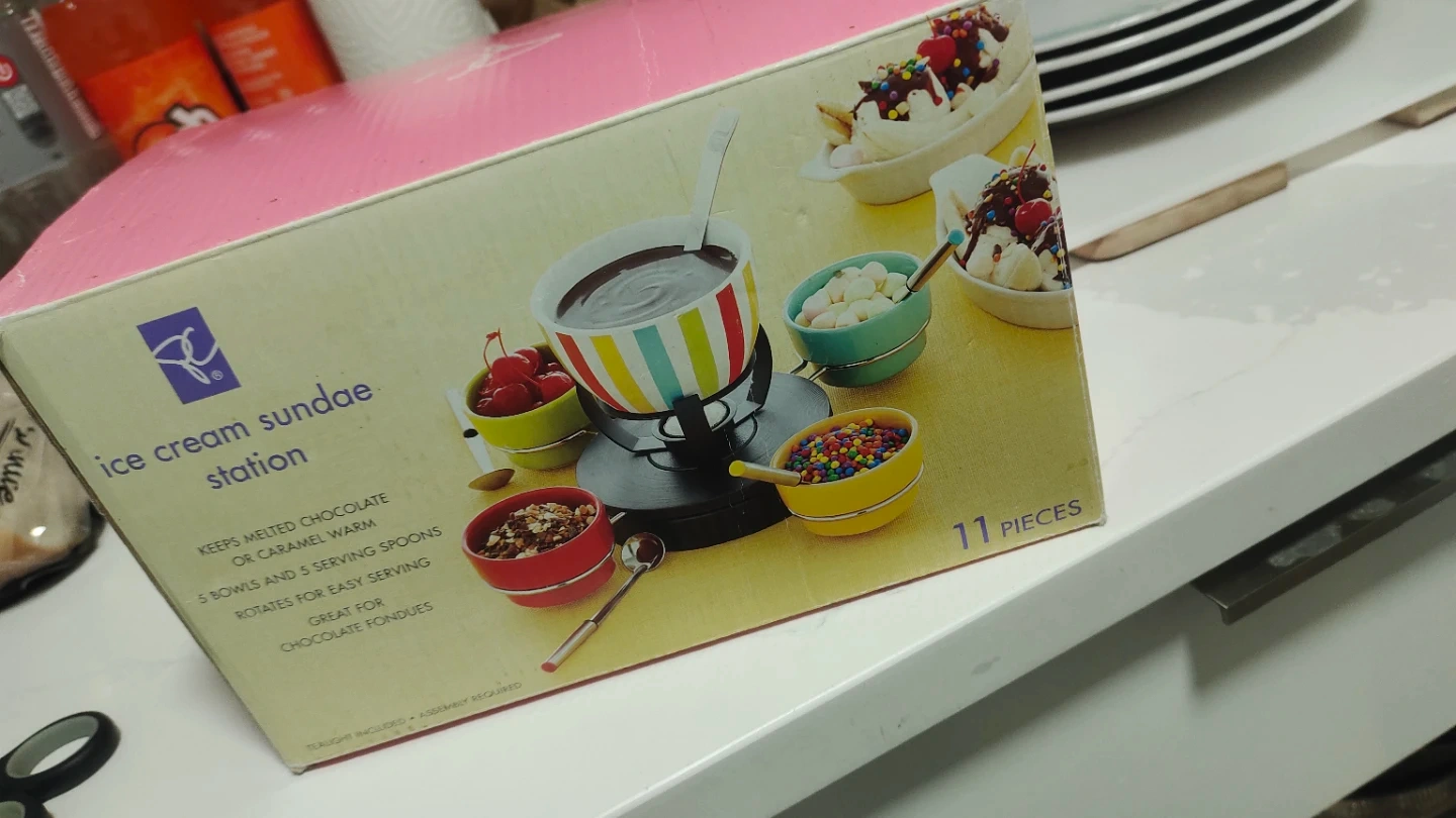 This ice cream sundae station keeps melted chocolate or caramel warm. It comes with 5 bowls and 5 serving spoons and rotates for easy serving. It's great for chocolate fondues! Lost themiddle bowl, but change toa beautiful bowl from Japan.