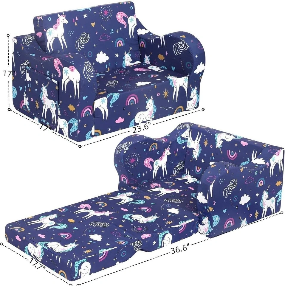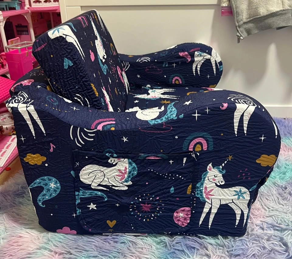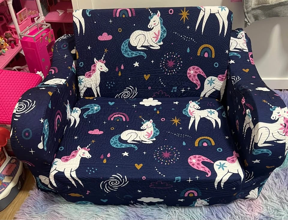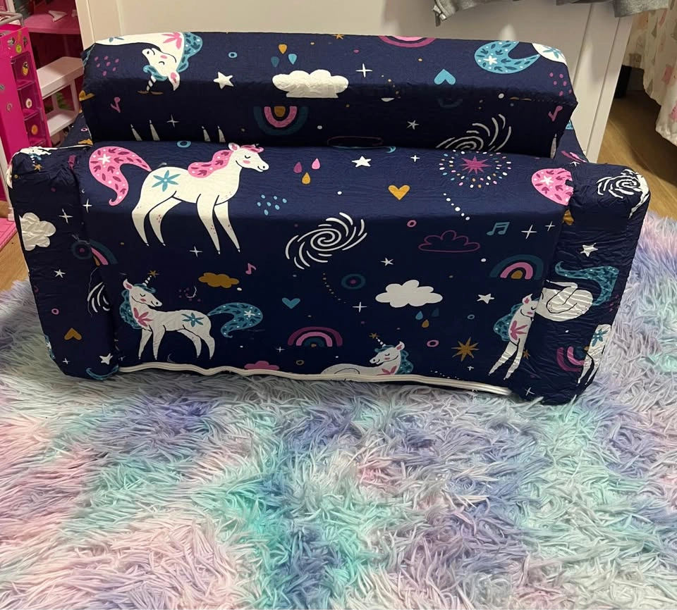Like new, comes with original packaging. Features a Rainbow Unicorn print, perfect for adding a touch of magic to your child's room. This comfy chair is lightweight and easy to move, ideal for reading, playing, or watching TV. It's a convertible chair that's great for toddlers. Made from durable, soft, and easy-to-clean polyester. A unique gift for boys and girls that matches any room decor. Can also be used for camping! Recommended for ages 18 months and up.