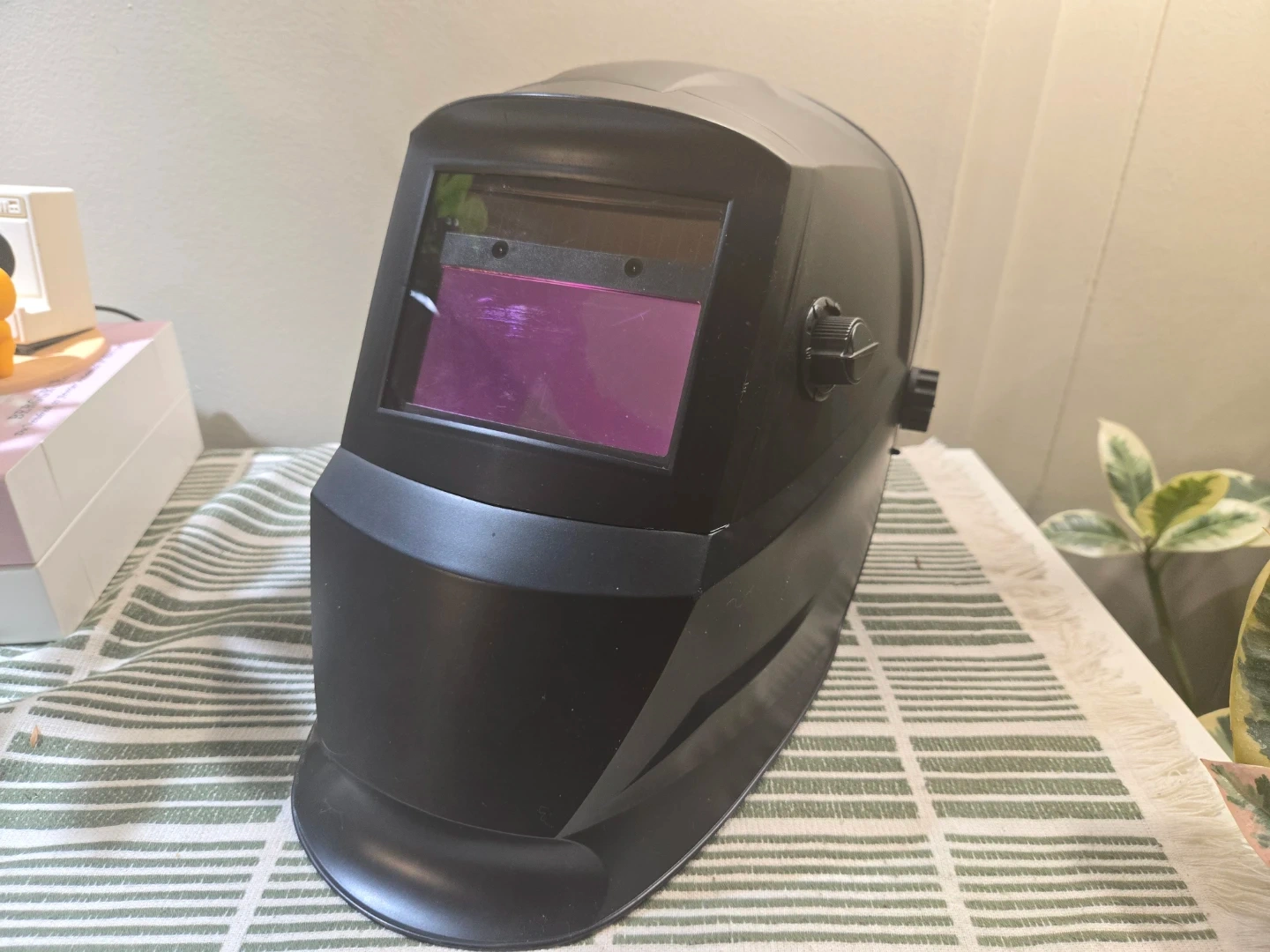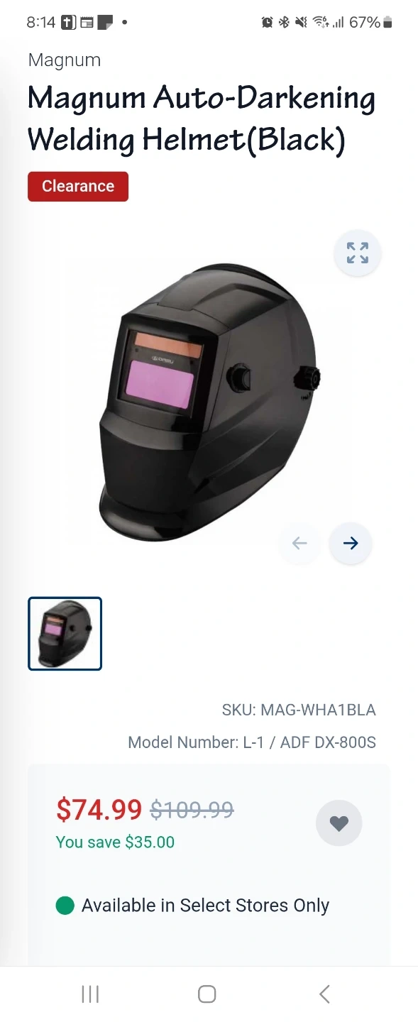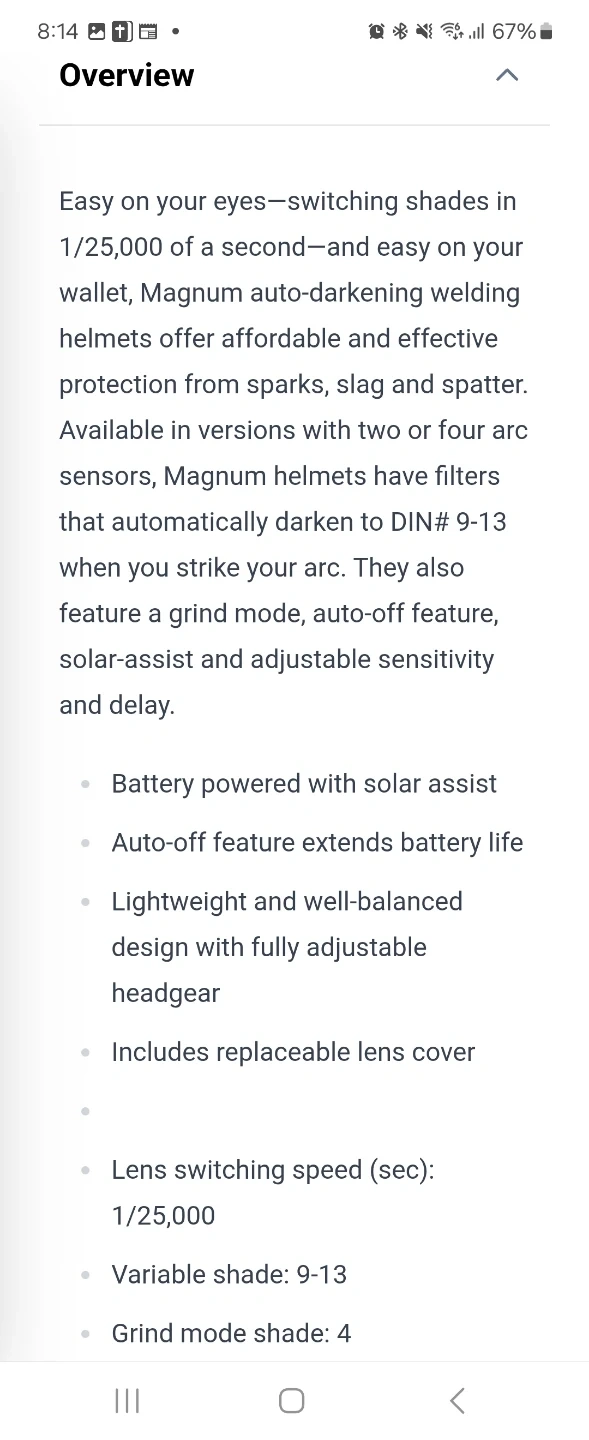 This auto-darkening welding helmet from Magnum offers variable shade 9-13 and a lens switching speed of 1/25,000 of a second. It's battery-powered with solar assist and includes a lightweight, adjustable headgear.