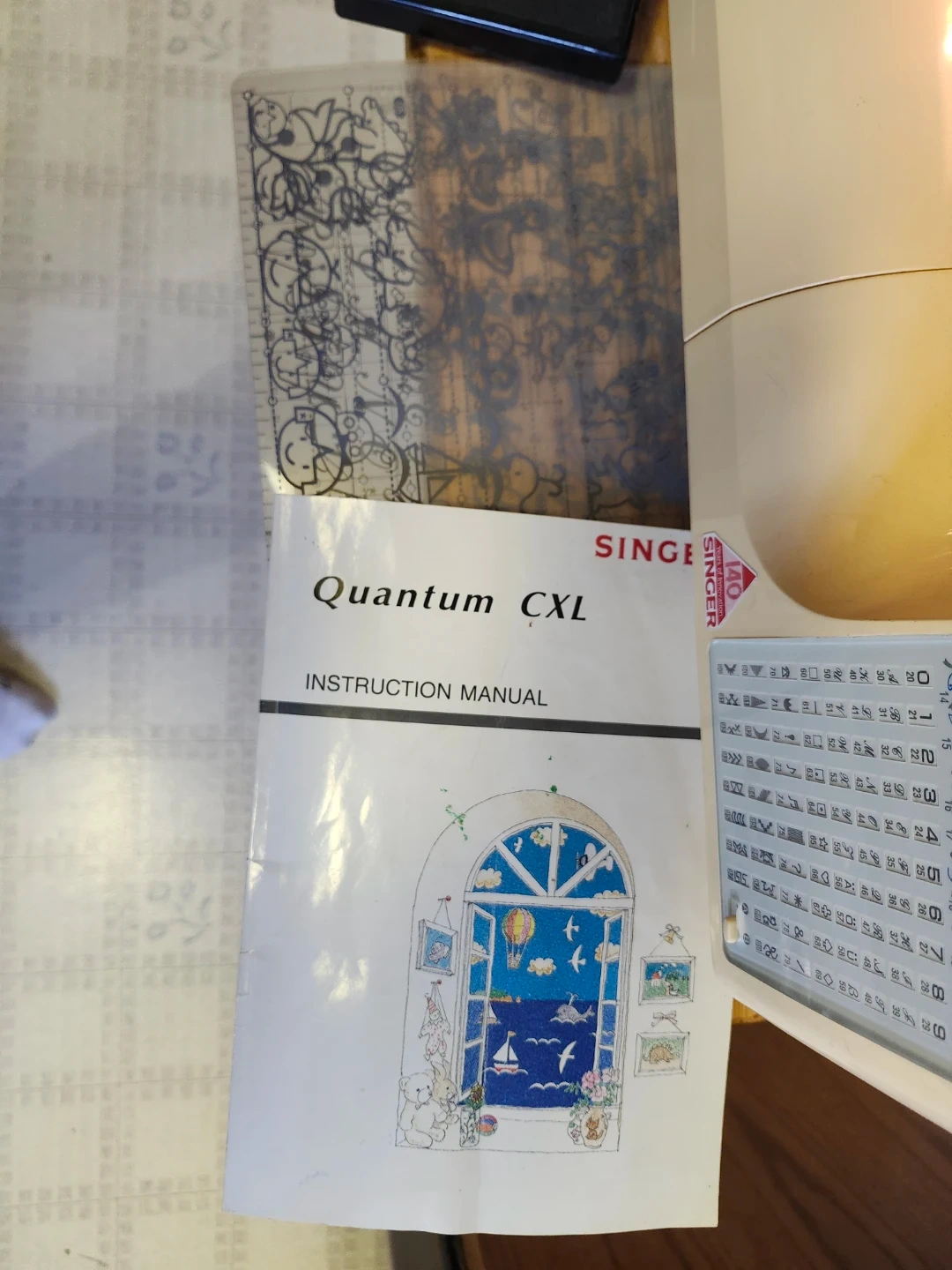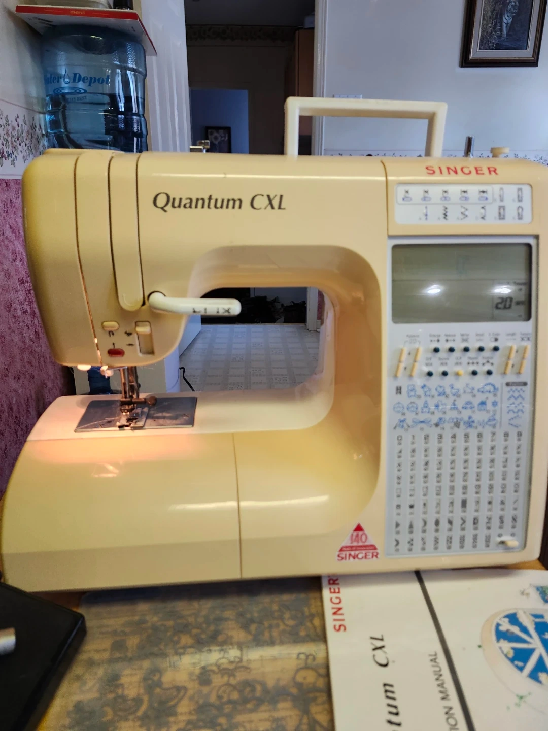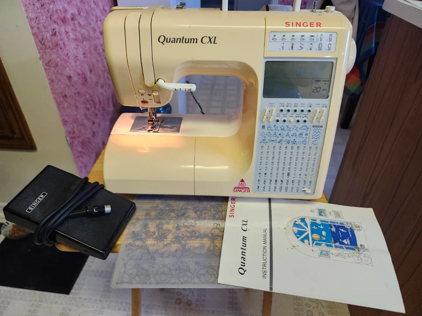 This is a Singer Quantum CXL sewing machine. It comes with an instruction manual and foot pedal. It has various stitch patterns available for different sewing needs.