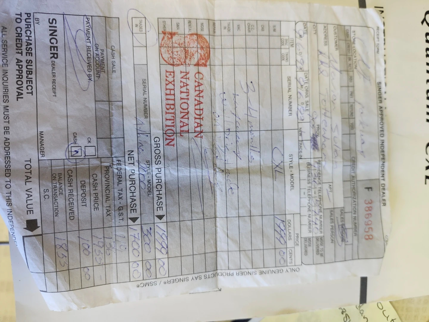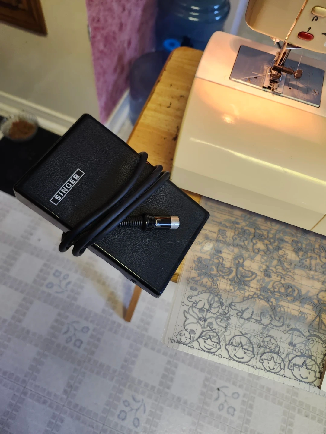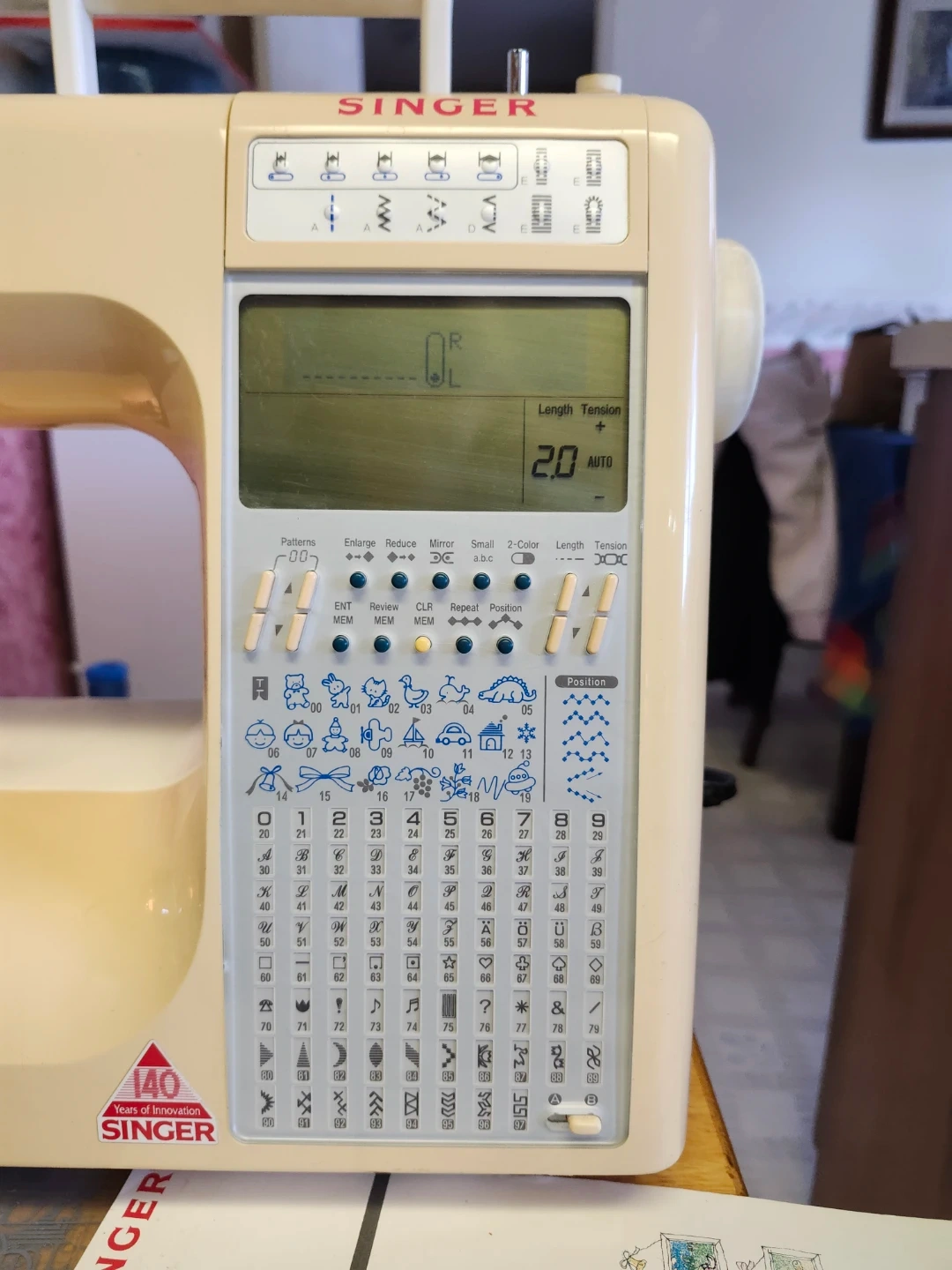 This is a Singer Quantum CXL sewing machine. It comes with an instruction manual and foot pedal. It has various stitch patterns available for different sewing needs.