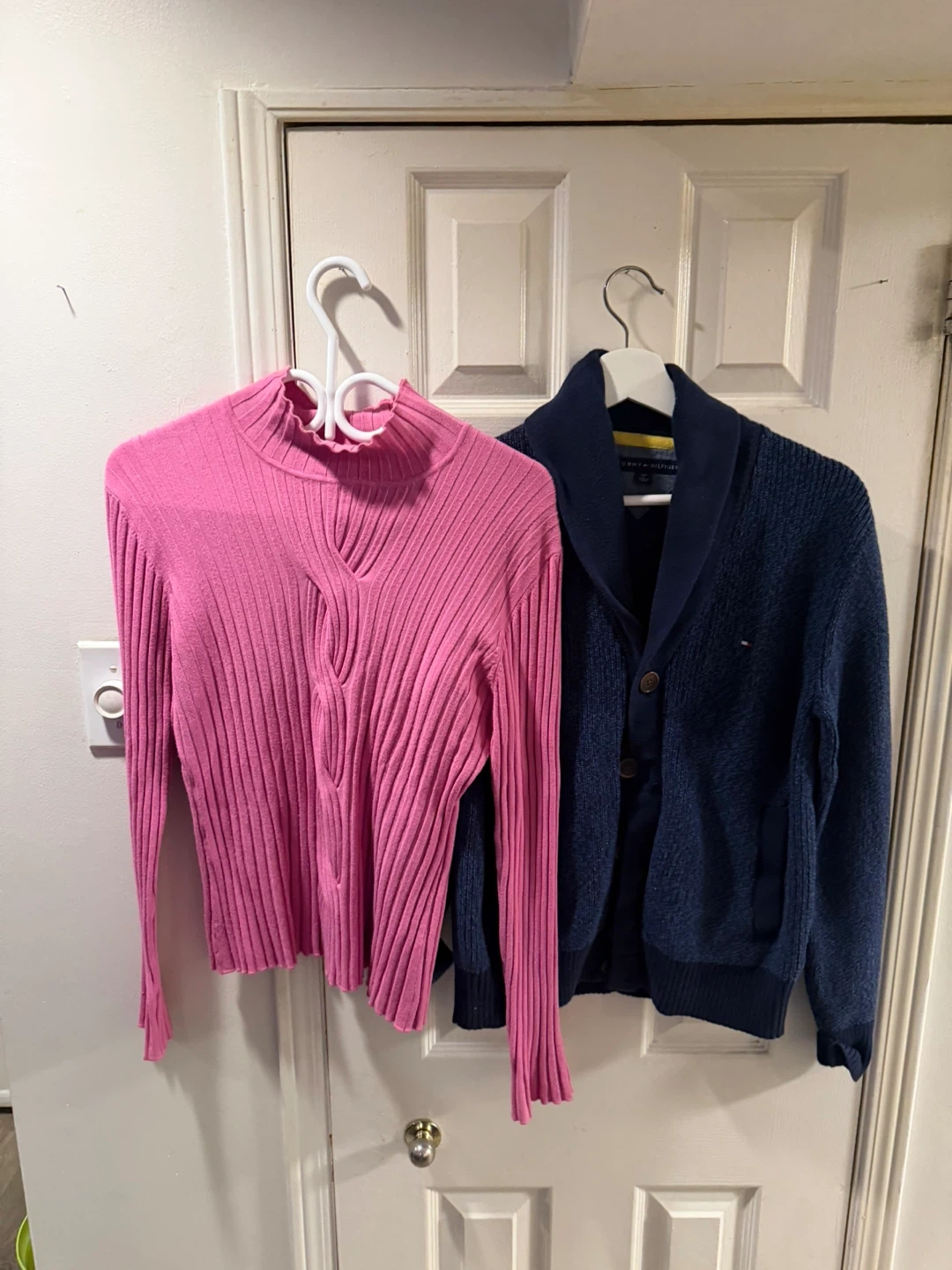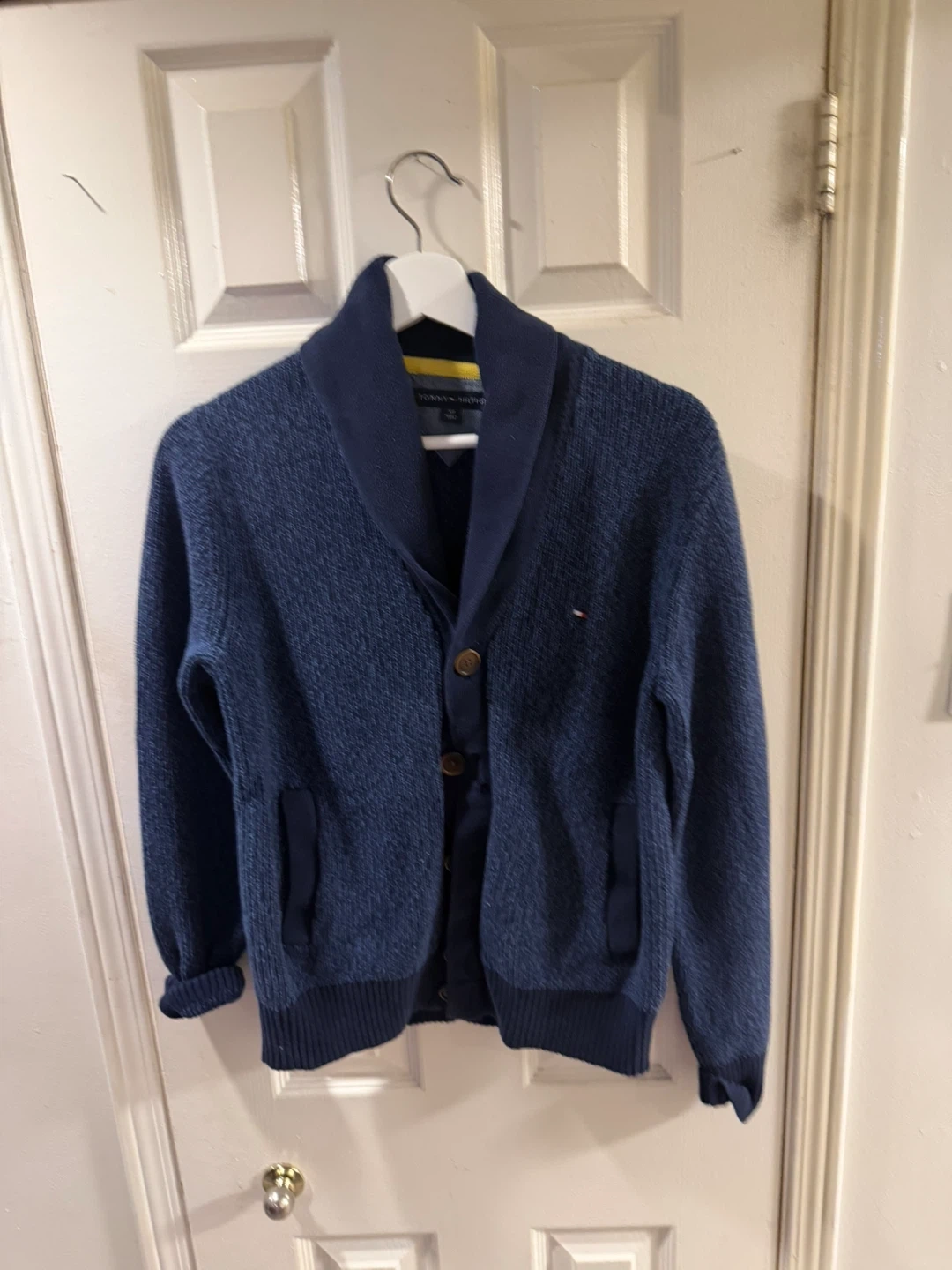 This is a Tommy Hilfiger men's blue knit cardigan sweater. It features a shawl collar, button closure, and two front pockets. This sweater is perfect for layering during cooler weather.