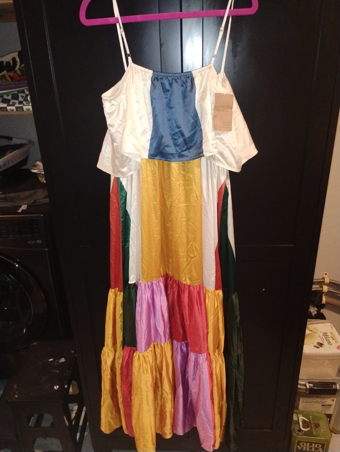 Selling a fun and vibrant tiered maxi dress! This dress features a colorful design with various tiers of different colors. It has thin straps and a flowy fit, perfect for a casual summer day or a special occasion, never worn