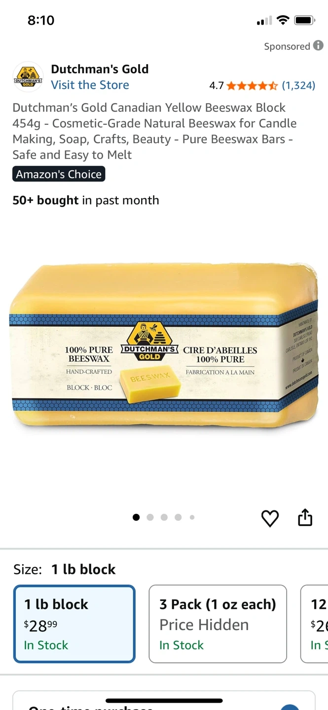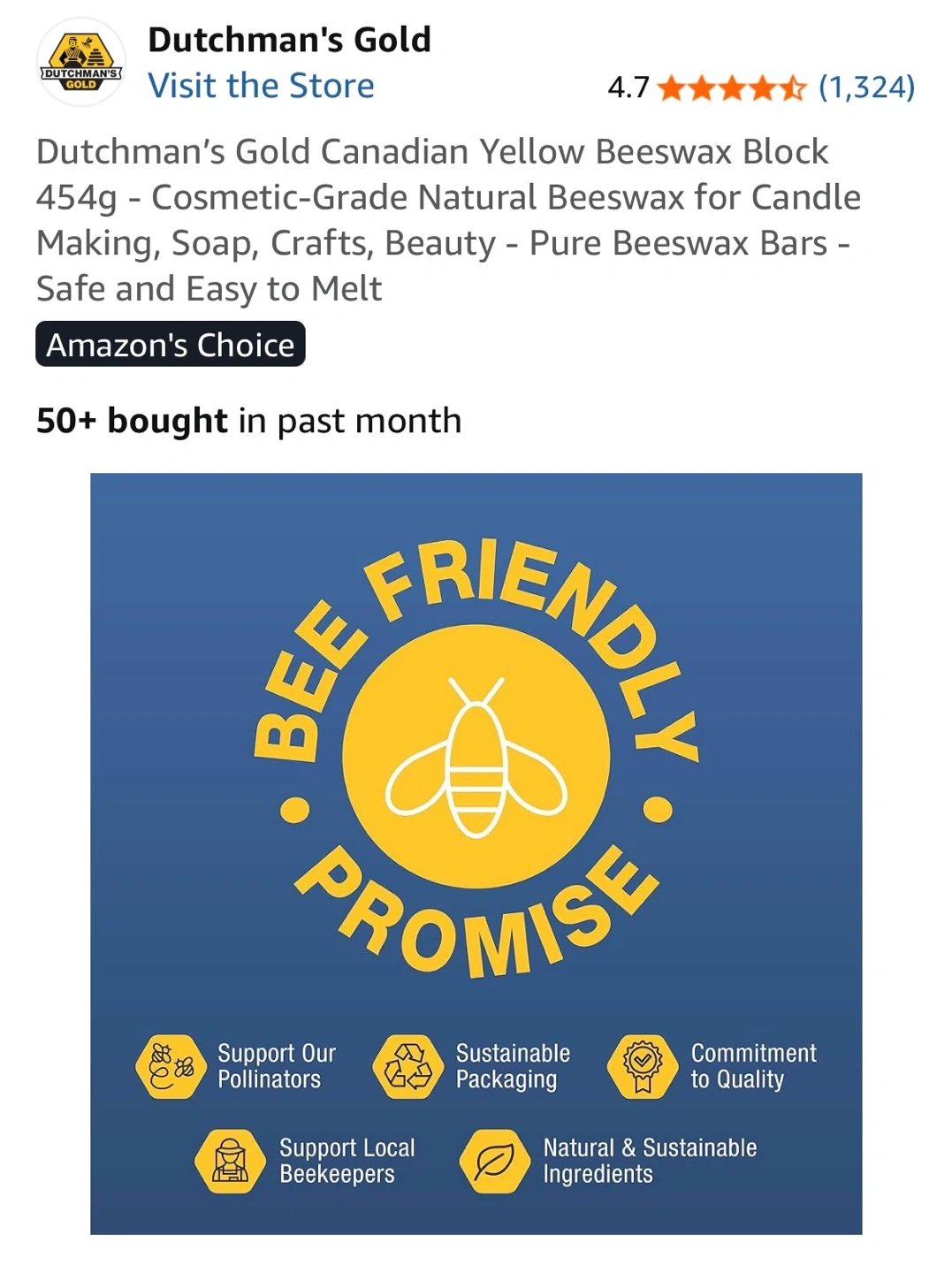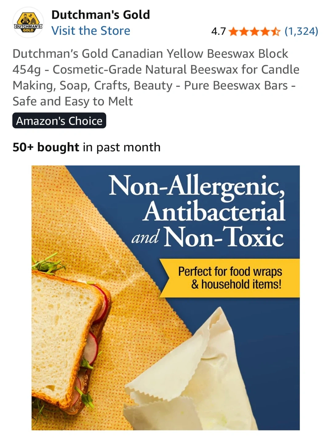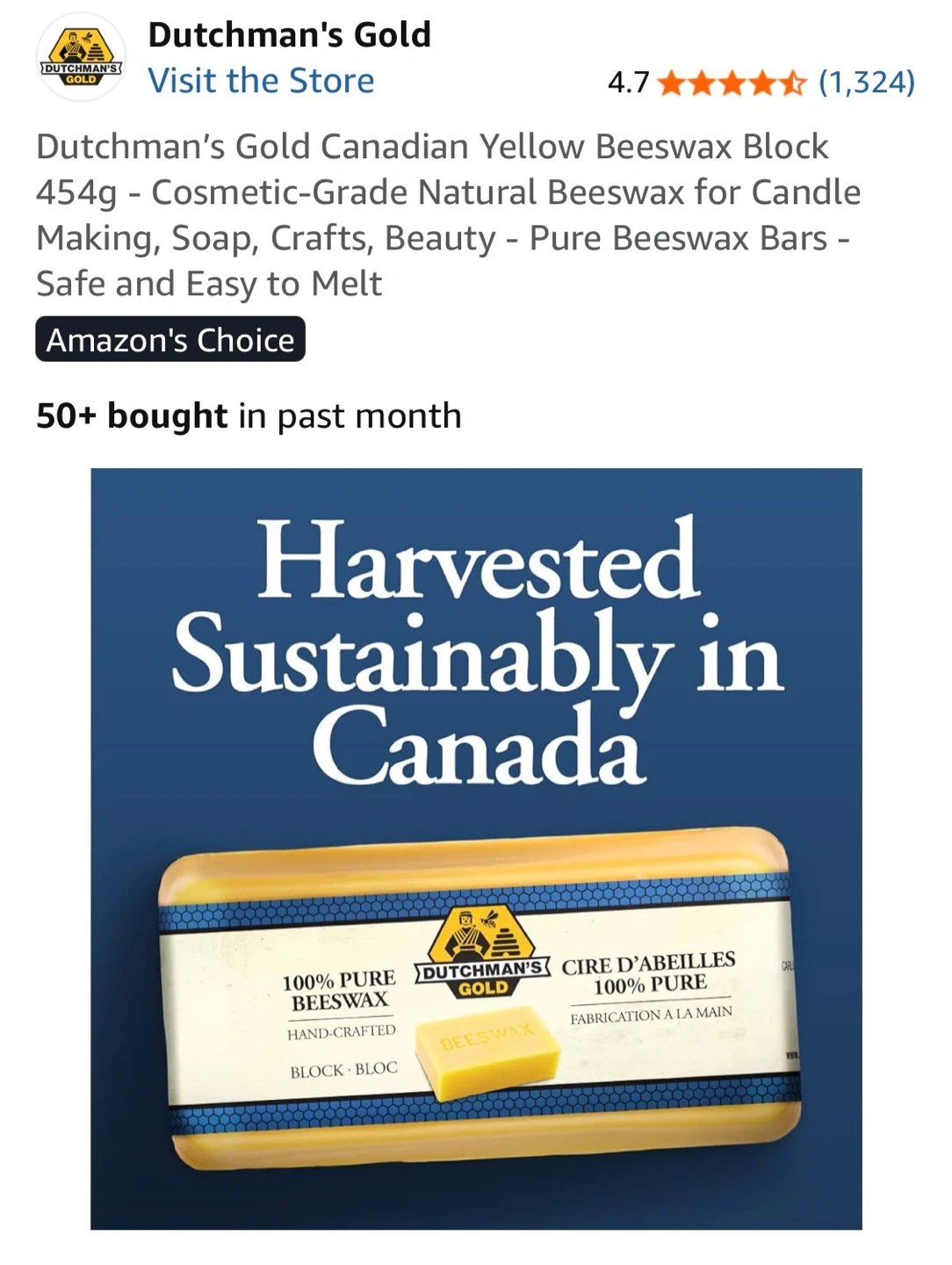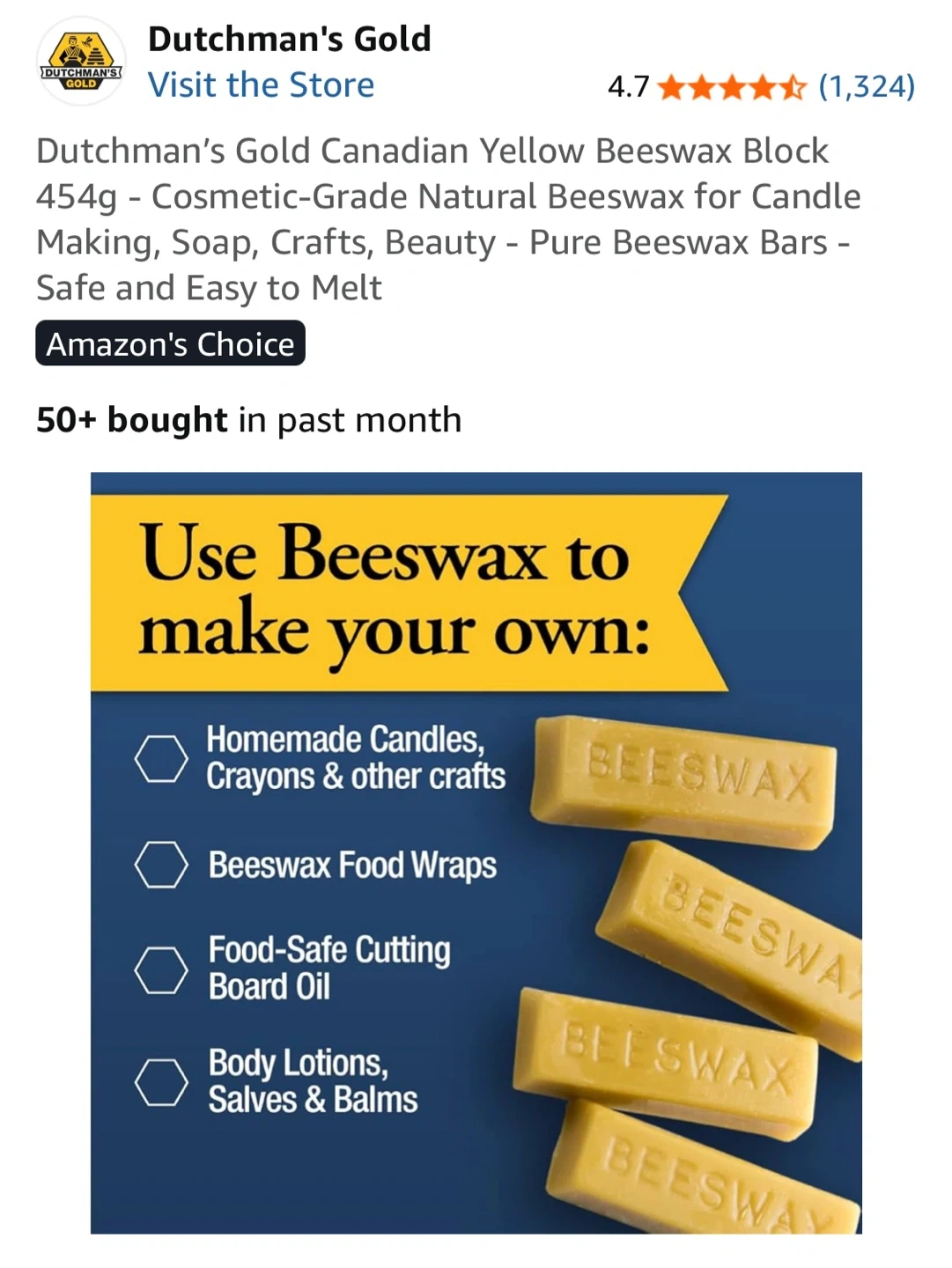 👉🏻Cash only. Msg to schedule pickup, thx 👉🏻First come first serve 👉🏻Near Queen St West and Niagara St 👉🏻Bundle for a discount! •1 lb block of Dutchman's Gold Canadian Yellow Beeswax.New in package,sealed. •It's cosmetic-grade natural beeswax, perfect for candle making, soap, crafts, and beauty. •It's safe and easy to melt, making it great for homemade candles, beeswax food wraps, and body lotions. It's also non-allergenic, antibacterial, and non-toxic. •Smoke/pet free home•