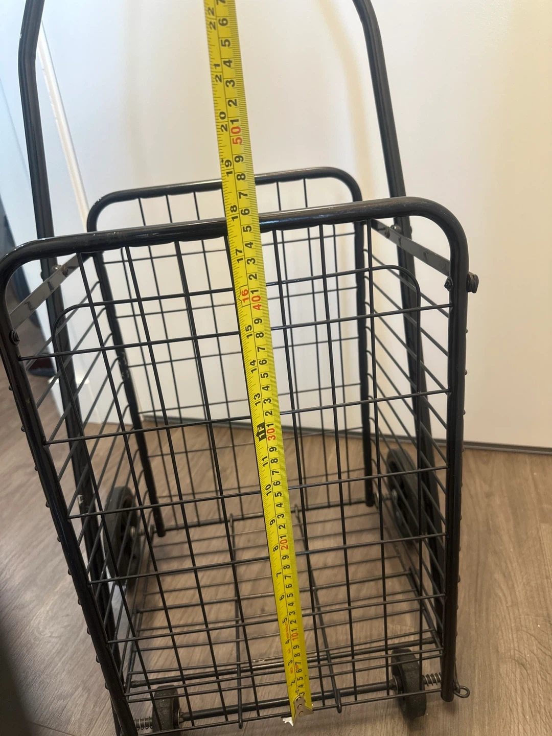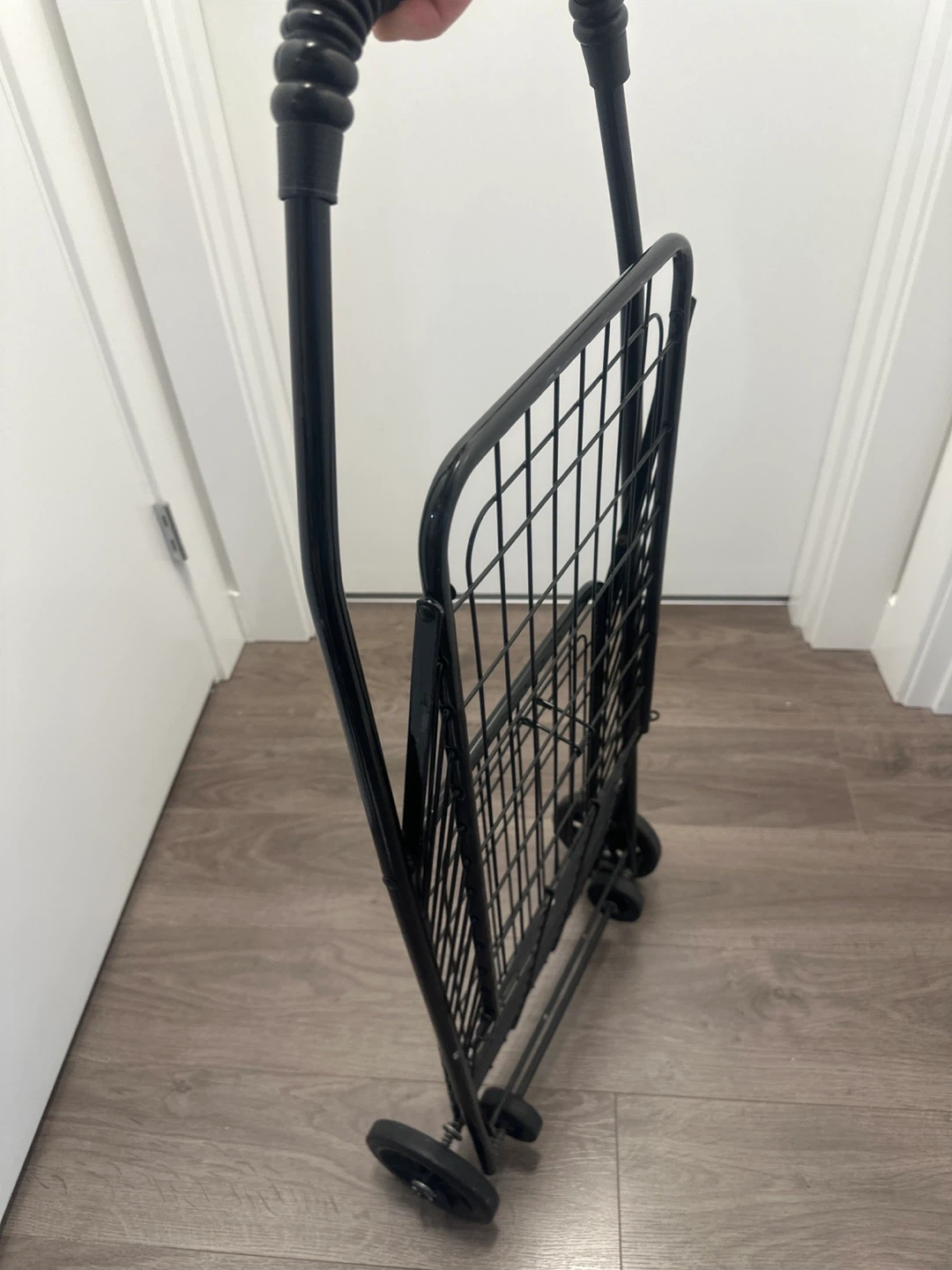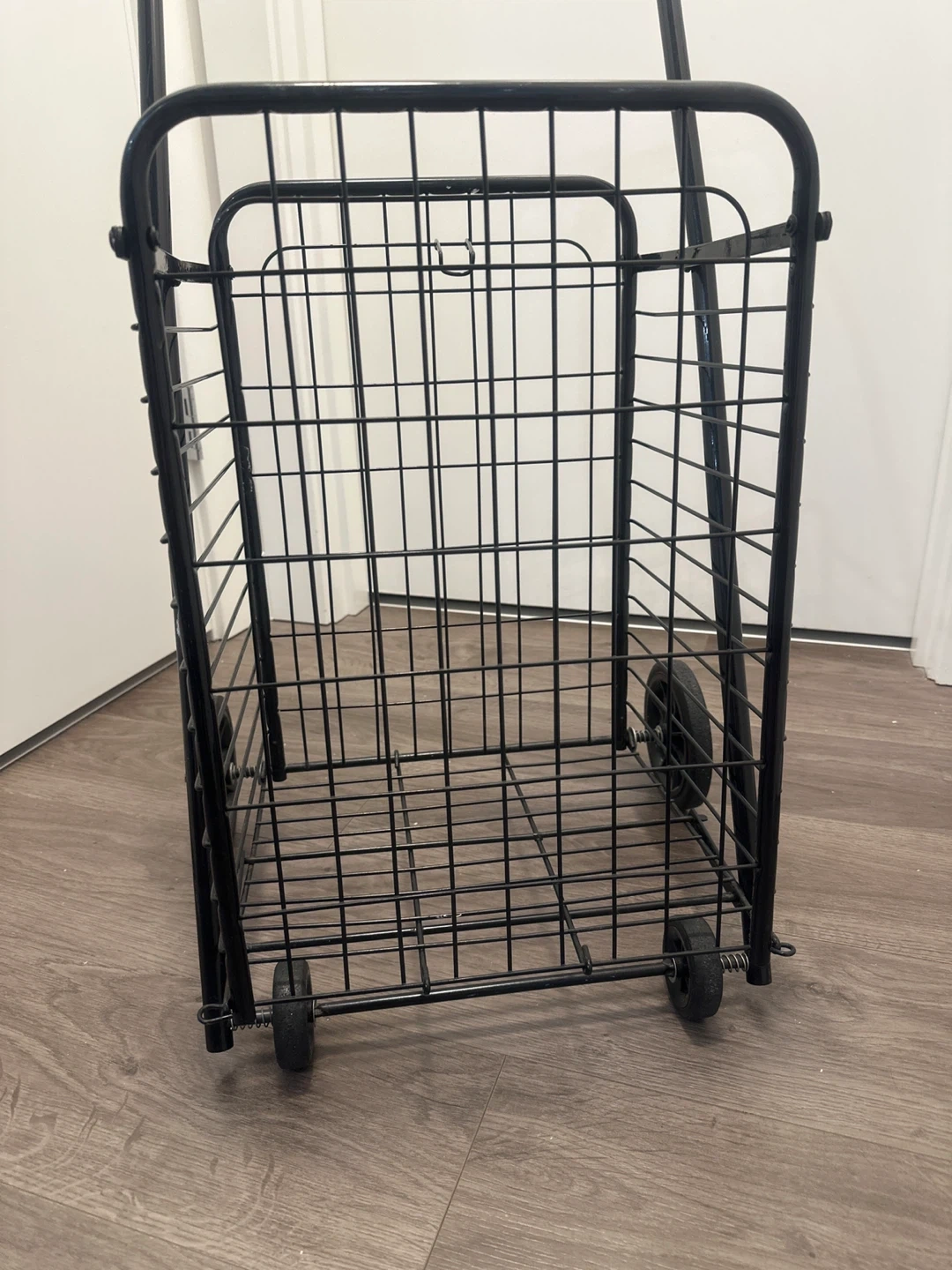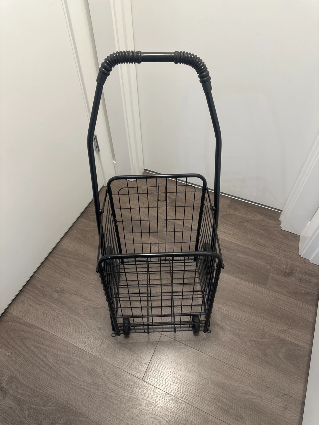 This black metal rolling shopping cart is handy for groceries or laundry. It's made of durable metal wire with a comfortable handle. Wheels make it easy to move around!