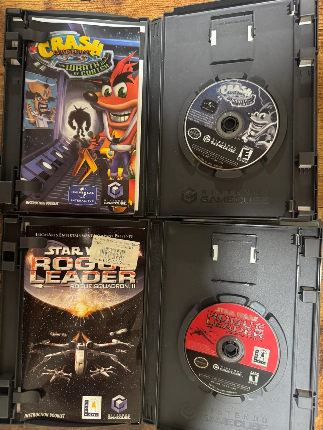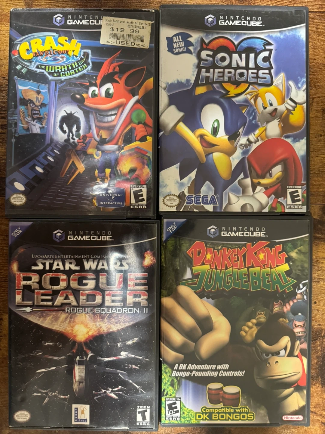 Ojo $40 cada uno. Four Nintendo GameCube games: Crash Bandicoot: The Wrath of Cortex, Sonic Heroes, Star Wars Rogue Leader: Rogue Squadron II, and Donkey Kong Jungle Beat. Includes instruction booklets for all games. Disc and case included for each title.