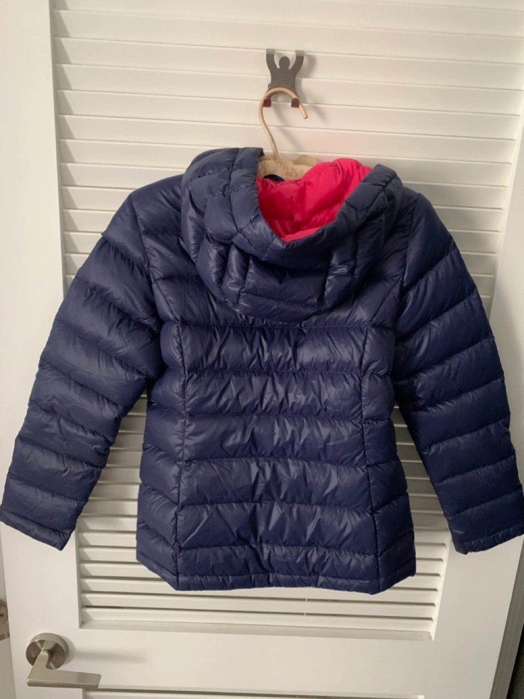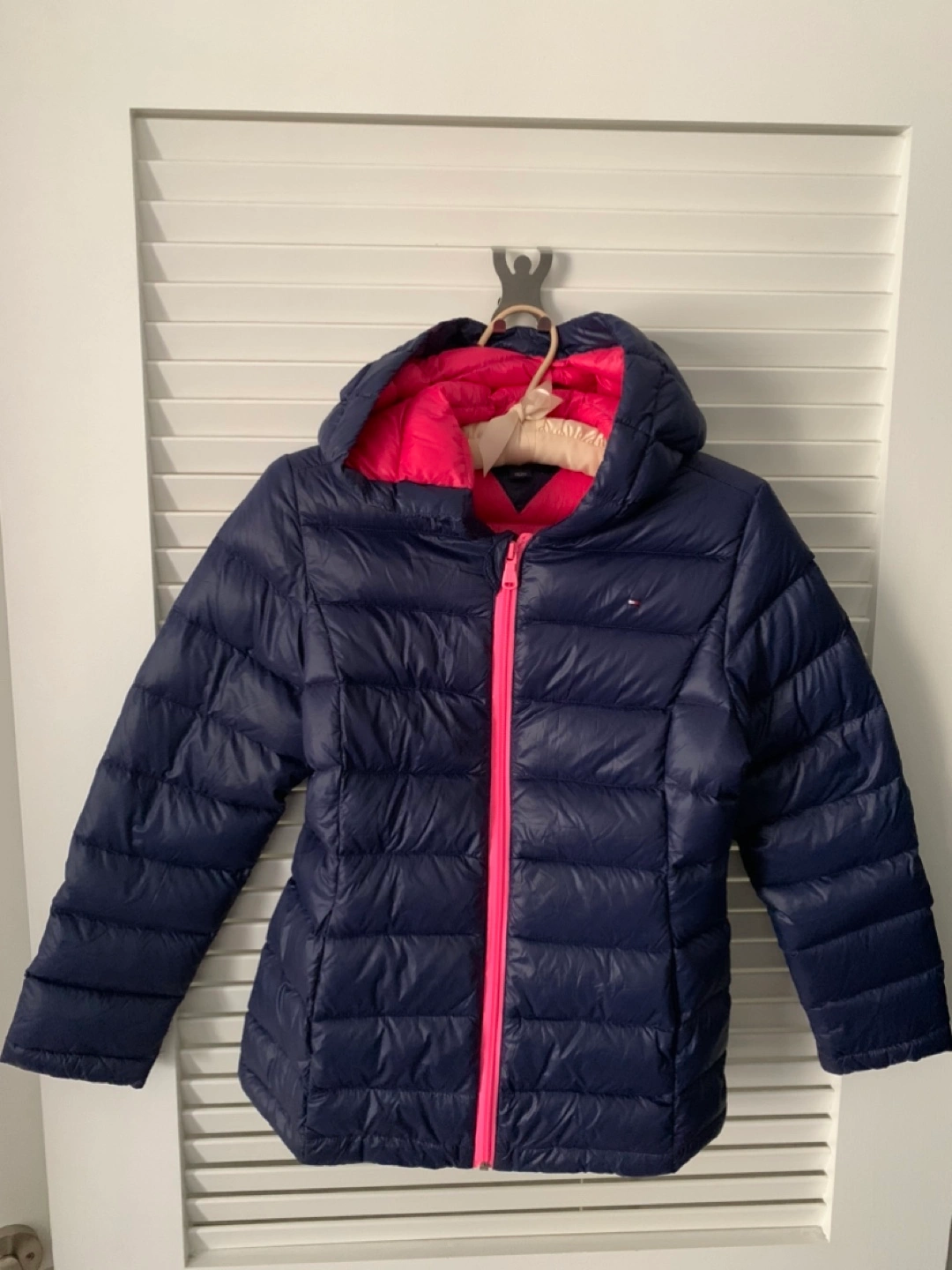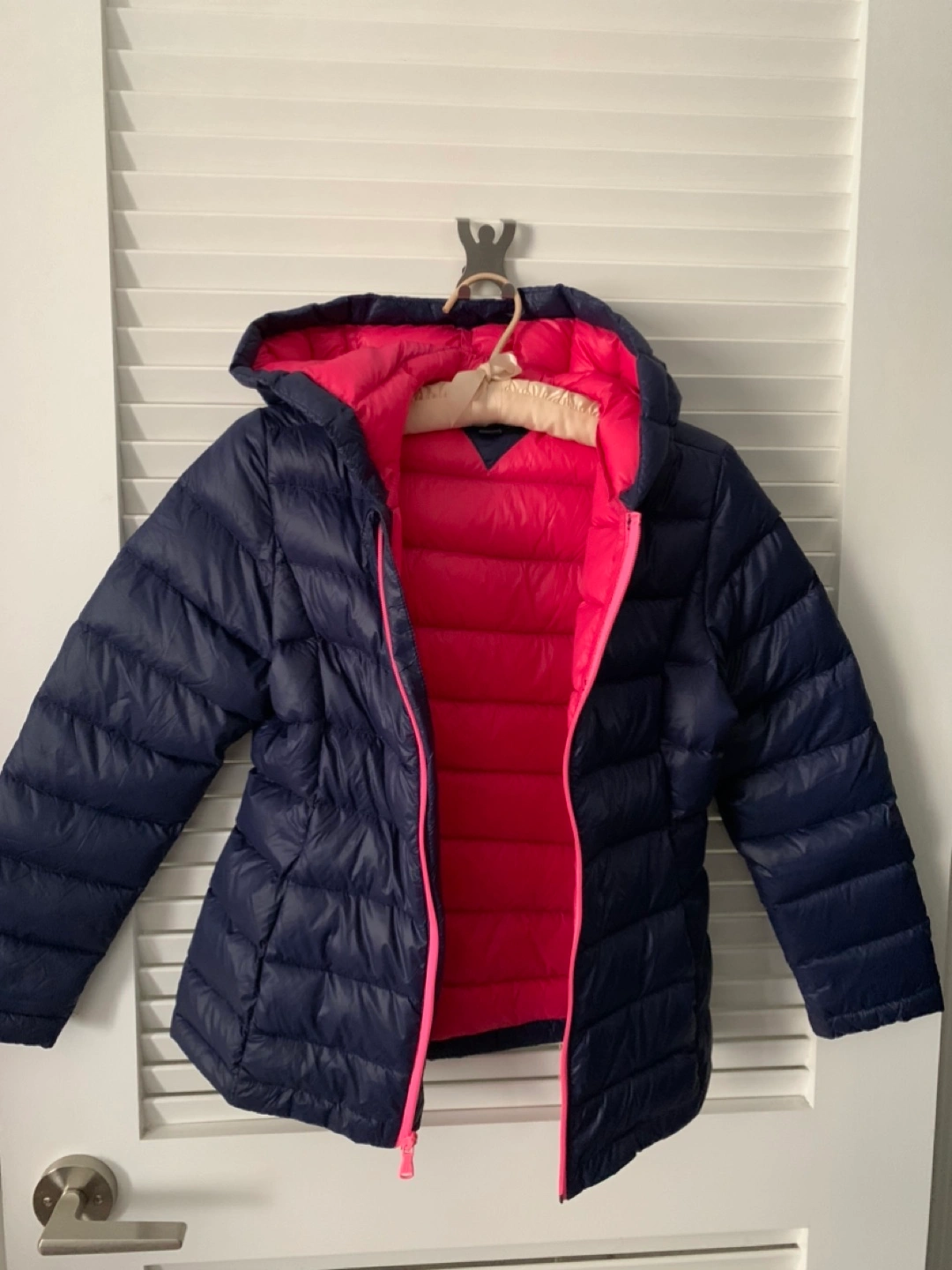 Navy blue puffer jacket with a pink zipper and pink inner. Very warm with 80% Down.