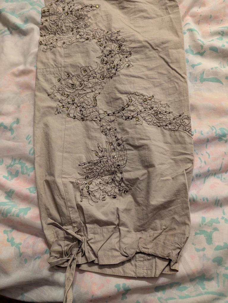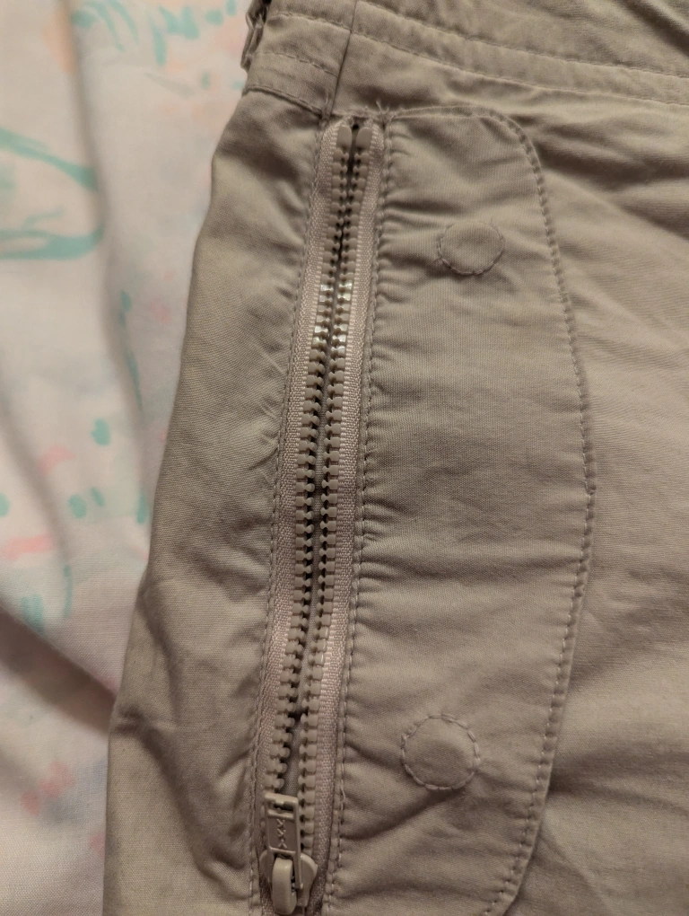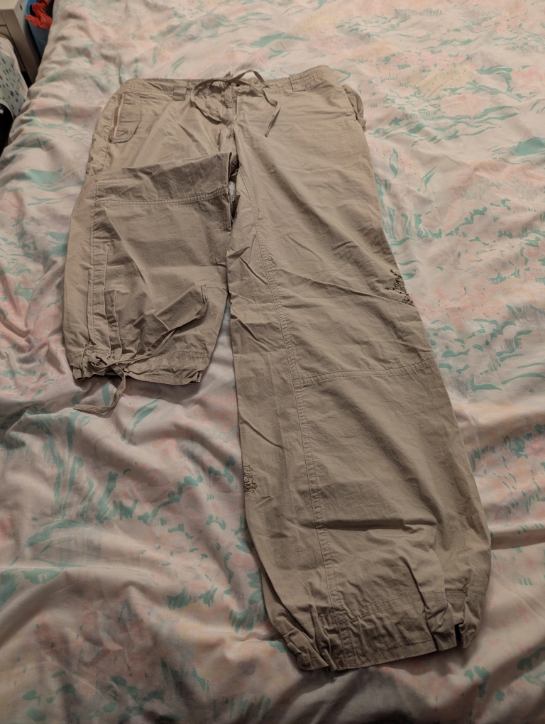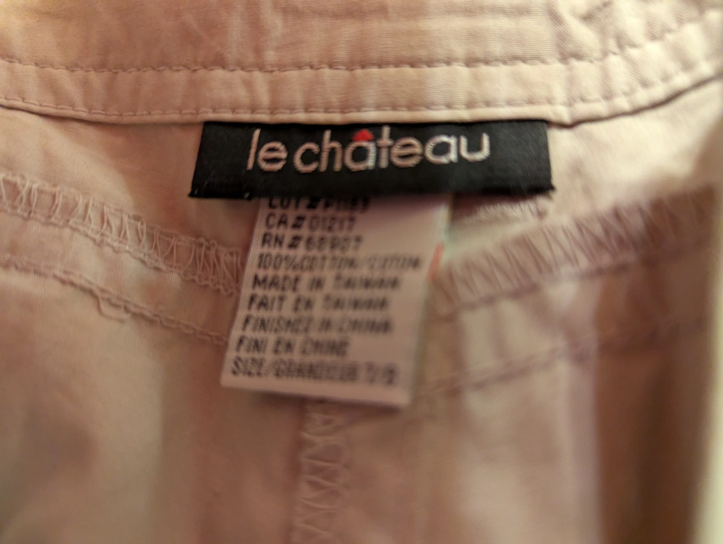 Selling a pair of Le Chateau pants in a neutral beige colour. They are made of 100% cotton and are sized 7/8. The lenght is 32 inches. These pants are low cut and relaxed fit and would be great for casual wear!
