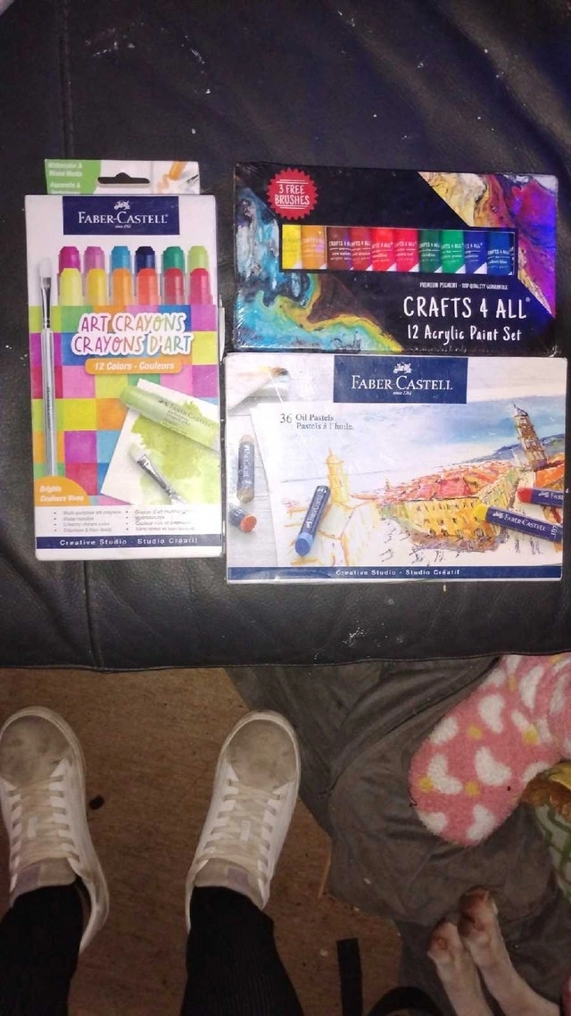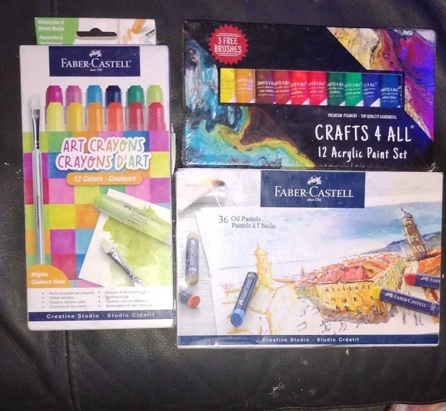 I'm selling a set of art supplies which includes Faber-Castell Watercolors and Mixed Media Art Crayons, Crafts 4 All Acrylic Paint Set, and Faber-Castell Oil Pastels. All items are in used condition, as seen in the photos. Unleash your inner artist with this collection of vibrant mediums! These paints and pastels are ready to add a splash of colour to your creations. If the ad is up, the item is available! Cash accepted.