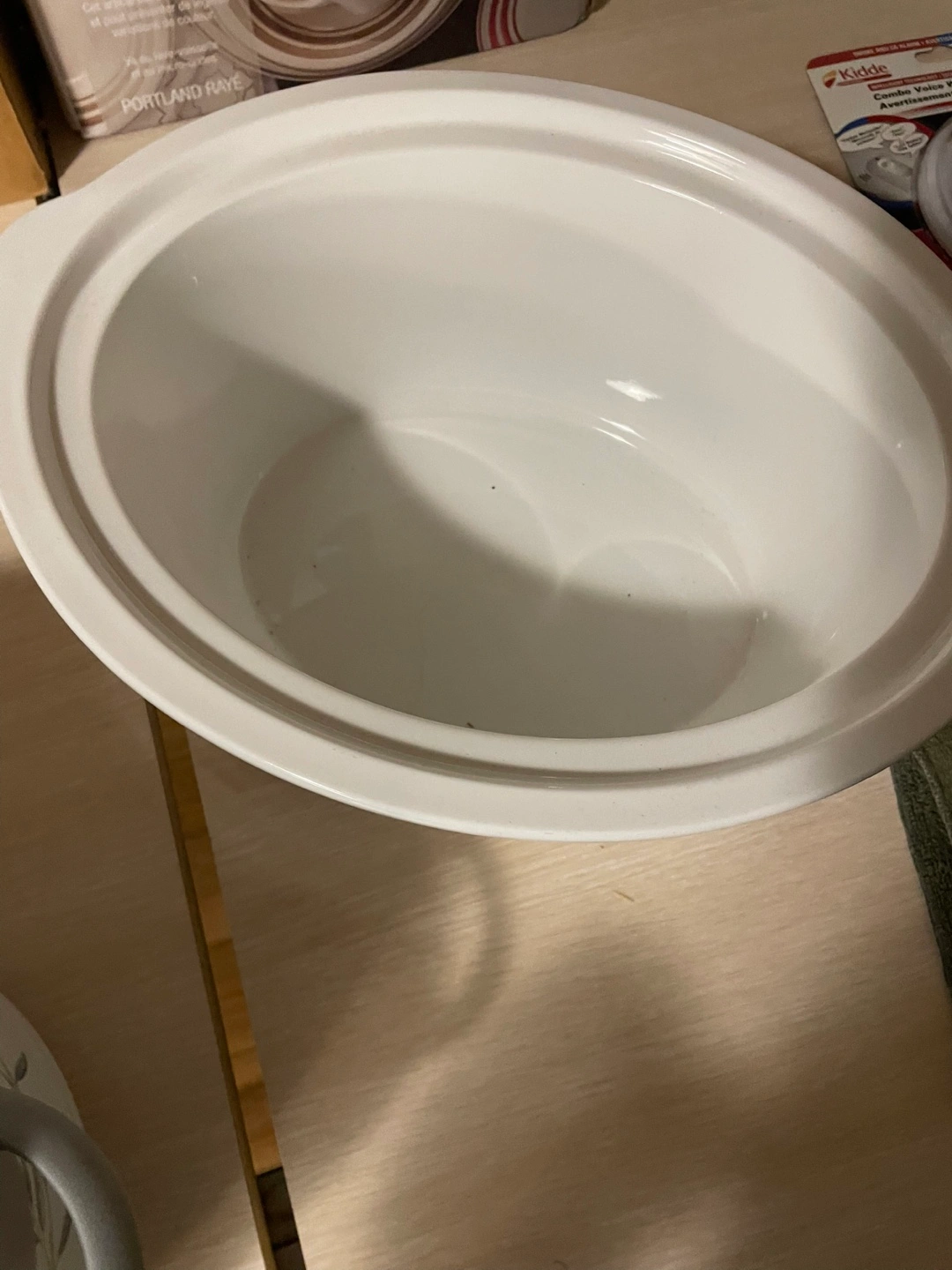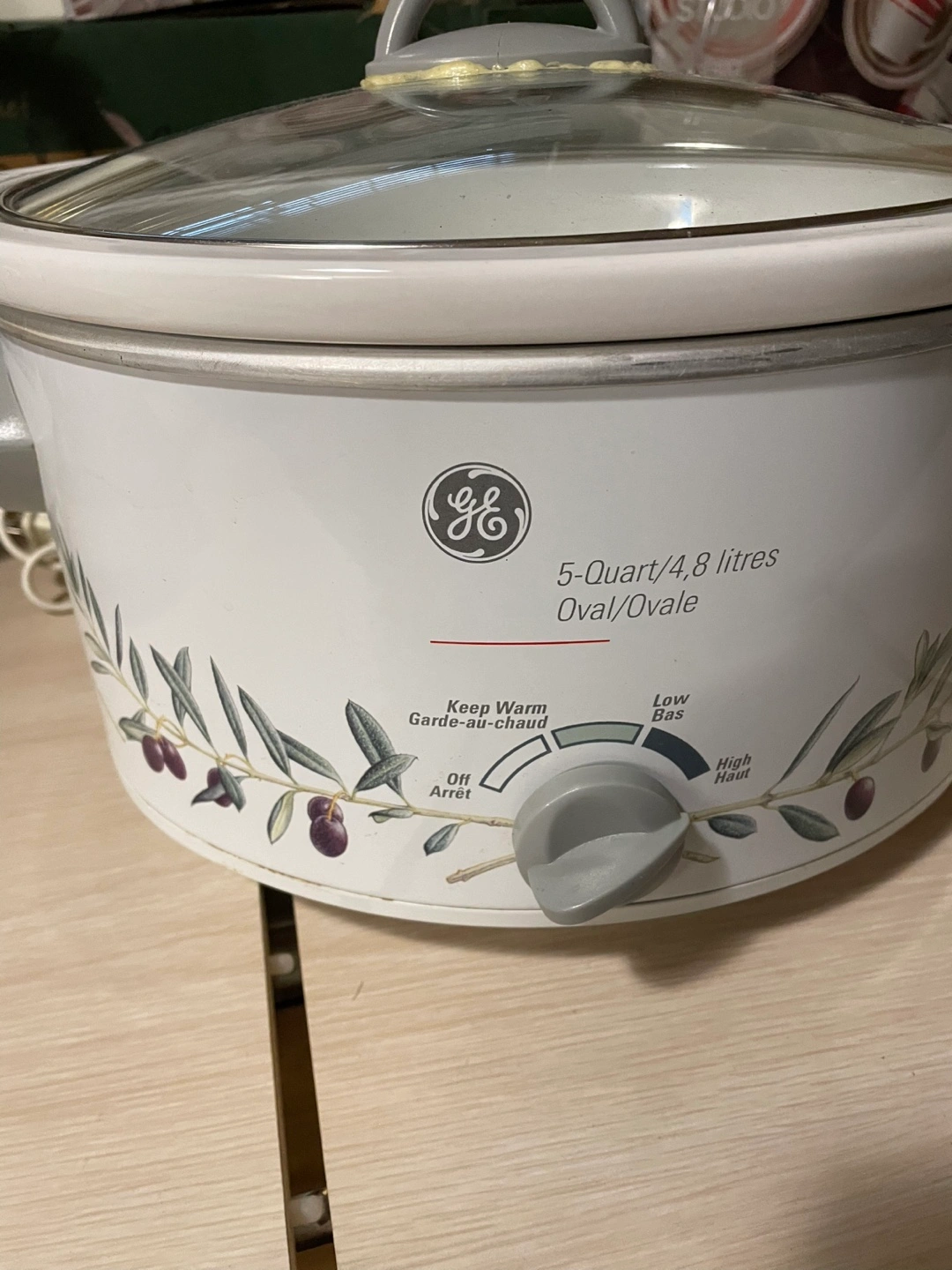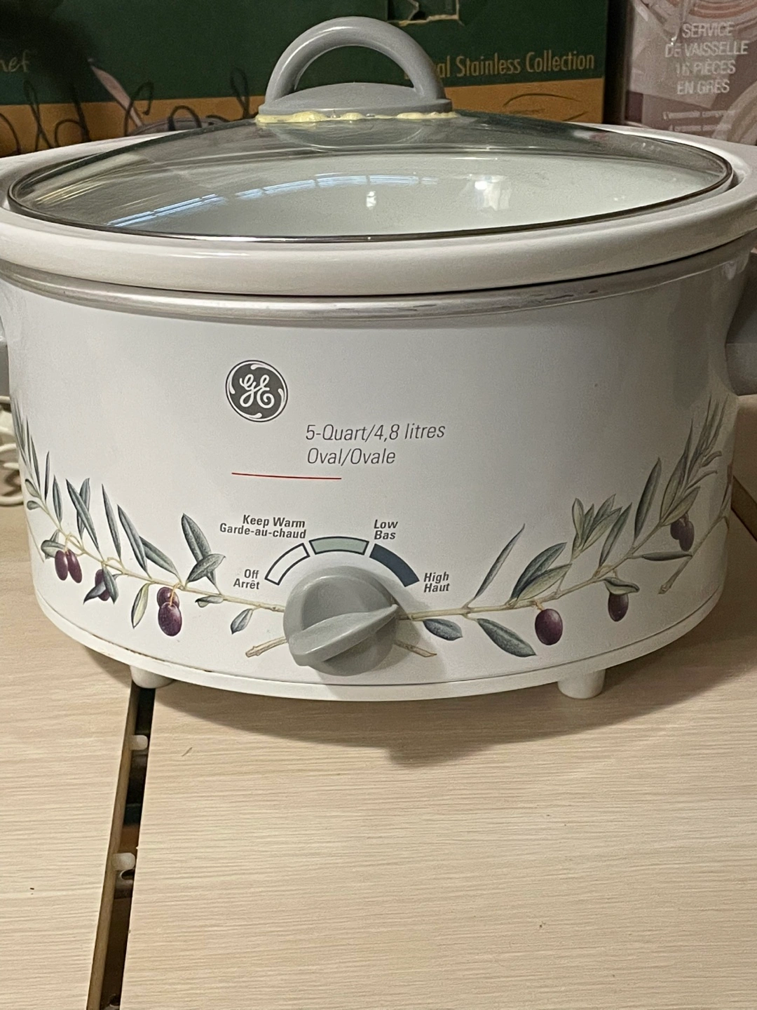 Selling a GE slow cooker! It's a 5-quart (4.8 litres) oval shape, perfect for family meals. The slow cooker features a "Keep Warm" setting, along with Low and High heat settings. It has a white exterior with a decorative olive branch design.