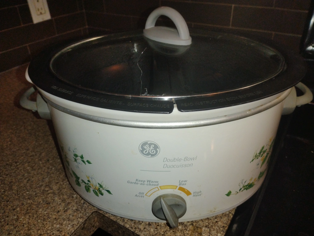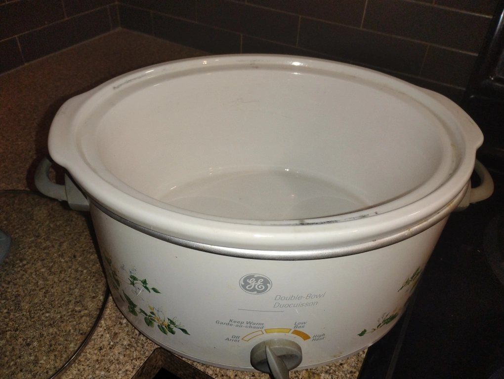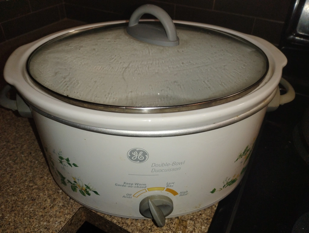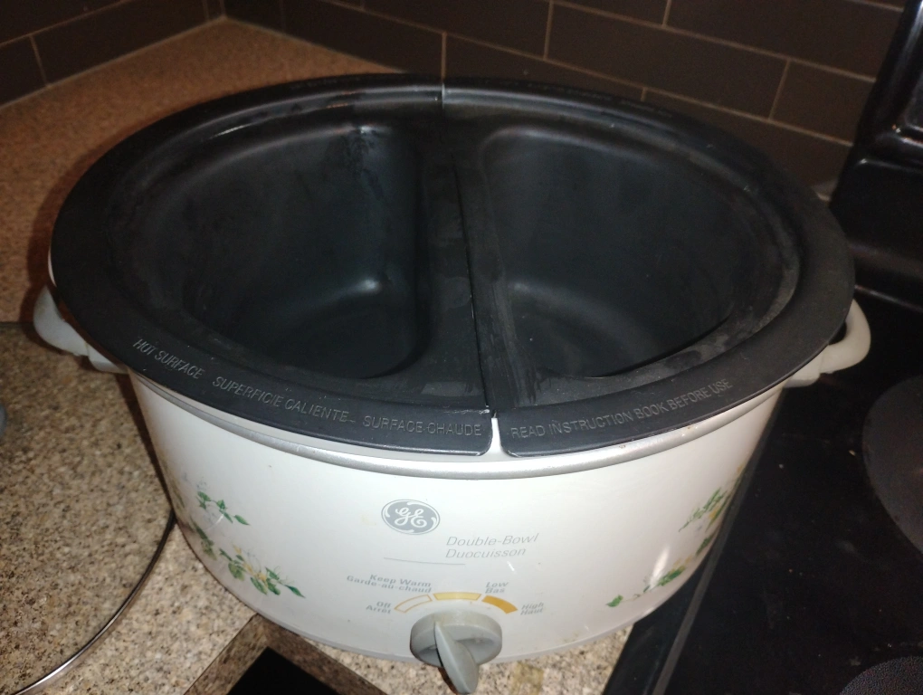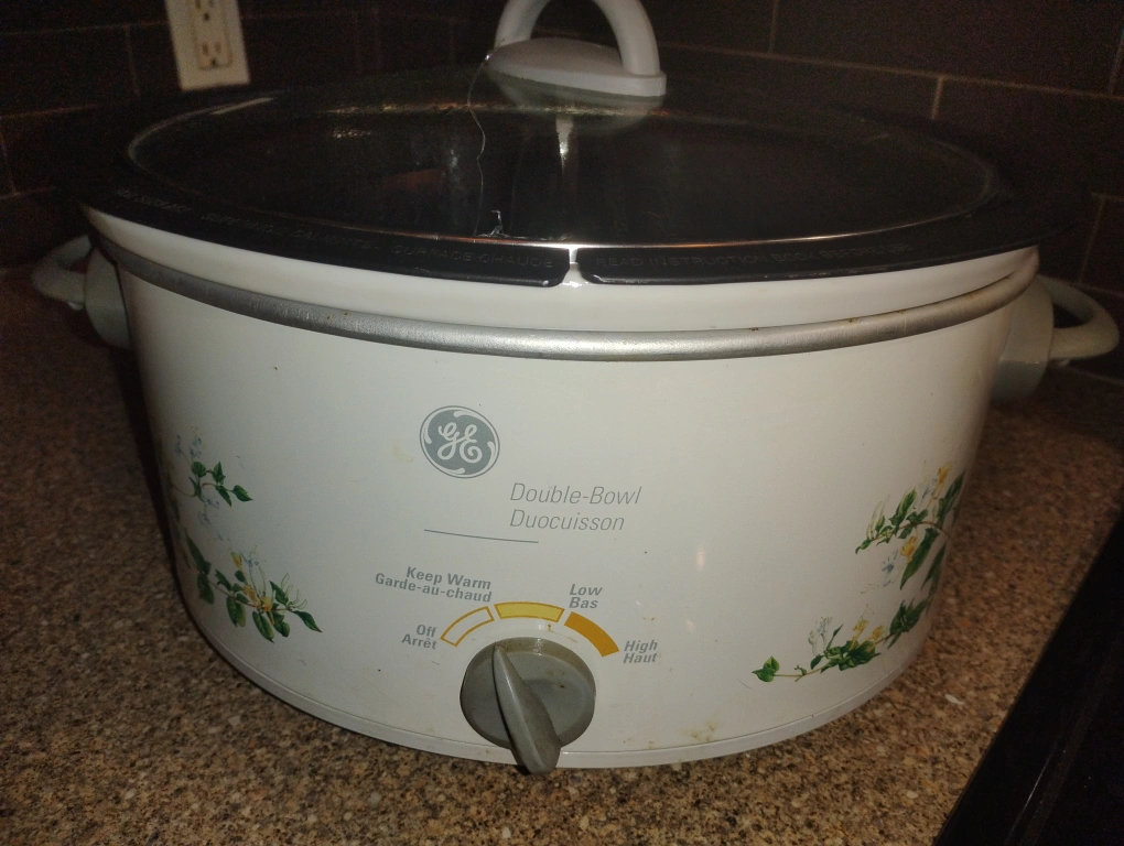 Selling a GE double-bowl slow cooker. It has a floral design on the front and a temperature control knob. The inside has two separate bowls for cooking different items at the same time. It also comes with a glass lid.