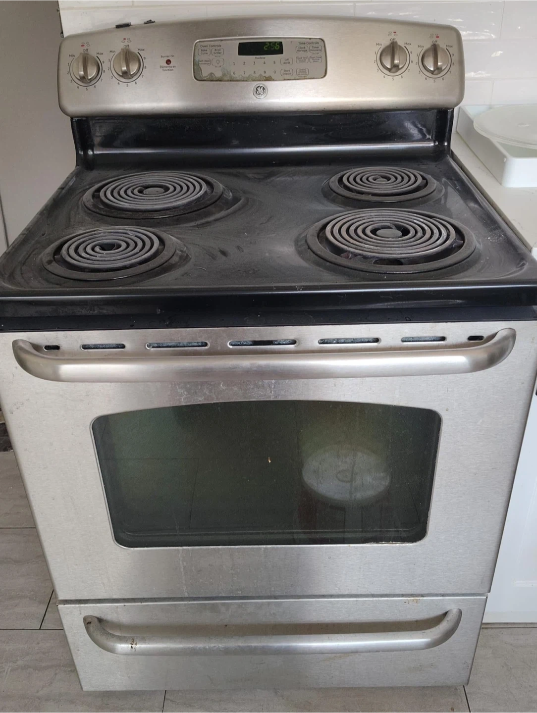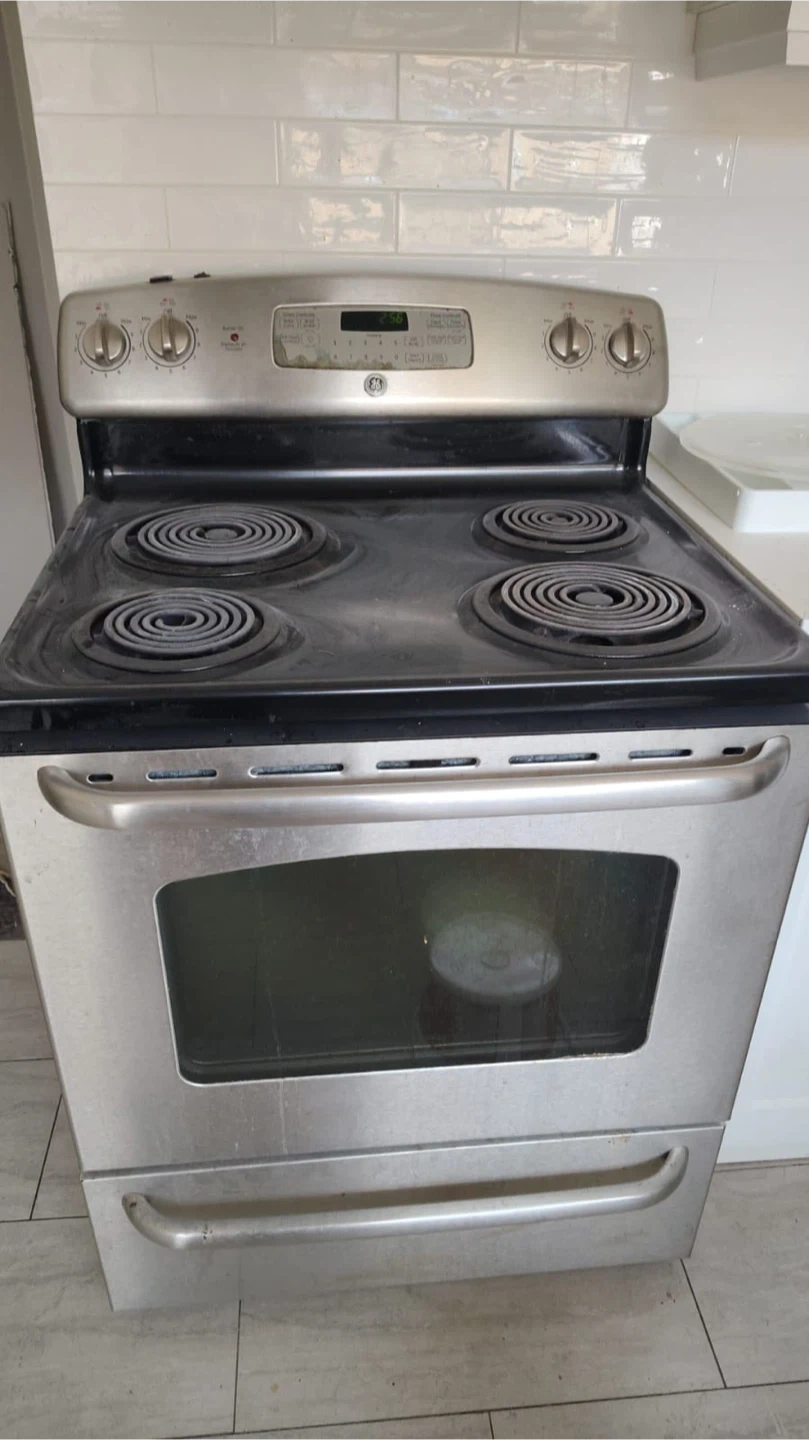 Reliable GE 30-inch electric range with 4 coil burners and a self-cleaning oven. • Finish: Stainless steel front with black cooktop • Oven: Large capacity, self-cleaning function, digital clock/timer • Cooktop: Four standard coil elements with drip bowls • Condition: Fully functional – normal cosmetic wear from regular use (see photos) • Includes: Lower storage drawer and original racks/trays Great for a rental unit, cottage, or anyone who prefers the durability of coil burners. Model/Serial info is shown in the photo of the side label for easy reference.