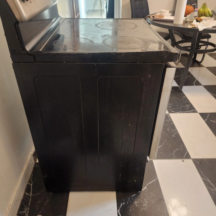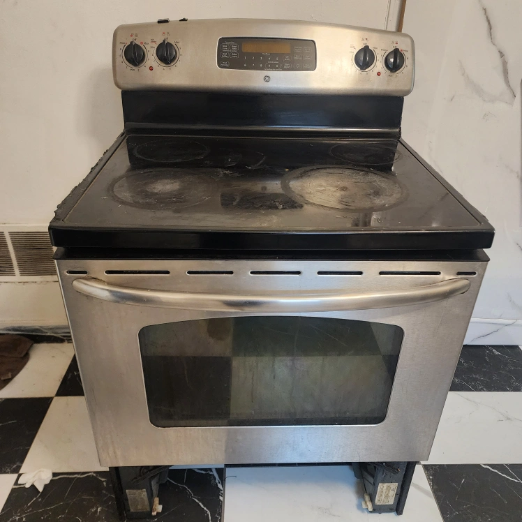 Selling a GE electric range in stainless steel. It has a glass top and the oven is self-cleaning. It's in used condition with some wear and tear on the cooktop and inside the oven. Still works great!