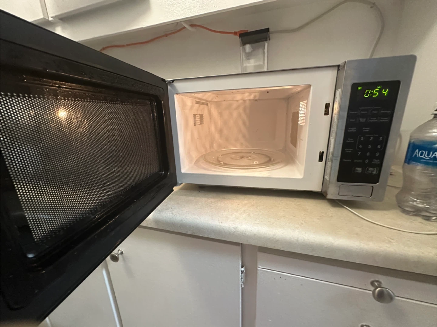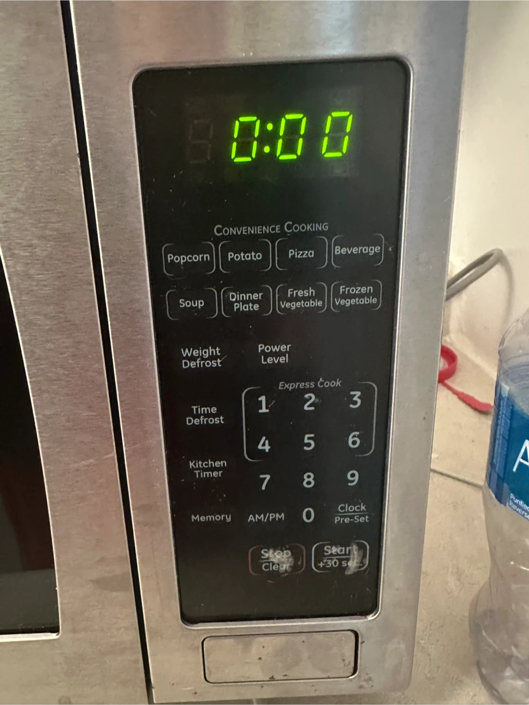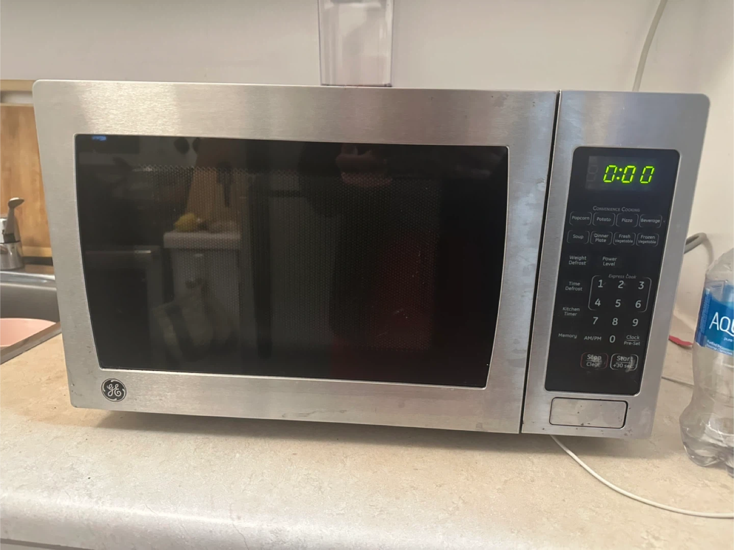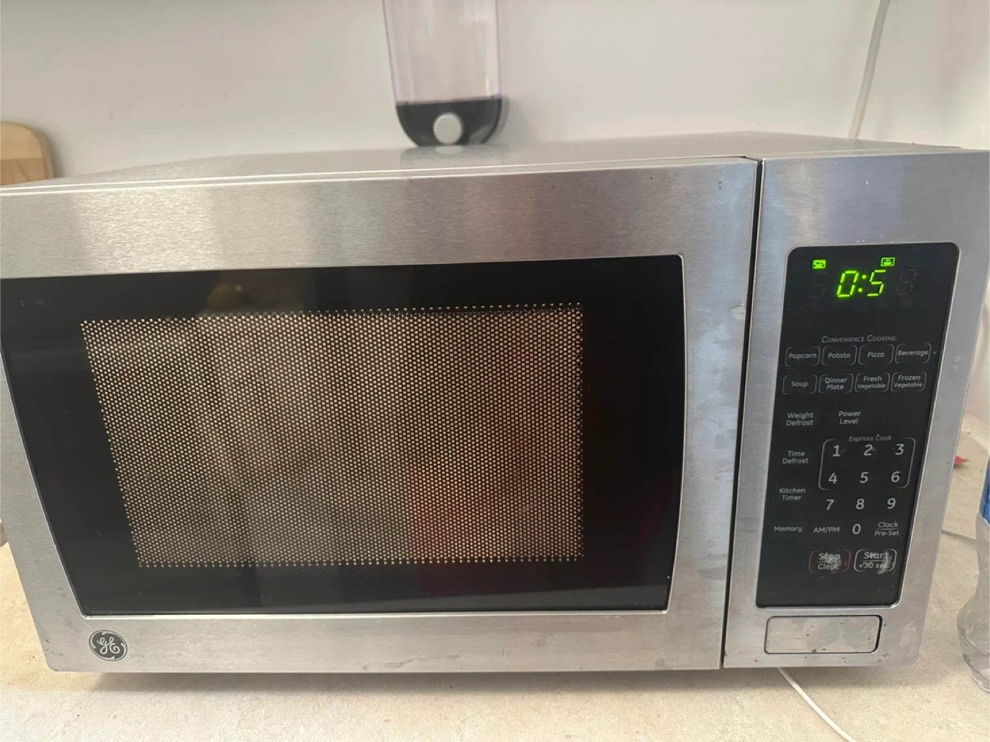 Selling a GE microwave in silver colour. It has convenience cooking options like popcorn, potato, pizza, and beverage. Also has options for soup, dinner plate, fresh vegetable, and frozen vegetable. It also has options for weight defrost and power level