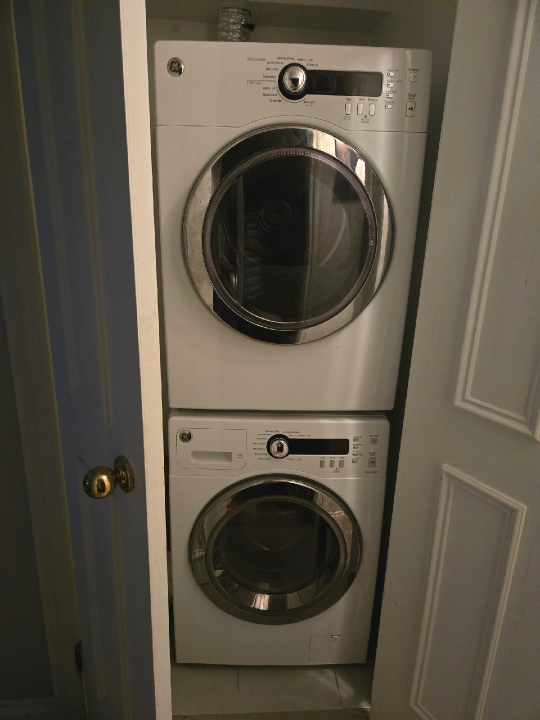 For free, a GE stackable washer and dryer. It's in good working condition and ready for a new home! It has features like a sensor dry and speed day option.Dryer is in working condition but washer needs repair .As I am not a handyman, you have to come, dismantle and take it away for free.