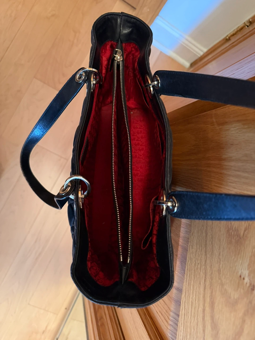 Christian Dior black bag with signature cannage quilting. Features a spacious interior with red lining and a zip-top middle compartment. Made from soft, quilted leather. pick-up only