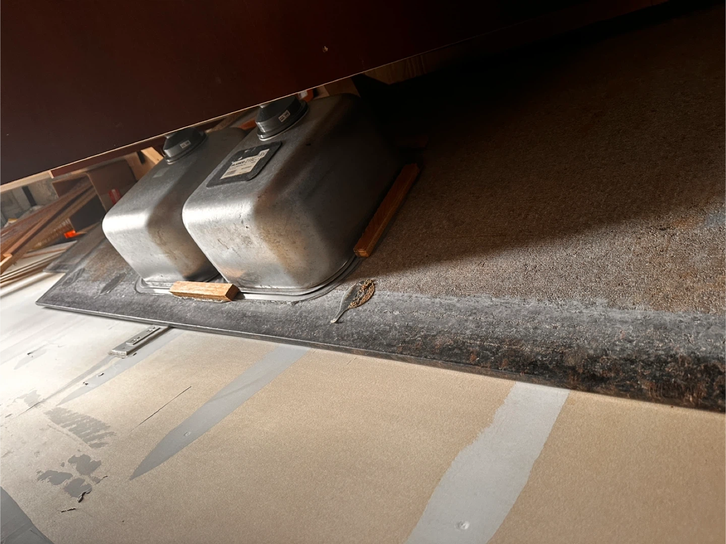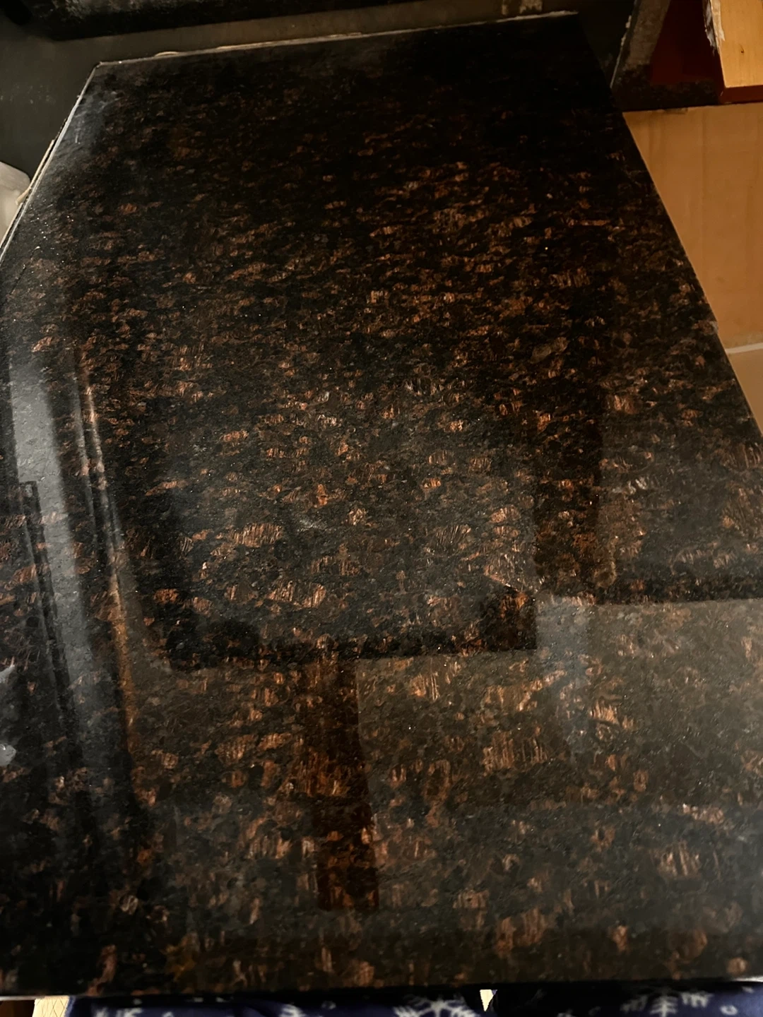 I'm selling a brown granite kitchen countertop with 2 sinks. It has a speckled pattern. It's in good condition and ready for a new home.