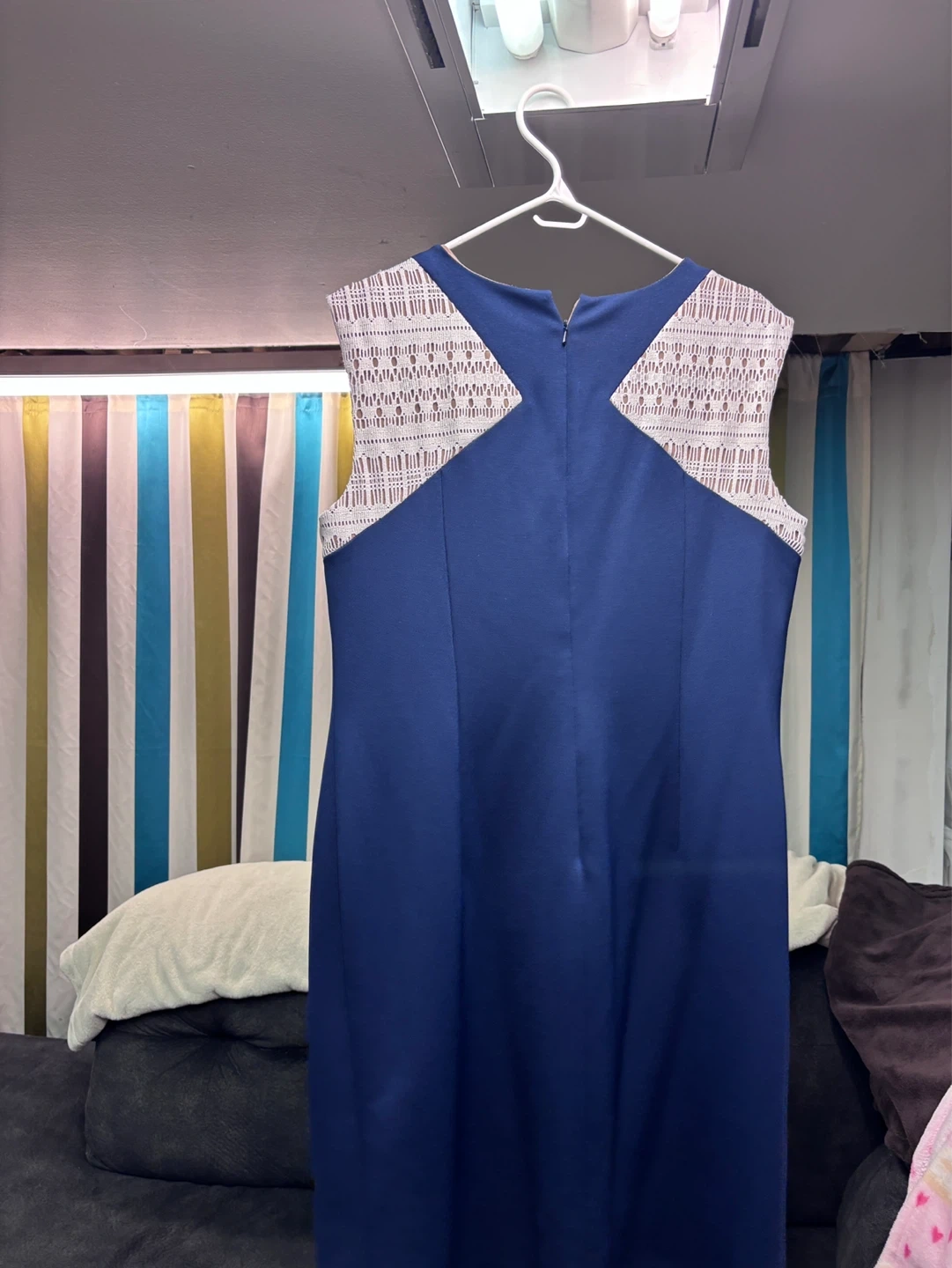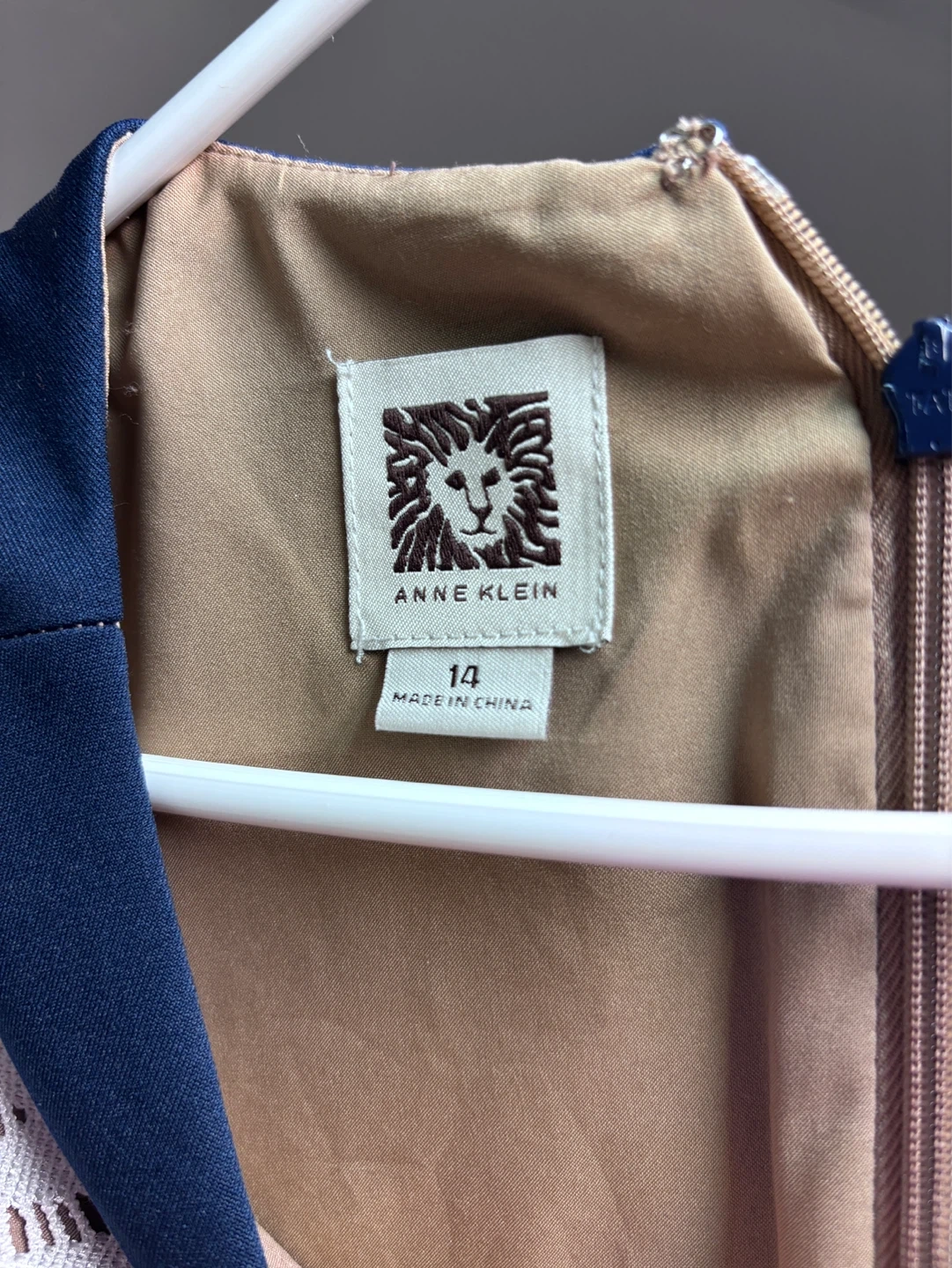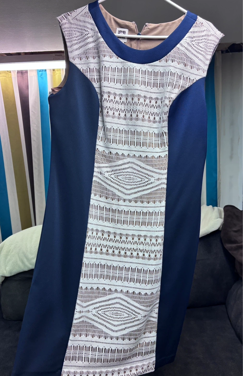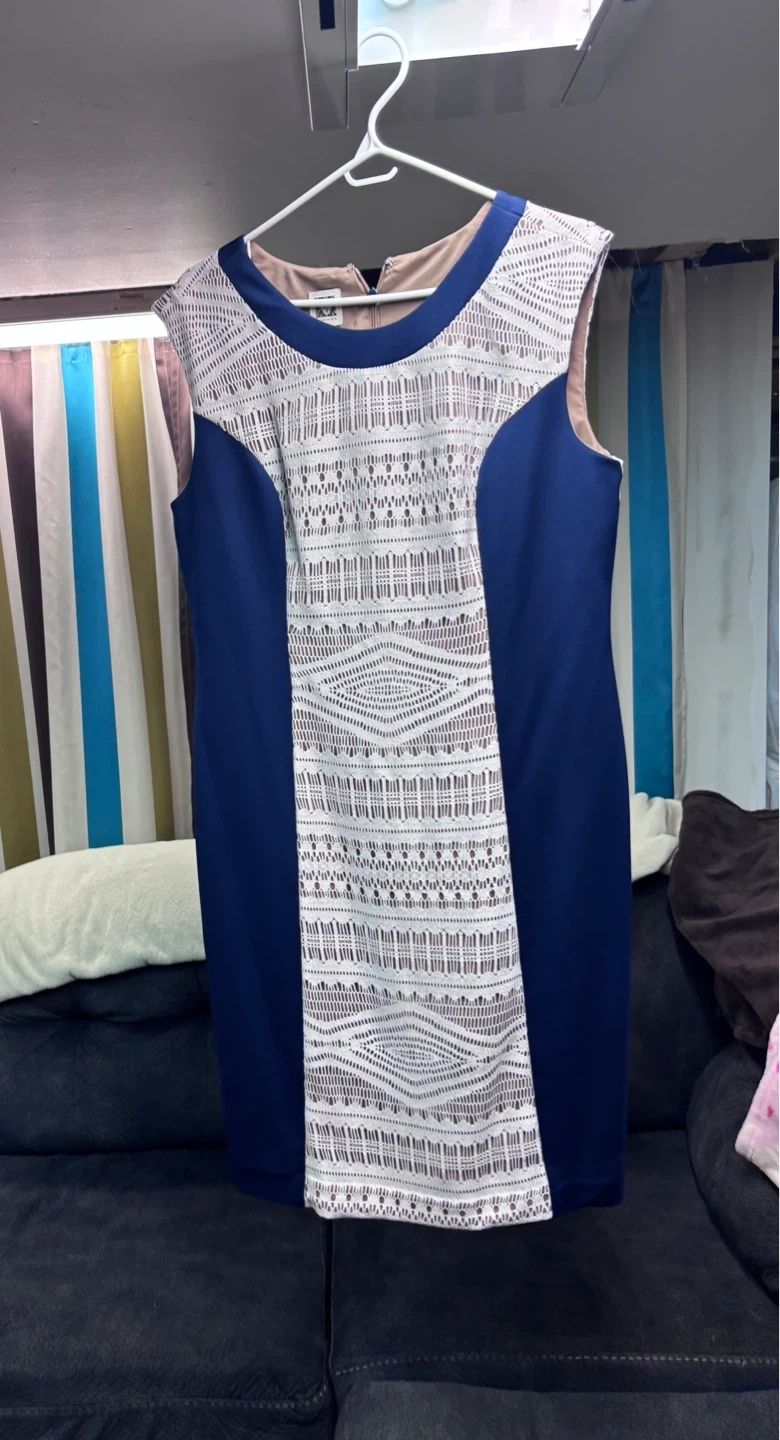 Navy blue sleeveless sheath dress from Anne Klein. It features a white geometric lace inset on the front and shoulders. This dress is size 14. It's made of a durable fabric blend. Great for any occasion! Purchased for a late spring wedding, worn once. Comfortable, stylish and lightweight