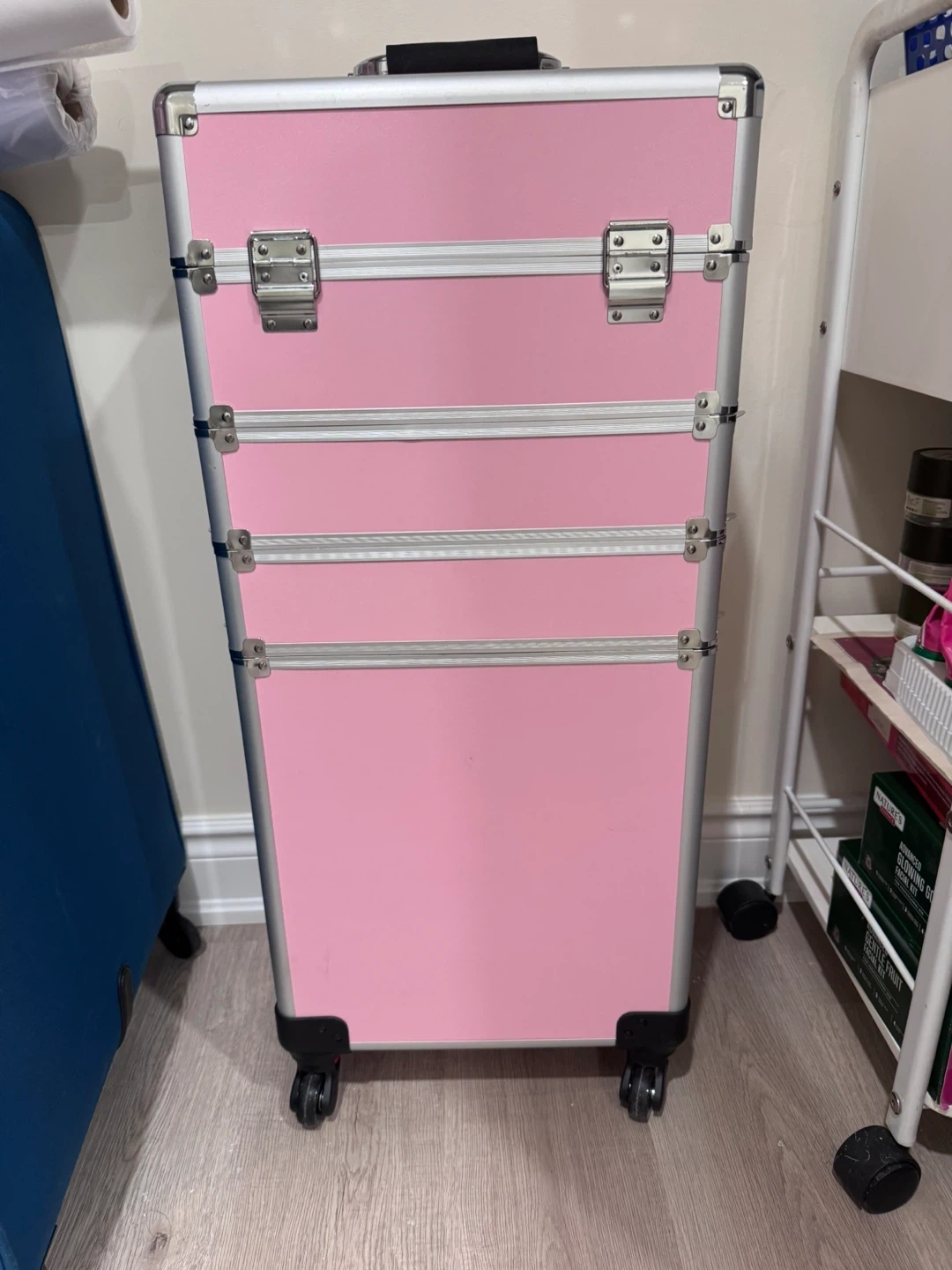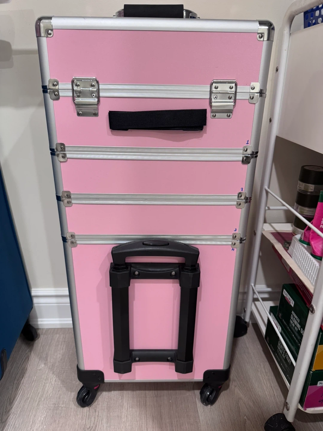 This is a pink rolling makeup train case. It features multiple compartments for organization. It has a retractable handle and wheels for easy transport.