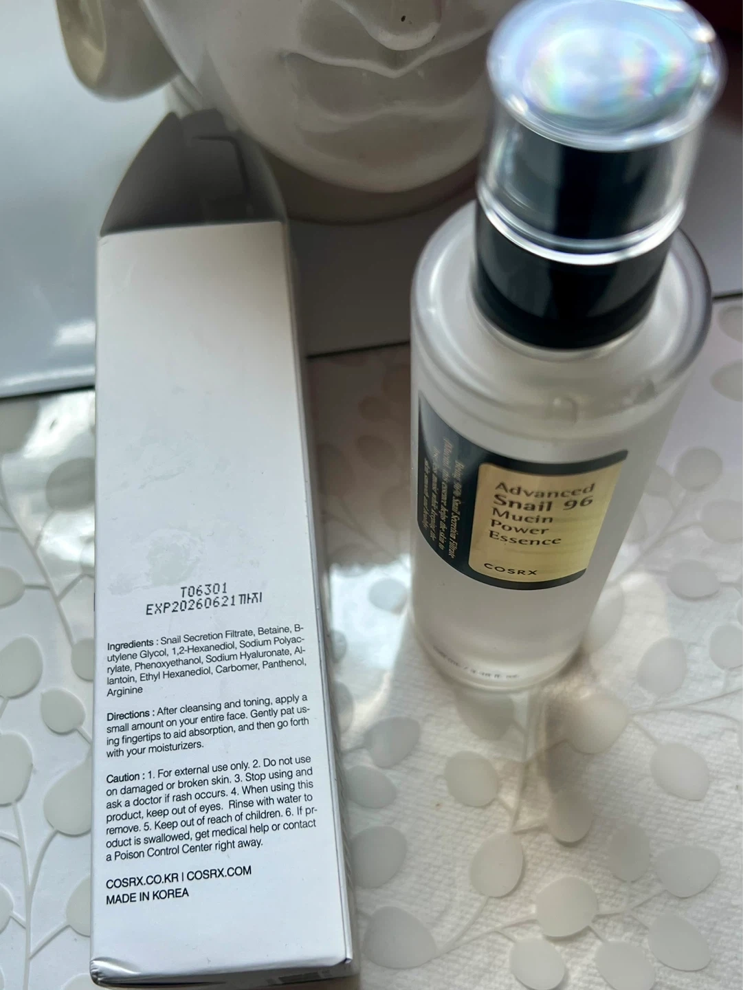 COSRX Advanced Snail 96 Mucin Power Essence. Contains 96% snail secretion filtrate. Helps skin become smoother and more radiant. 100ml bottle.