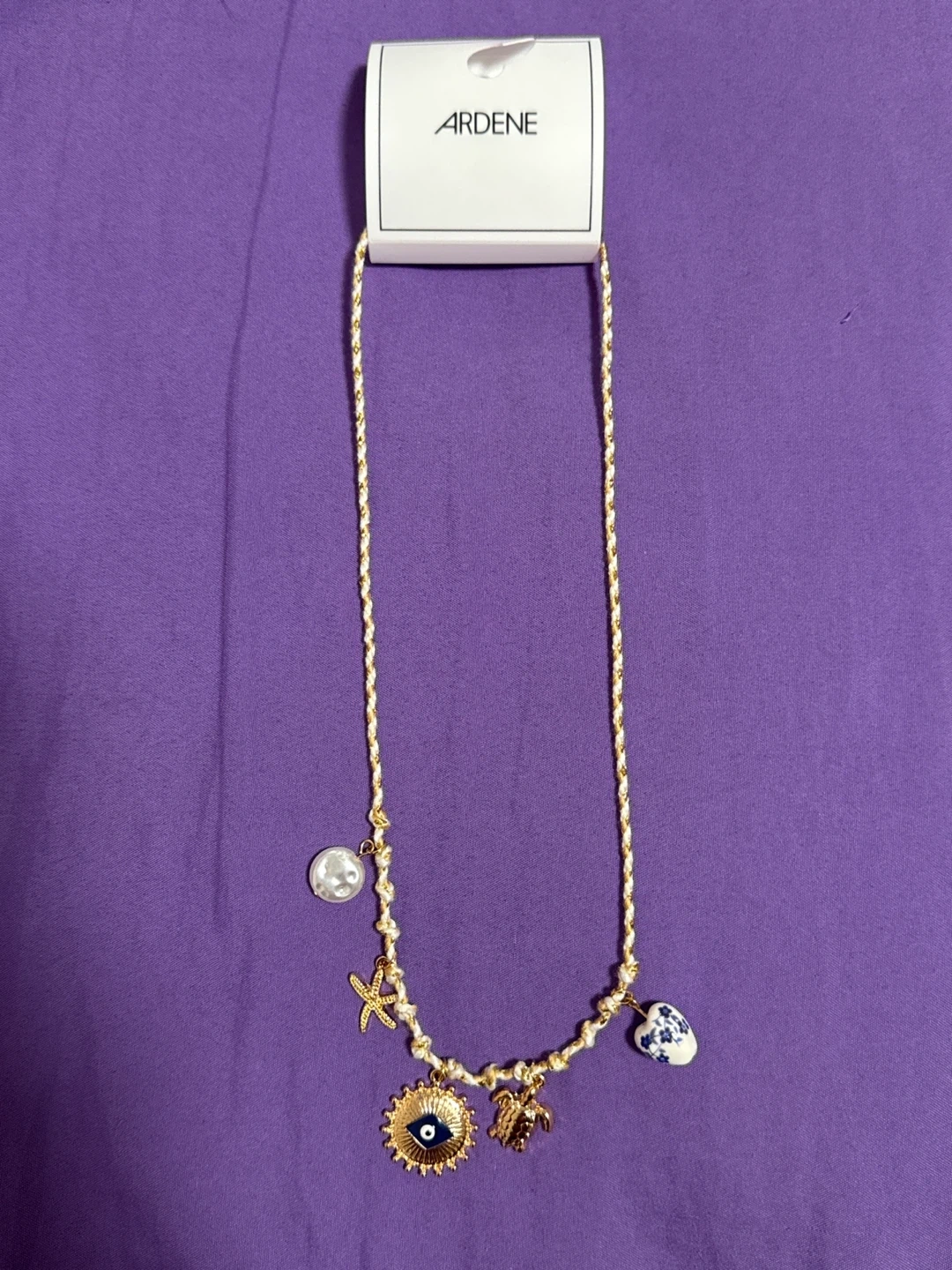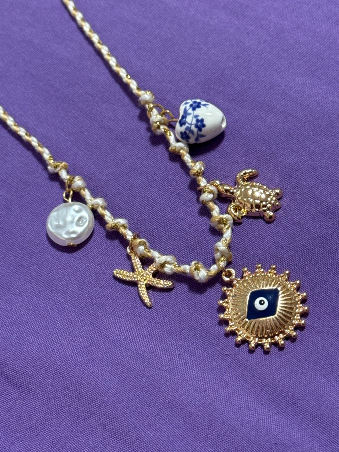 👉Gold-tone necklace with a white braided cord. It features multiple charms including a pearl, starfish, evil eye sun, turtle, and a blue and white patterned heart.