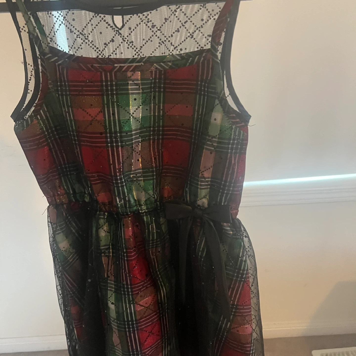 This is a sleeveless girls dress featuring a red, green, and gold plaid pattern with sparkle details. It has a black lace overlay on the yoke and a black ribbon tie at the waist. The skirt also has a black lace overlay. Perfect for holiday events!