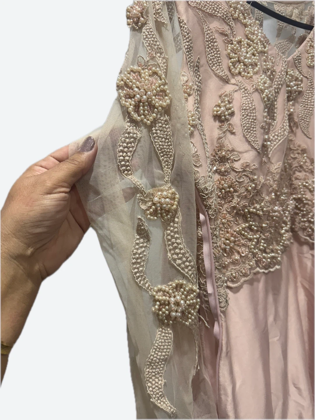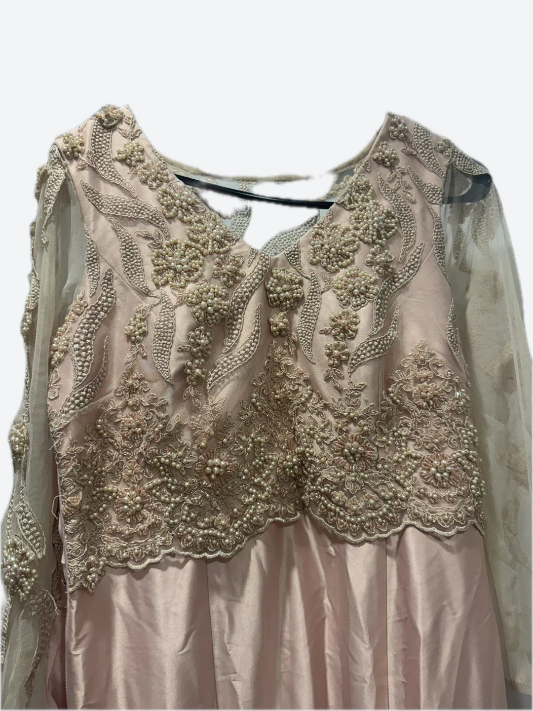 This pink maxi dress features intricate beadwork and embroidery on the bodice and sleeves. It's made of a satin-like material for the skirt and sheer fabric for the sleeves. This dress would be suitable for formal events or celebrations!