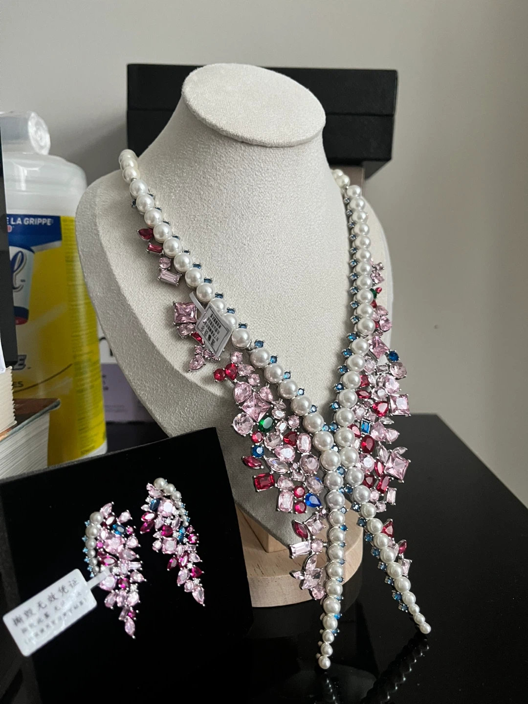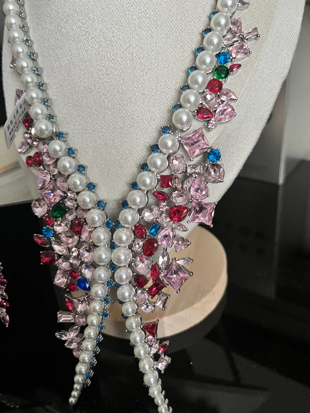 A stunning statement necklace and matching earrings set, featuring faux pearls and a colourful assortment of sparkling crystals. The set includes a necklace with a cascading design and a pair of elegant drop earrings. This dazzling jewellery would be perfect for special occasions and adds a pop of glamour to any outfit!
