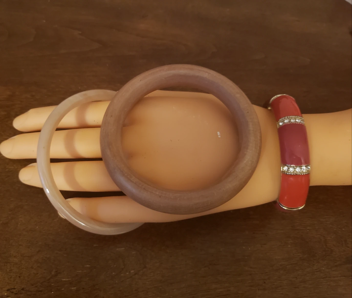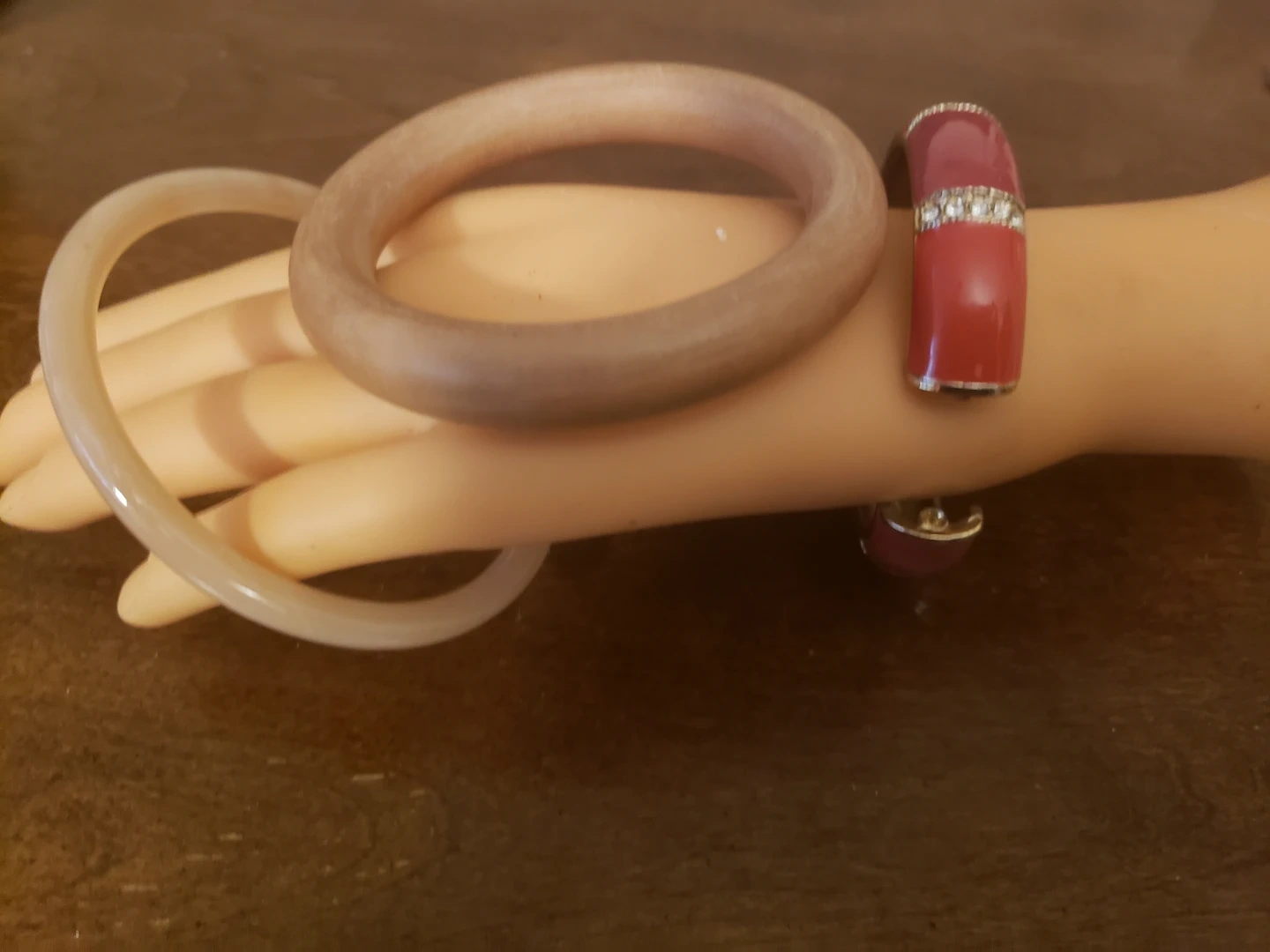 A set of three bangles. Features a red and maroon enamel bangle with rhinestone accents. Also includes a wooden bangle and a clear plastic bangle. These bangles add a touch of flair to any outfit!