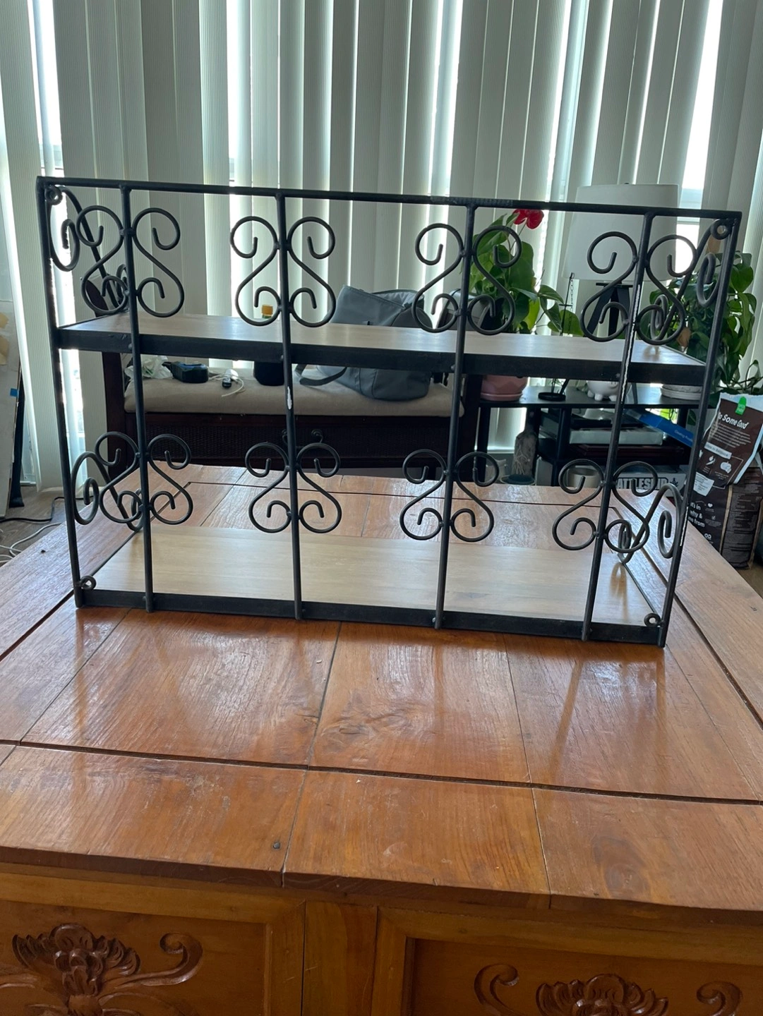 Beautiful wooden shelf or rack with two shelves with metal bearing and design