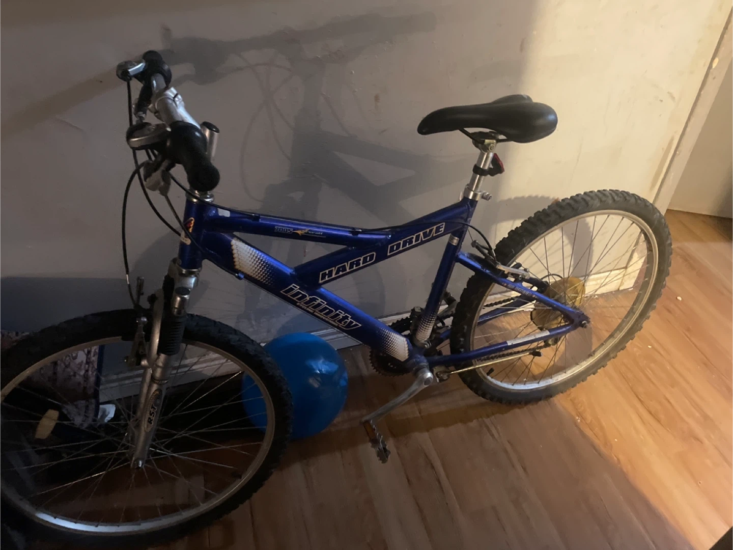 This is a blue Infinity Hard Drive mountain bike. It features front suspension and knobby tires for off-road adventures. The seat and handlebars appear adjustable. Great for trail riding!