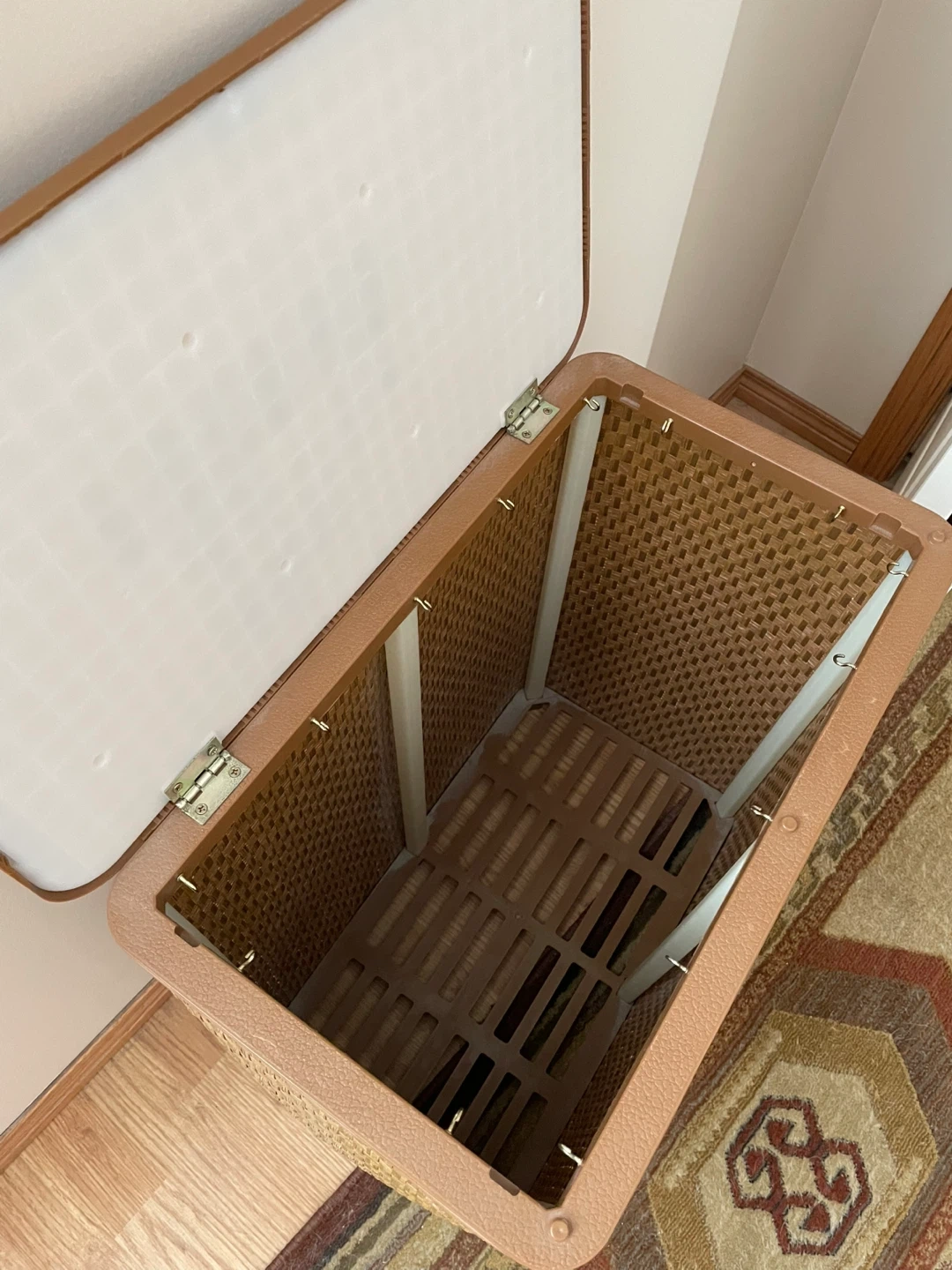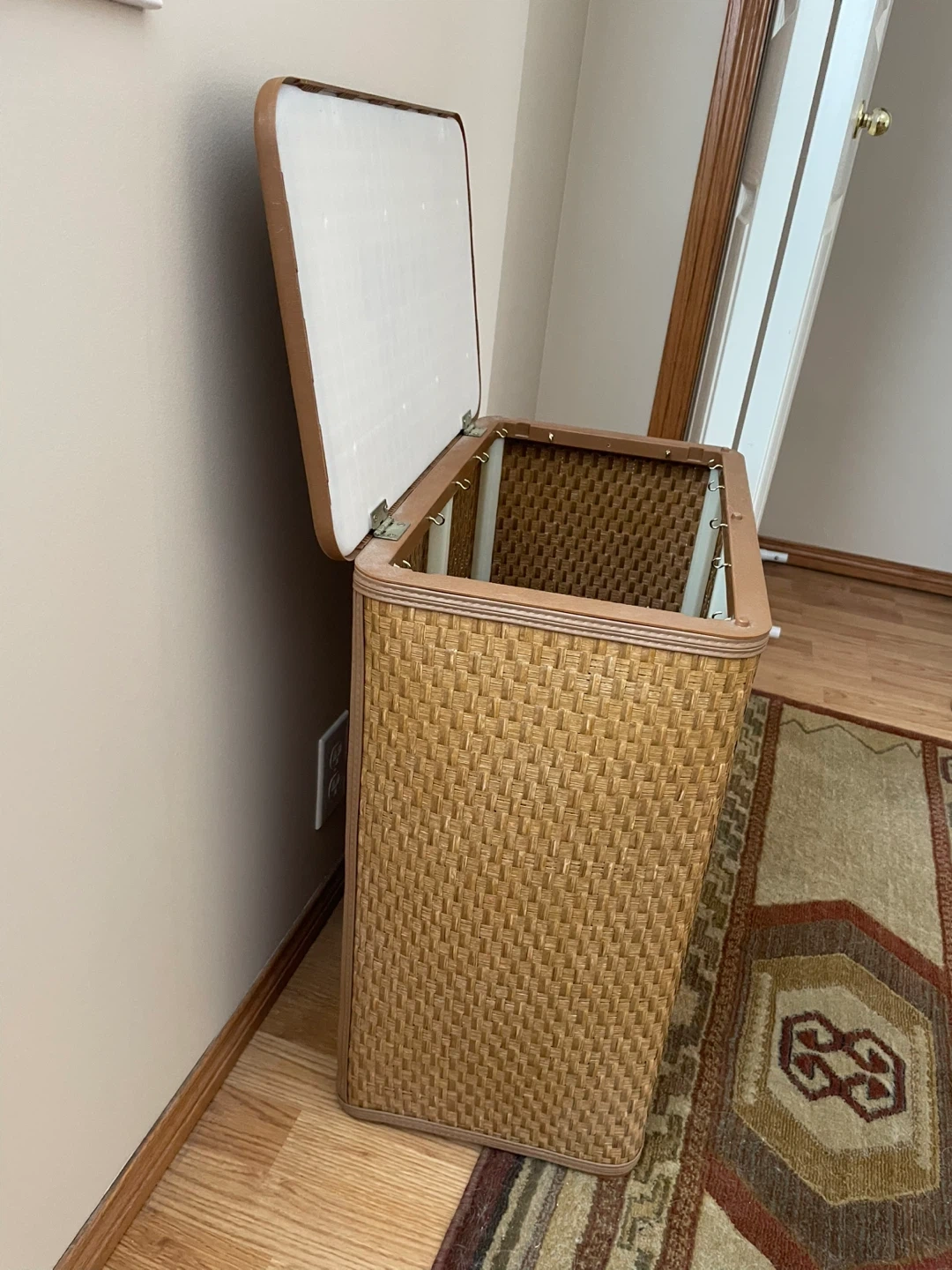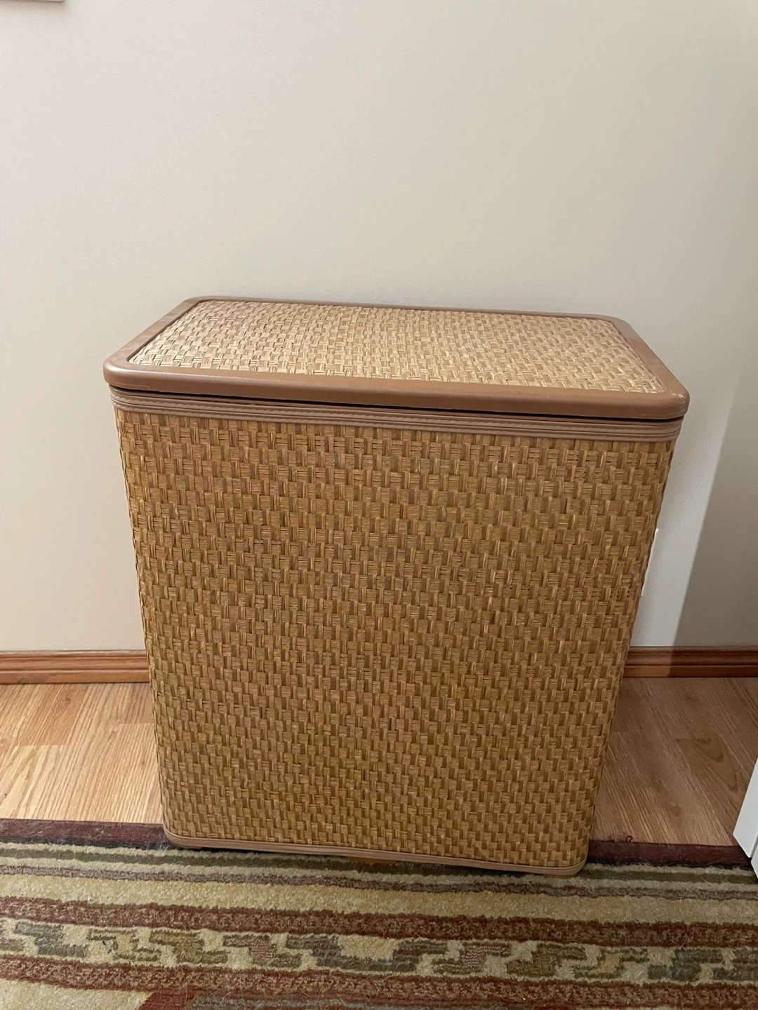 A woven wicker laundry hamper, perfect for any bedroom or bathroom. It's got a hinged lid to keep clothes out of sight. The interior has a liner, and the construction is durable.