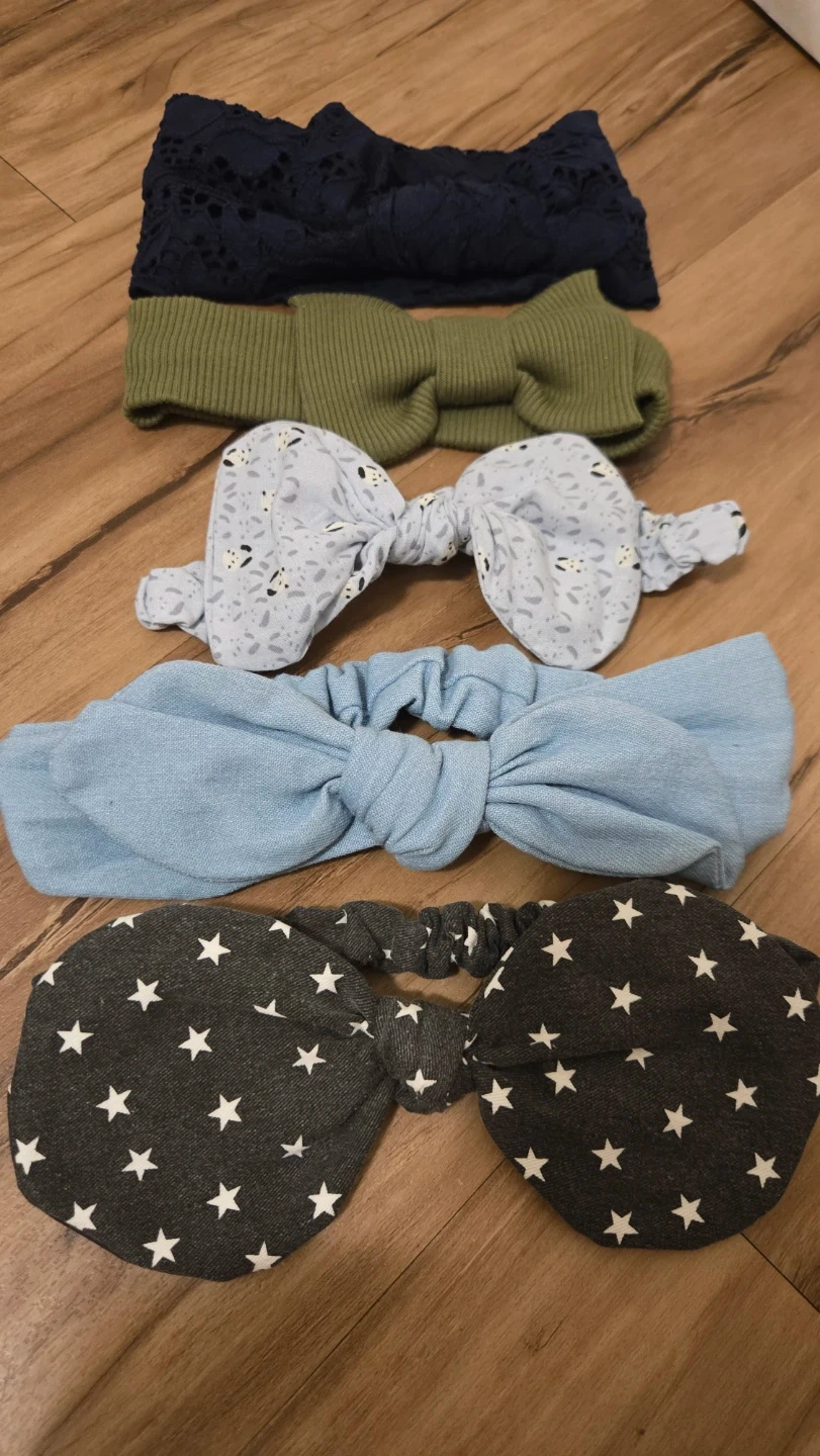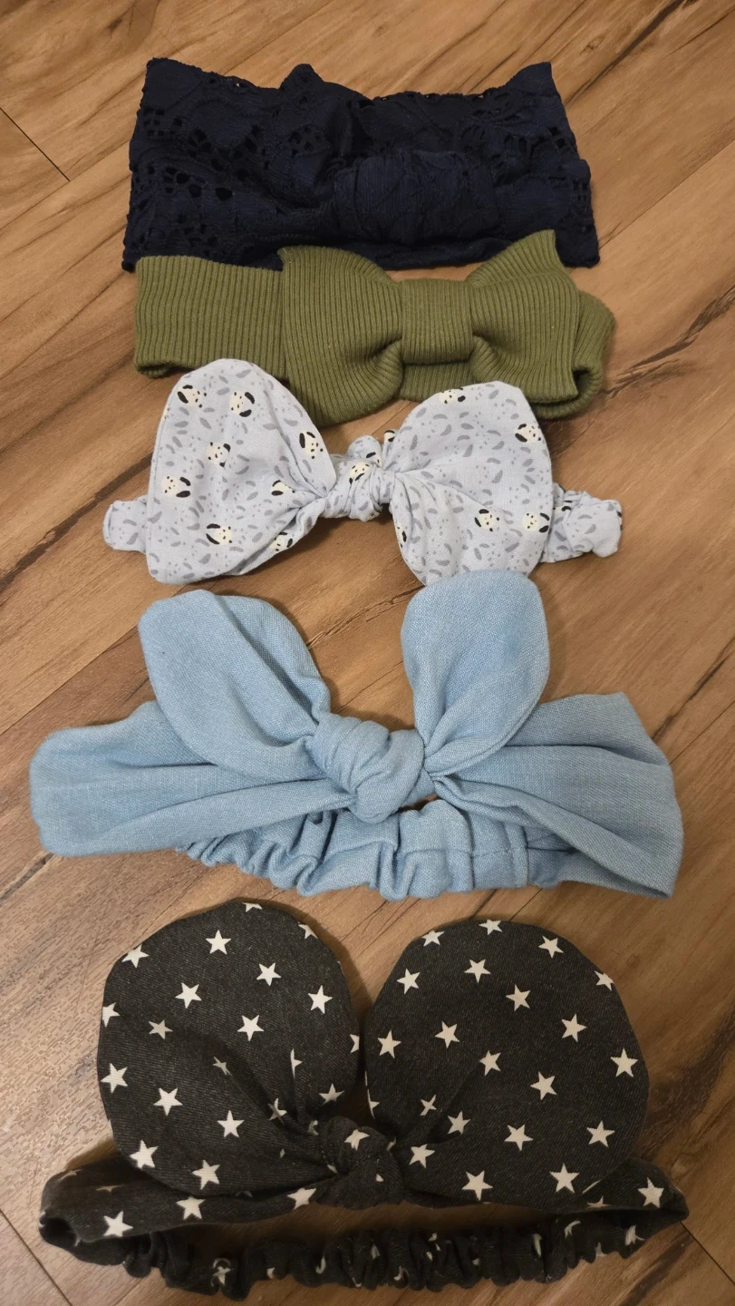 A cute set of five headbands for babies. Includes various styles and patterns like lace, ribbed knit, floral, solid blue, and stars.