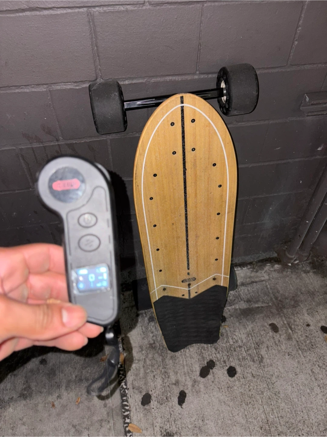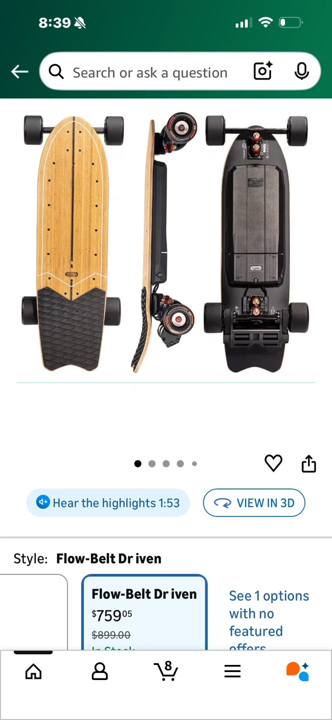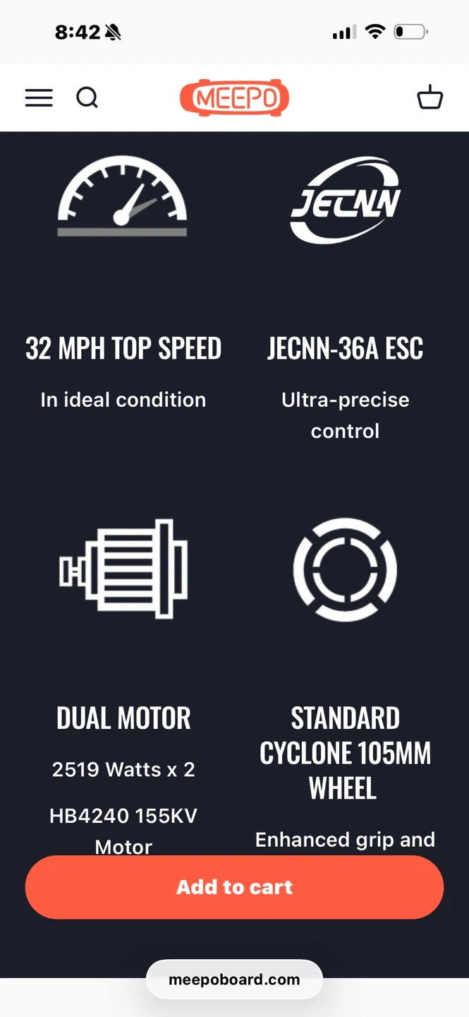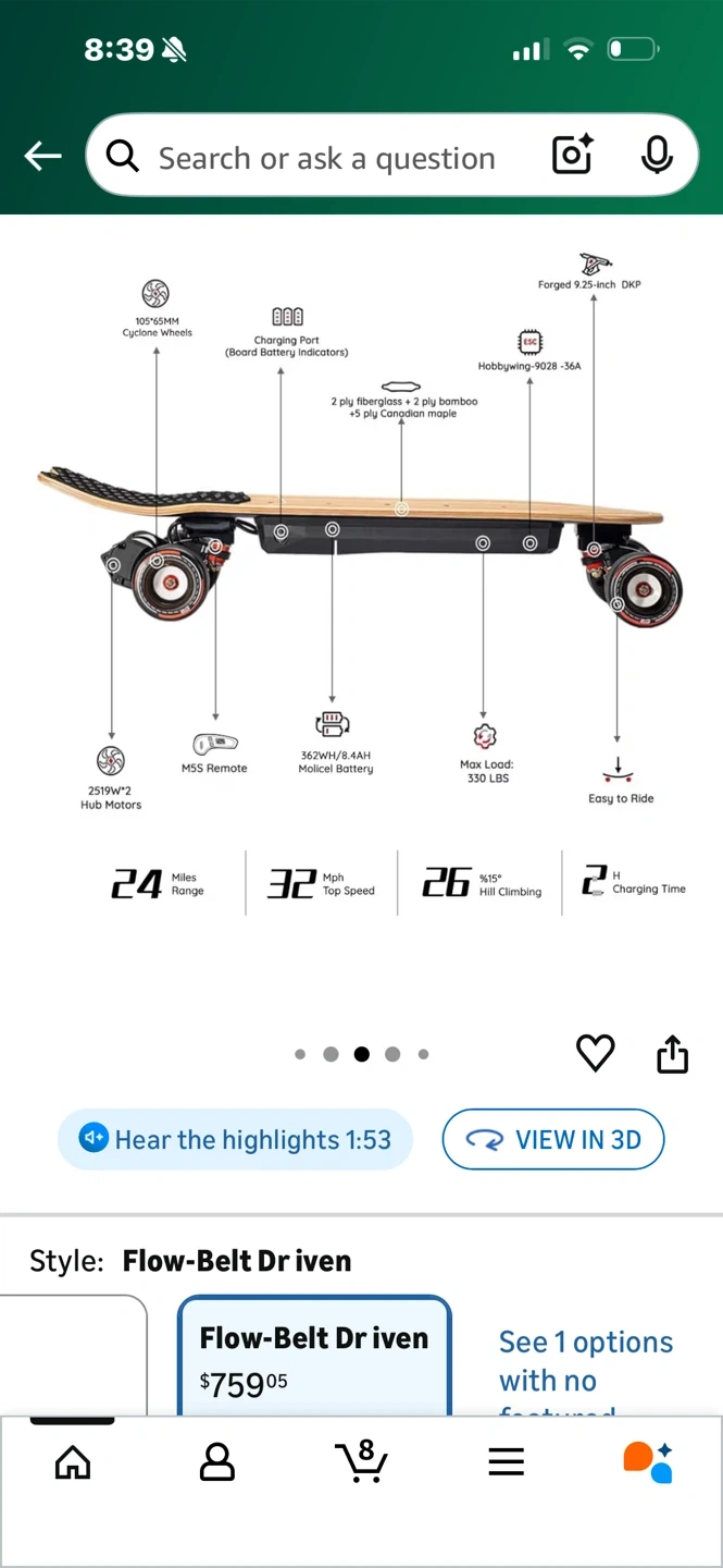 Meepo Flow-Belt Driven electric skateboard with a bamboo deck. It features 100MM Cyclone wheels and 5519W hub motors. Max load is 330 lbs, with a range of 24 miles and a top speed of 32 mph.