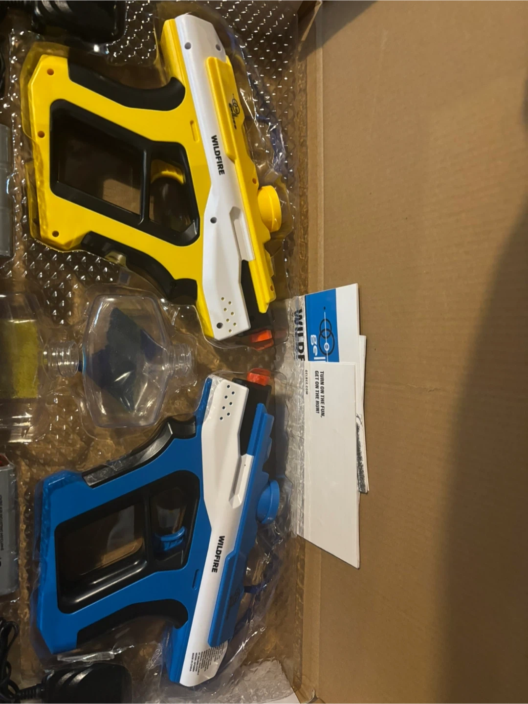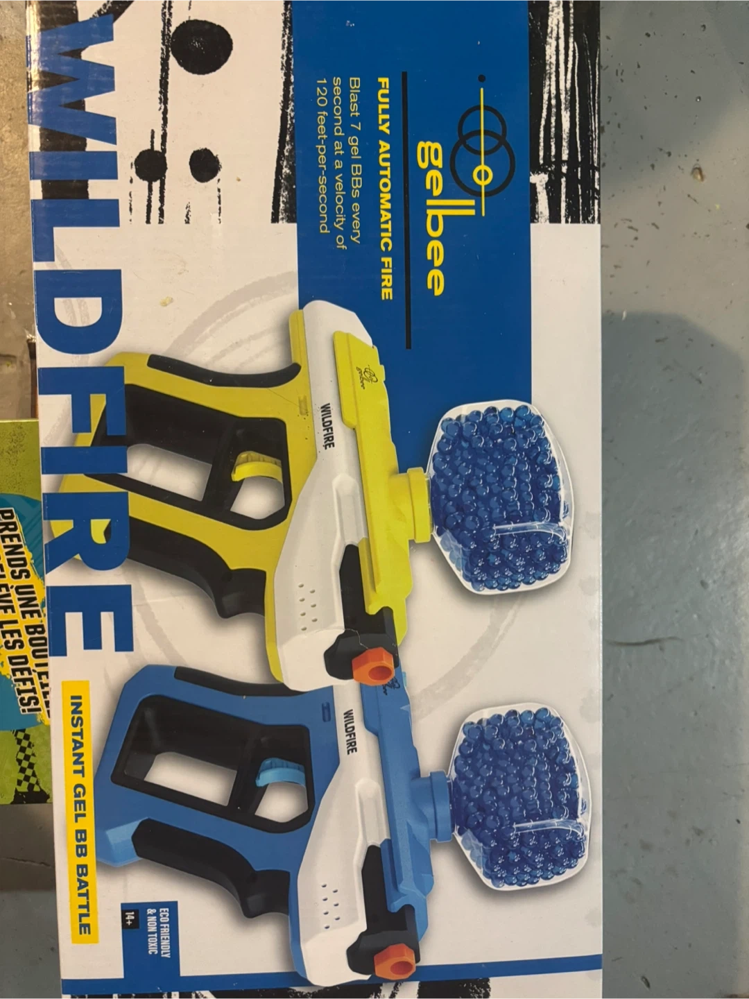 Selling a Gelbee Wildfire set of gel blasters. It includes two blasters, one yellow and one blue. They both say "Wildfire" on the side. The box and instructions are included!
