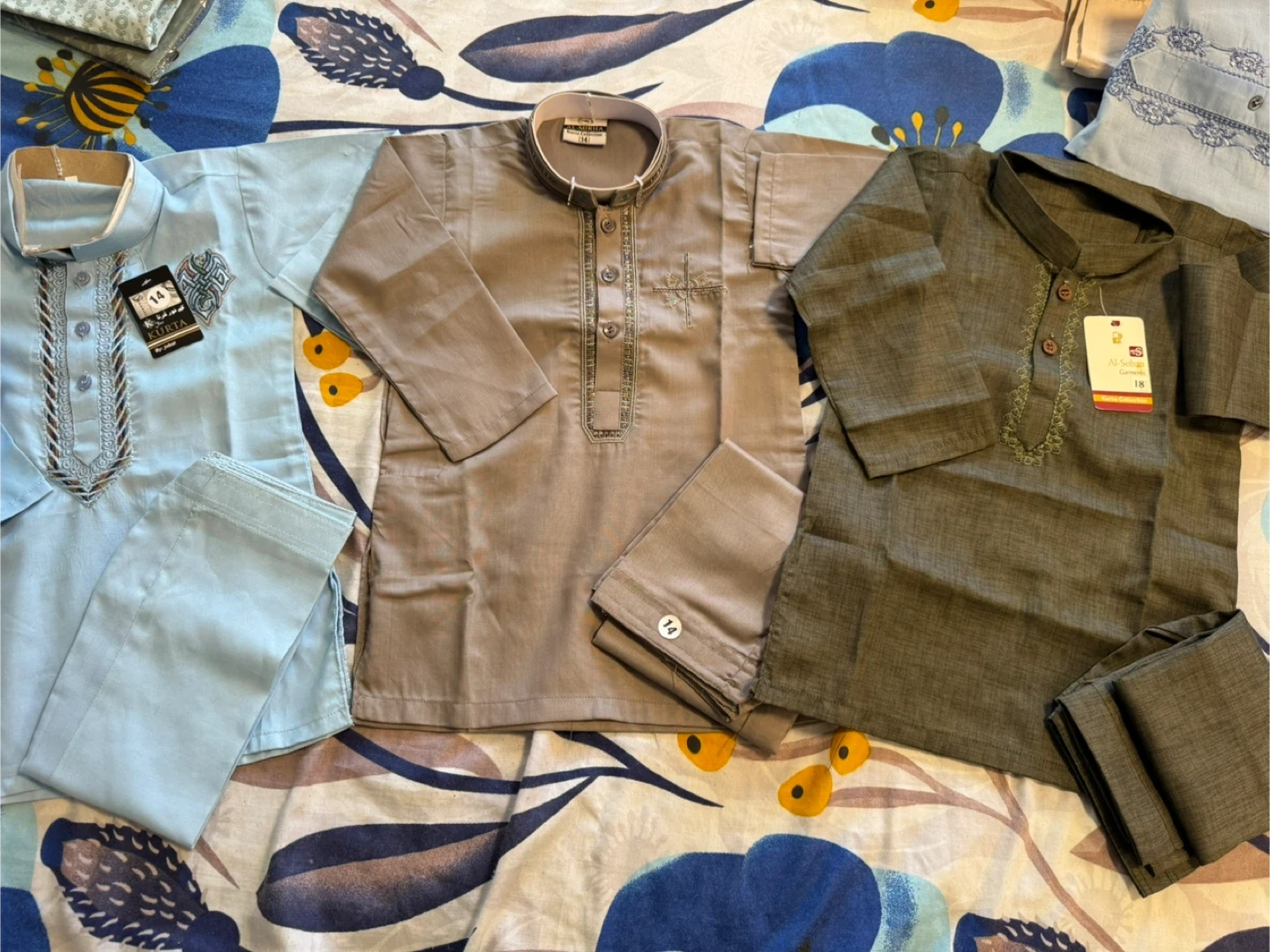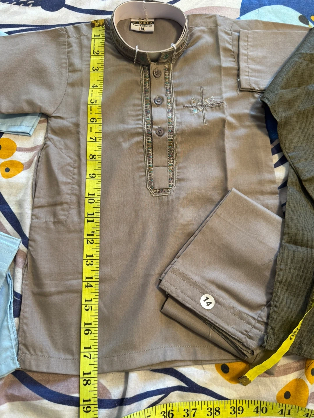 Three boys' kurta pajama sets are available in light blue, taupe, and dark grey. Each set features embroidered detailing and matching pants. Sizes 14 and 18 visible.