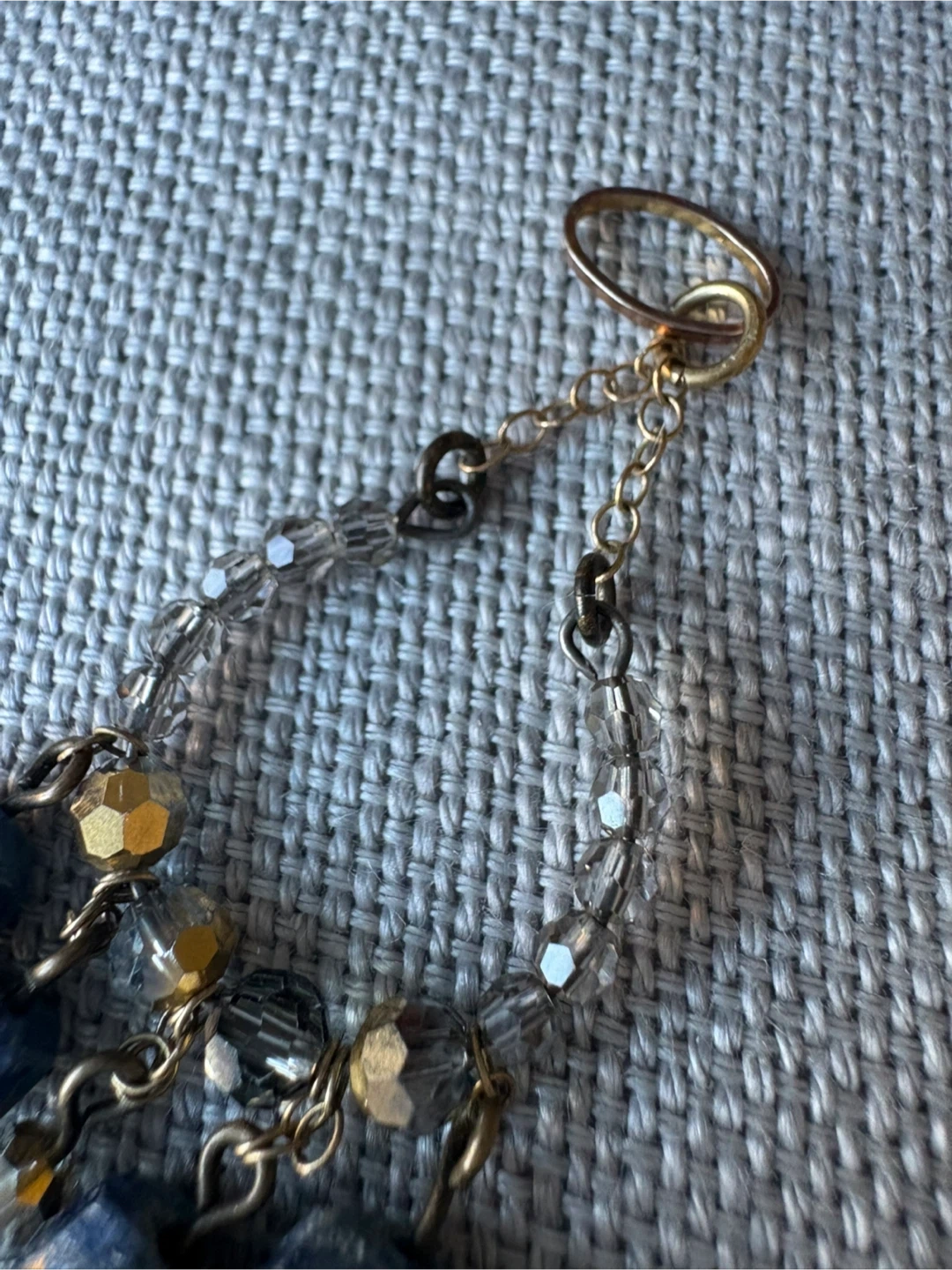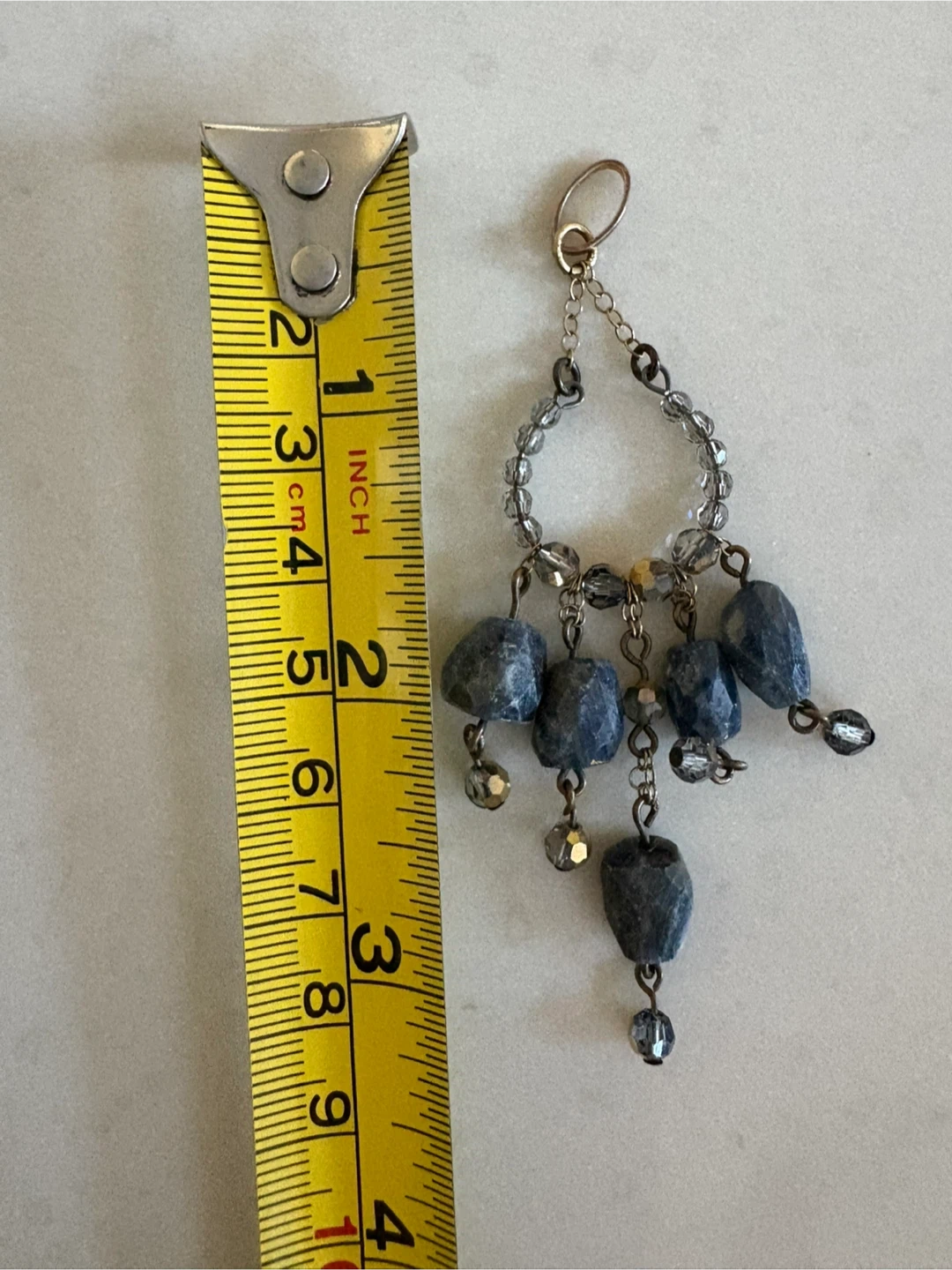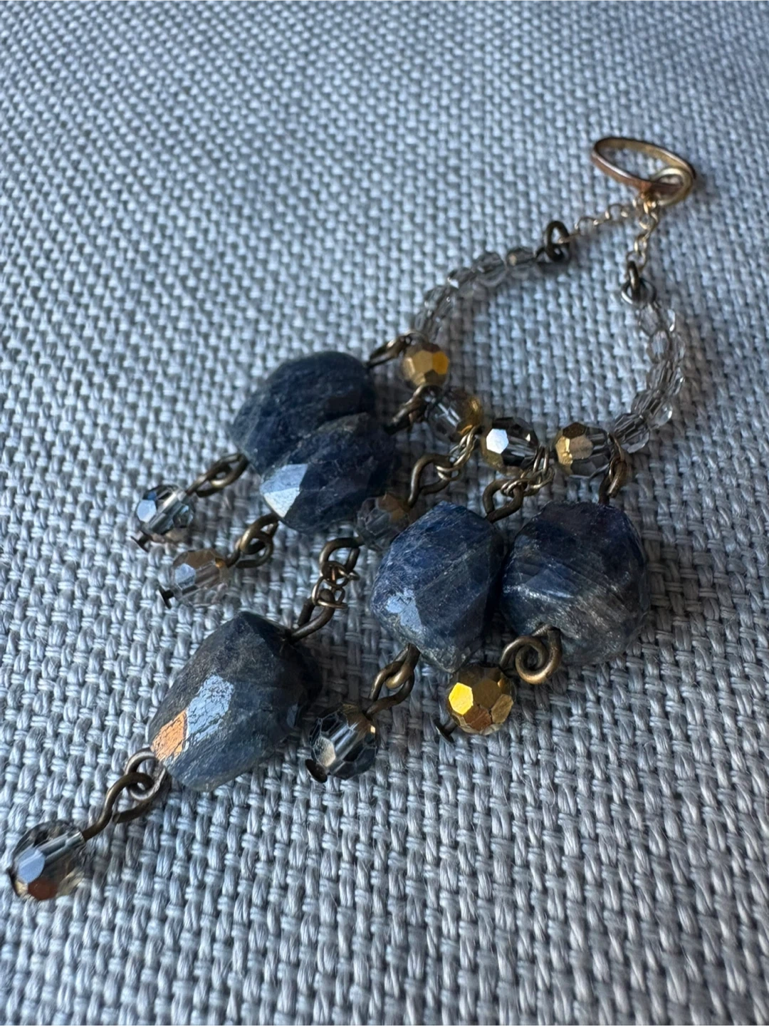 243Gemstone Pendant (for necklace) Featuring Multiple Naturally Occurring Blue Sapphire Gemstones (confirmed by gemologist) with Faceted Crystal Beads and Bronze Tone Metal 3.25 inch length 1.5 inch at widest (This was from a designer earring set that we adapted to pendants. I have one. There is a chance that I might have the other one somewhere as well).