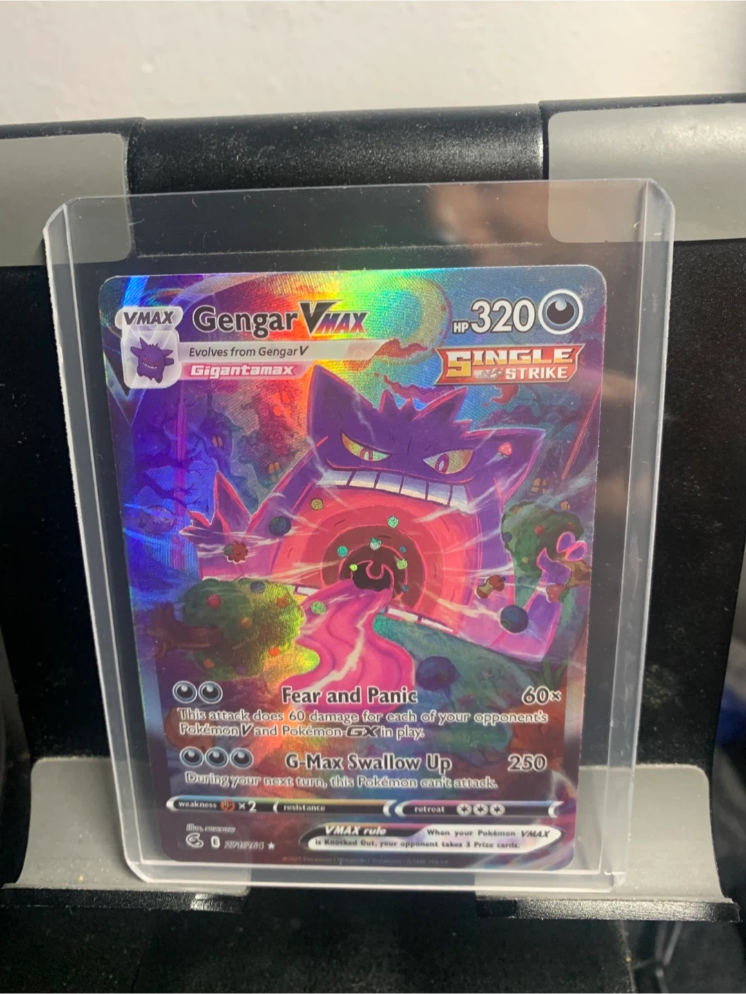 10Selling a Gengar VMAX Pokemon card. It has the Single Strike style and 320 HP. The card features moves like Fear and Panic and G-Max Swallow Up! In 10/10 condition Pick up at my location