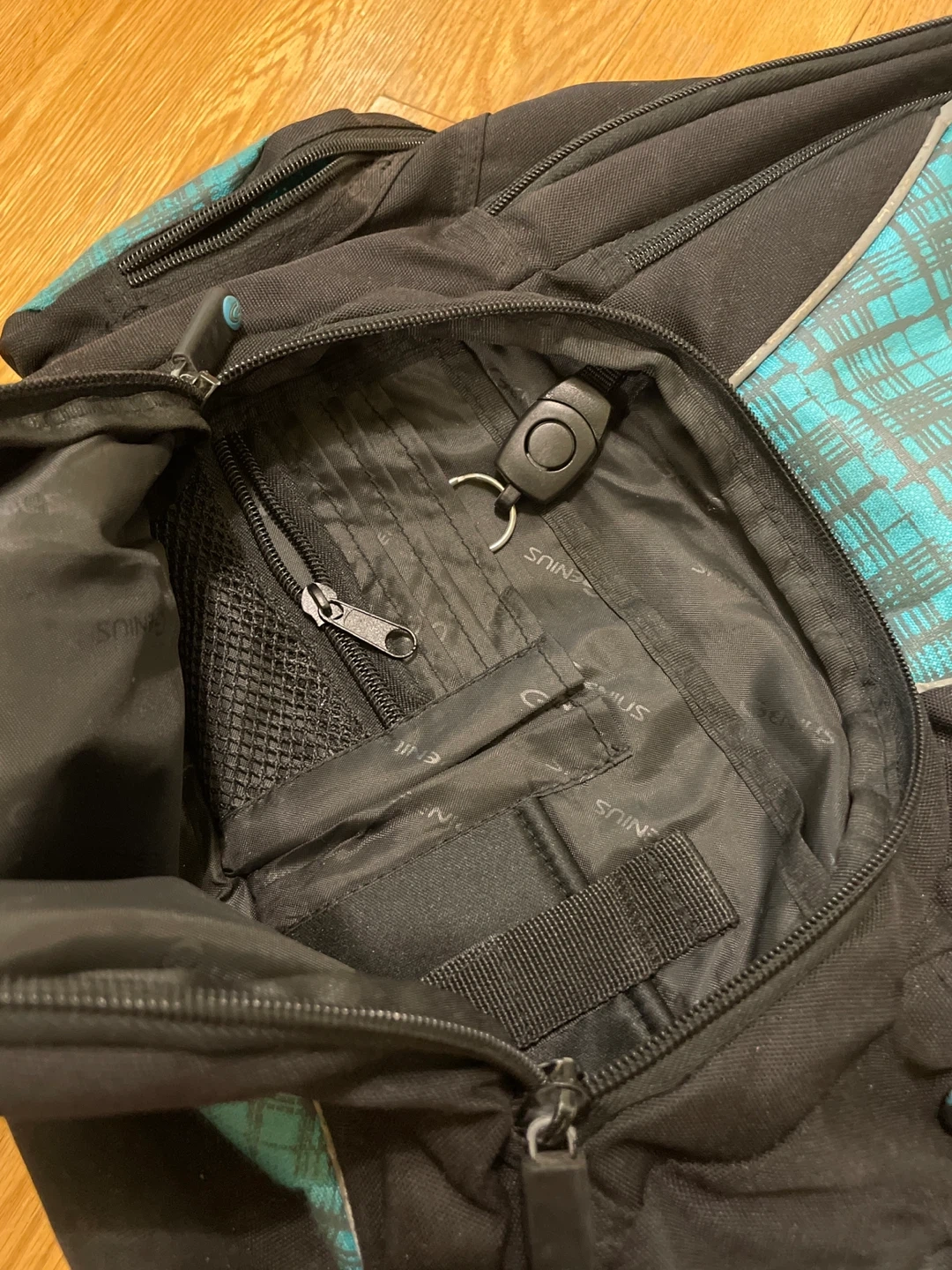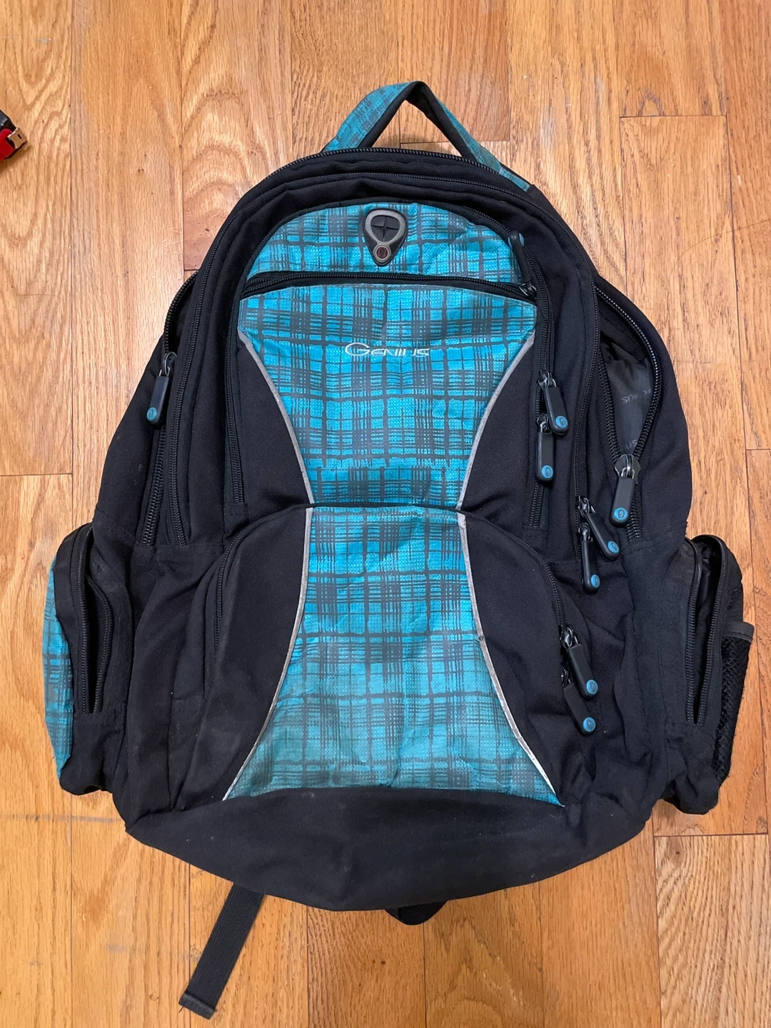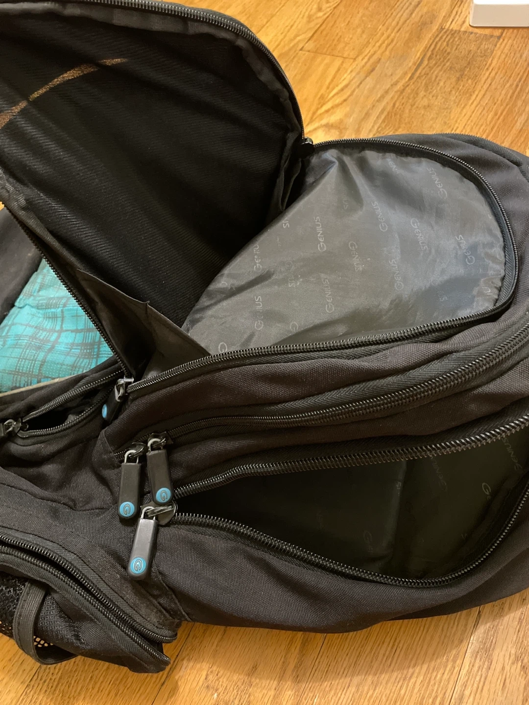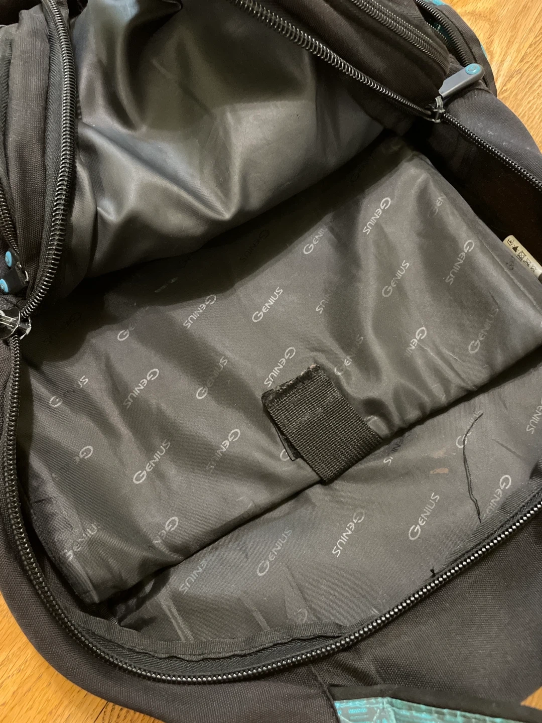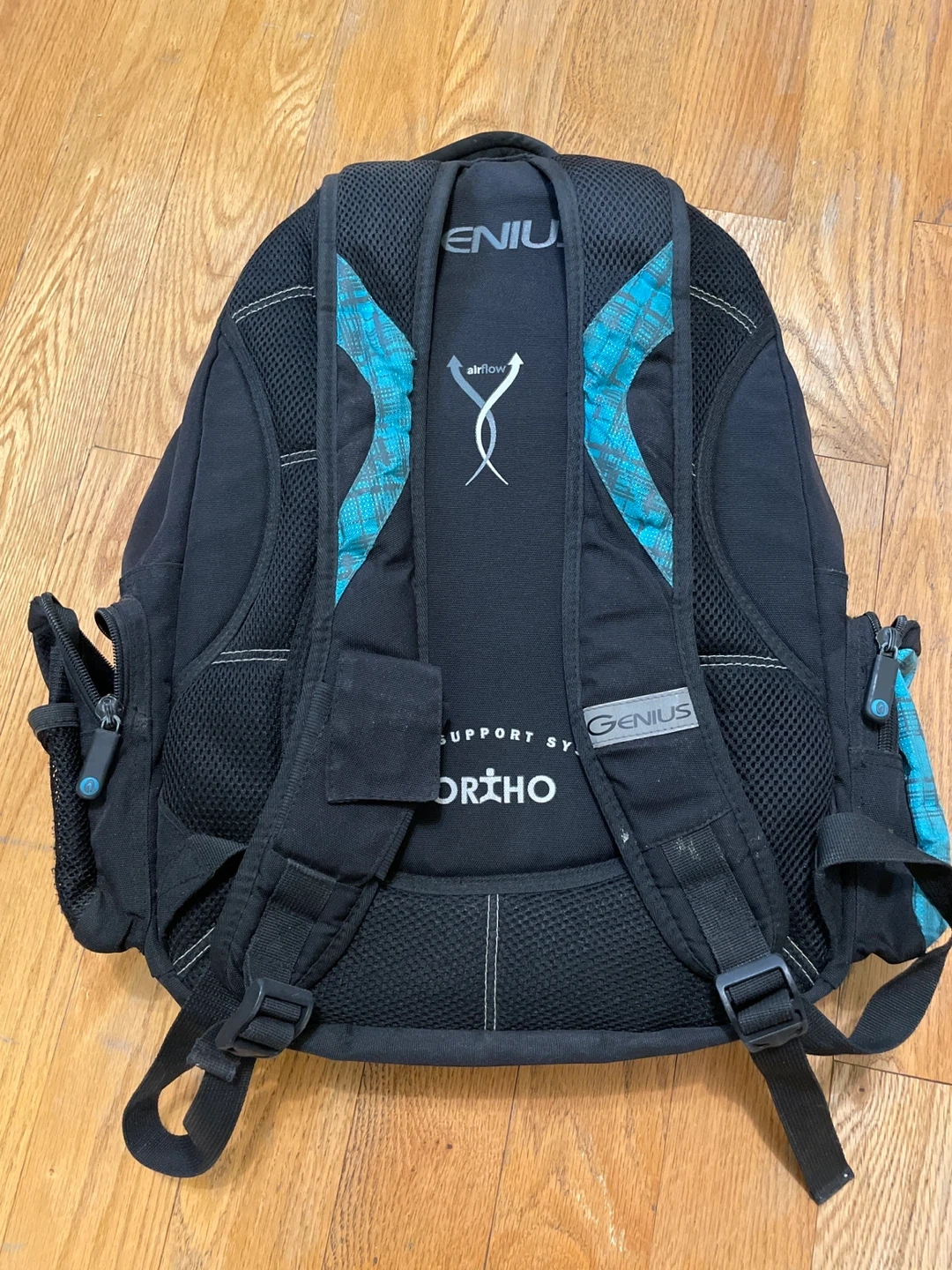 138A Genius backpack in black with turquoise accents! It has many compartments (8 including the one on the strap) for organizing your things. The interior lining has the Genius logo printed all over. It's in relatively good condition and ready for a new home! The laptop compartment can fit a 16 inch laptop max. Cash only.