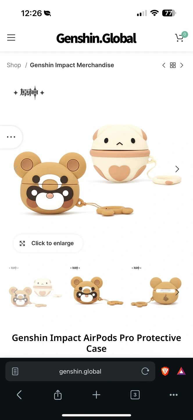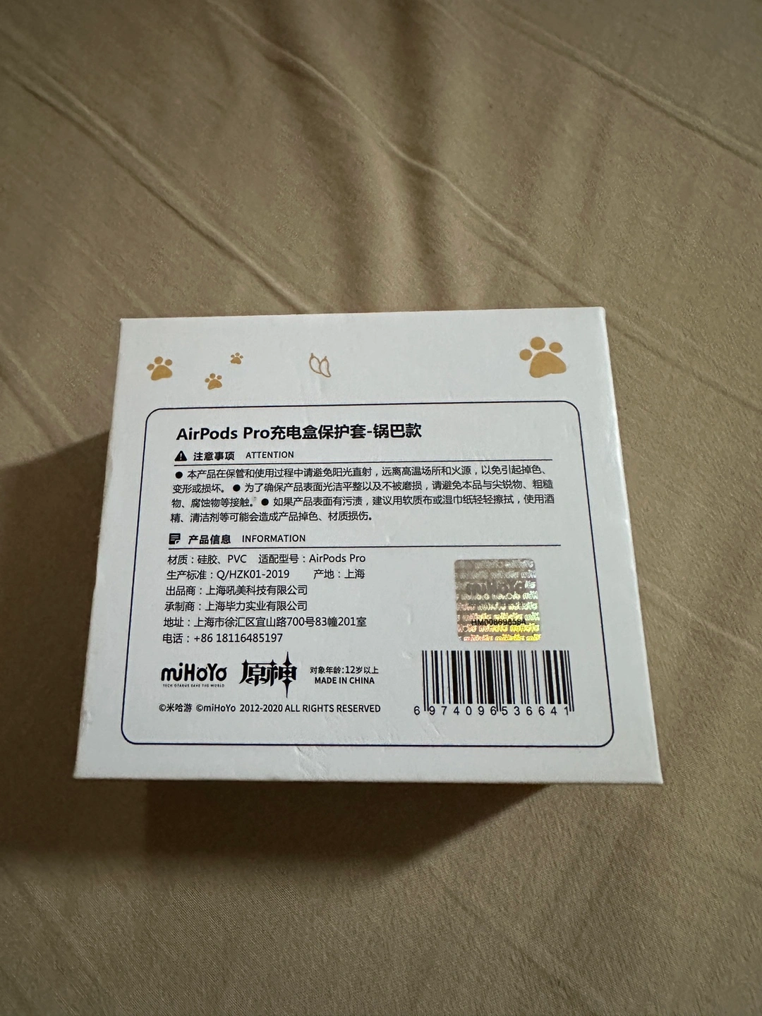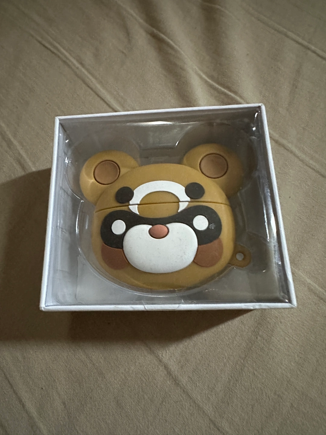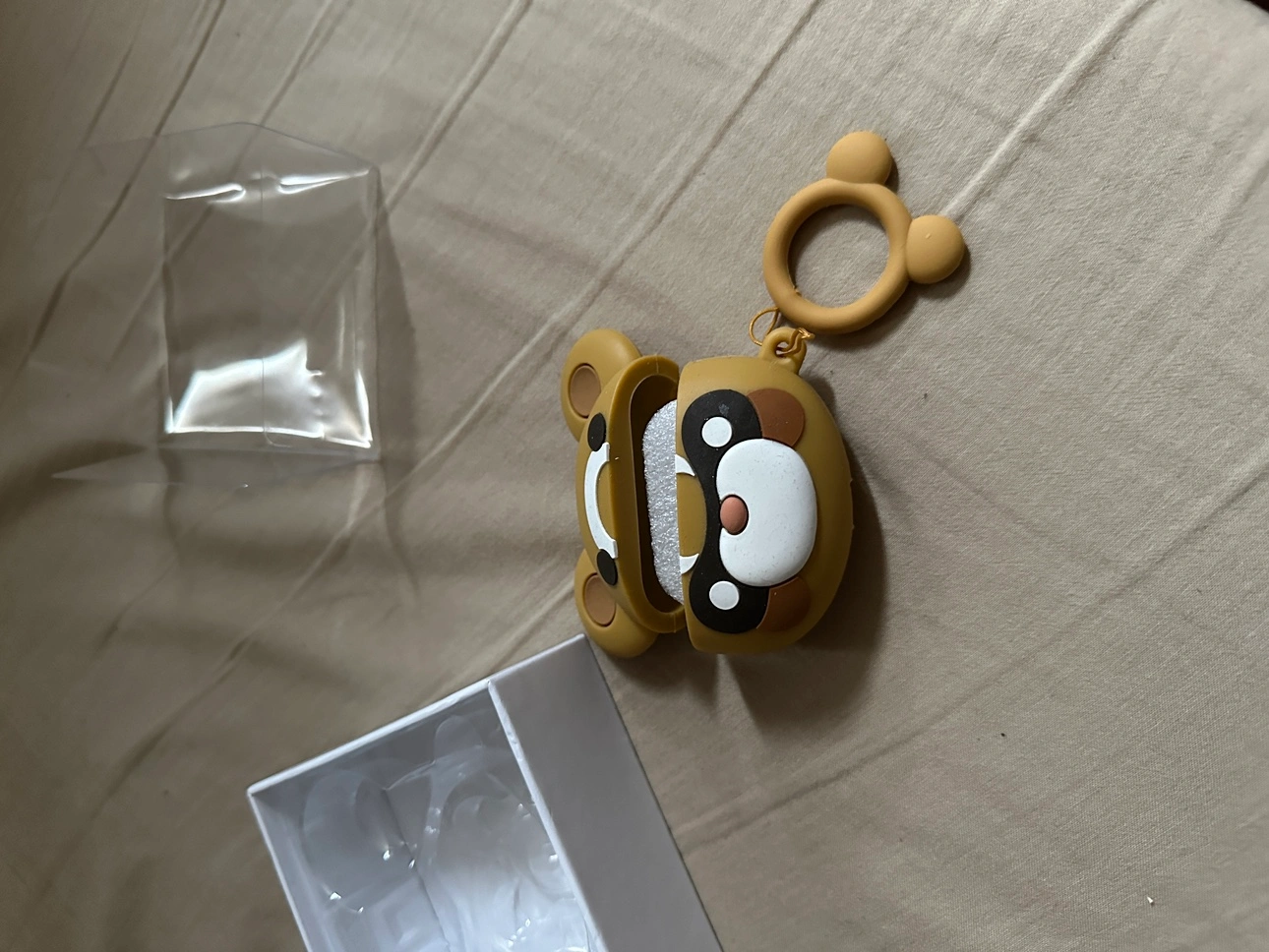 A brown bear-shaped case for AirPods Pro. Includes a ring for easy carrying. Comes with a box. The case has a small white spot on the top left corner of the face.