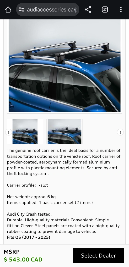 Selling a roof rack for an Audi Q5, model years 2017-2025. NEVER OPENED-It comes with all the basic components. The roof carrier is powder-coated and made of aerodynamically formed aluminum profile with plastic mounting elements. It also has an anti-theft locking system. Net weight is approximately 6 kg