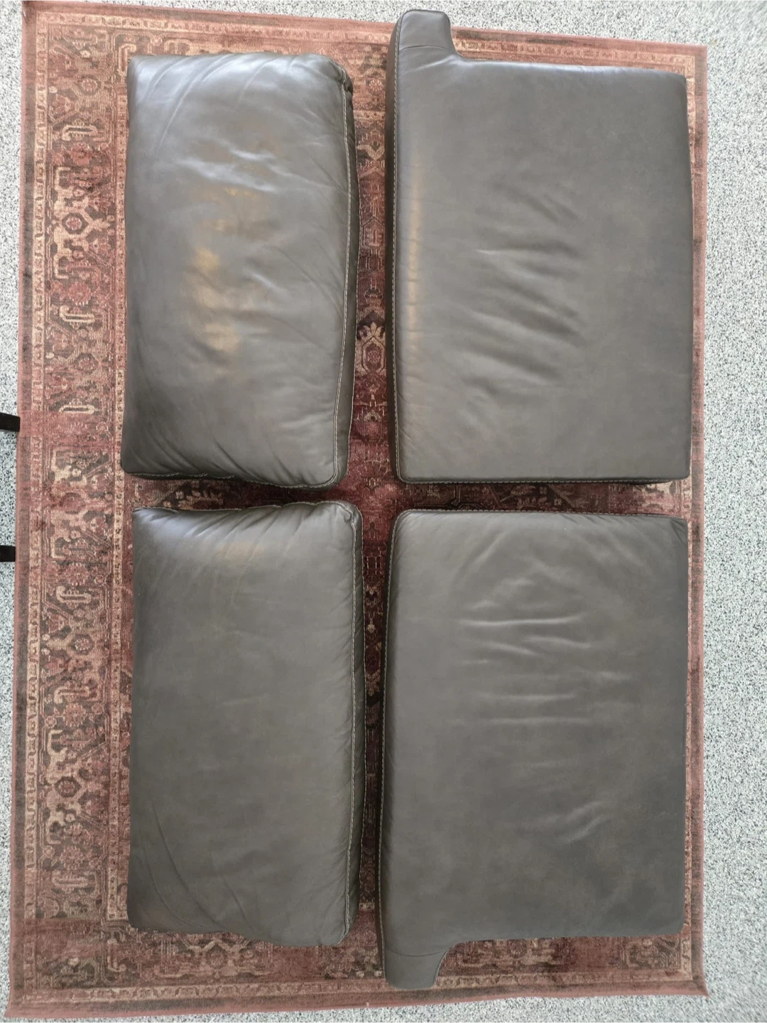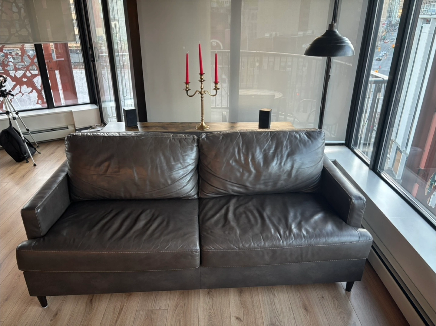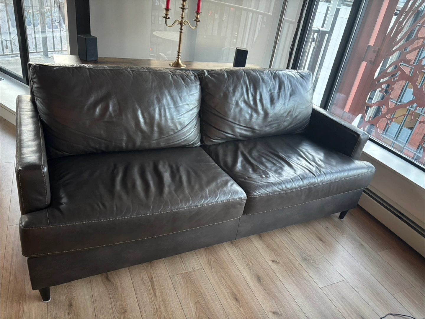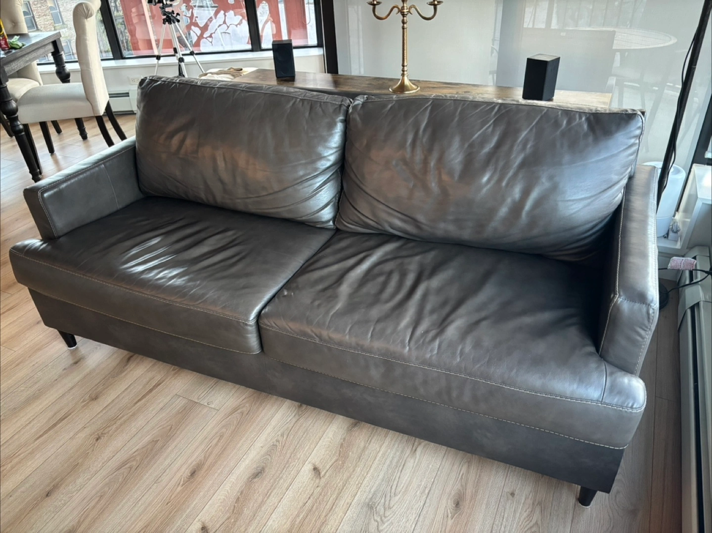55**Carter Genuine Leather Sofa β Ash Grey (Wanek Furniture)** Beautiful leather sofa in ash grey. Made by **Wanek Furniture Company Ltd.** **Details:** * Genuine leather on main seating areas * Durable PVC and polyester on sides and back * Comfortable foam and fiber cushions (firm but cozy) * Neutral modern style that fits almost any space * Model #4950138 / M.O. MXRTSHO Only genuine materials (leather, PVC, polyester, and foam) β verified by manufacturer tags. ποΈ **Condition:** Excellent π **Dimensions:** Inches D38 x H36 x W79 π Pickup only (Langley)