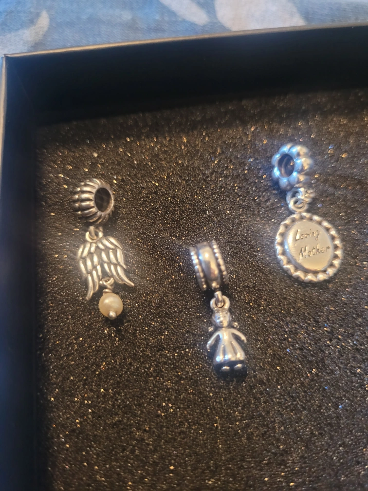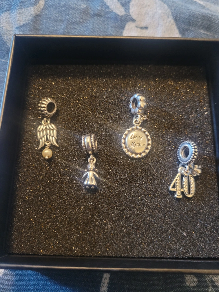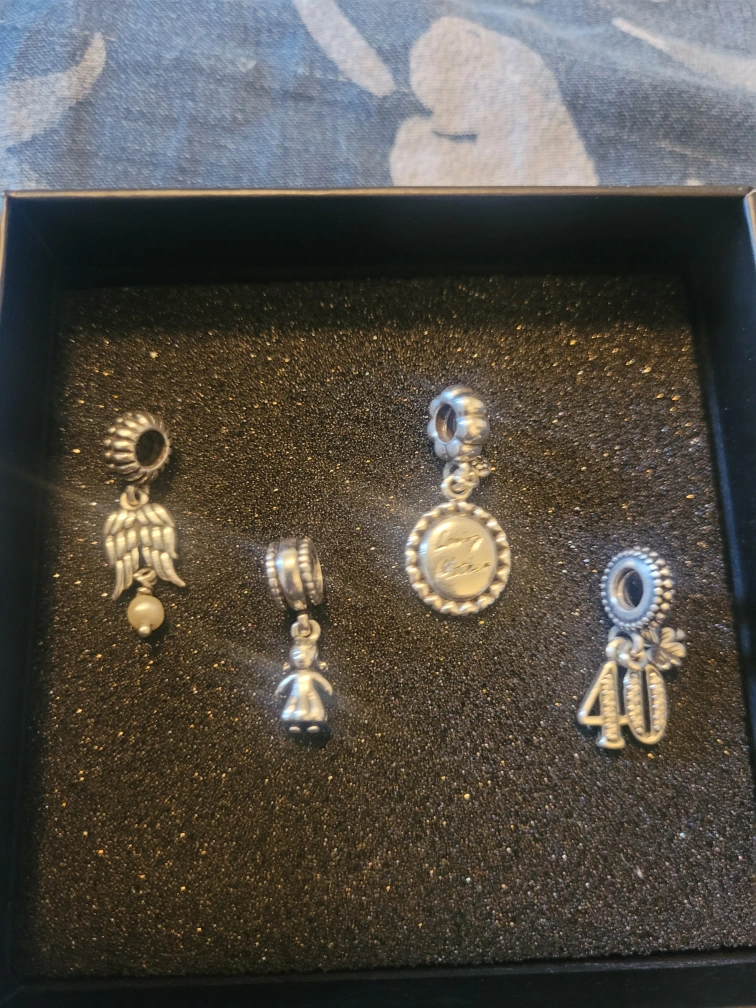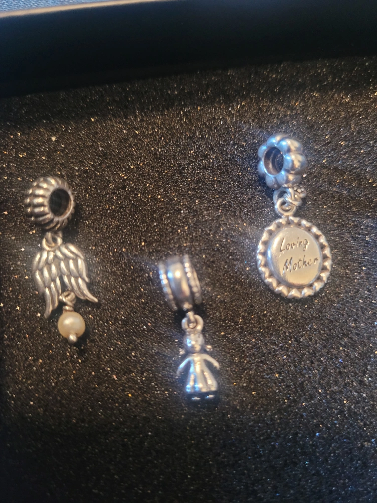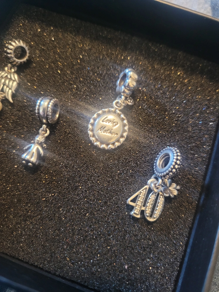 Selling genuine Pandora charms for Pandora charm bracelets. Great used condition, just need a polish. Charms are: 'Loving Mother' charm, a '40' charm, Little girl charm, and an angel wing charm with a pearl accent. These are the real thing, as I used to have them on a Pandora bracelet. Selling for $15 each.