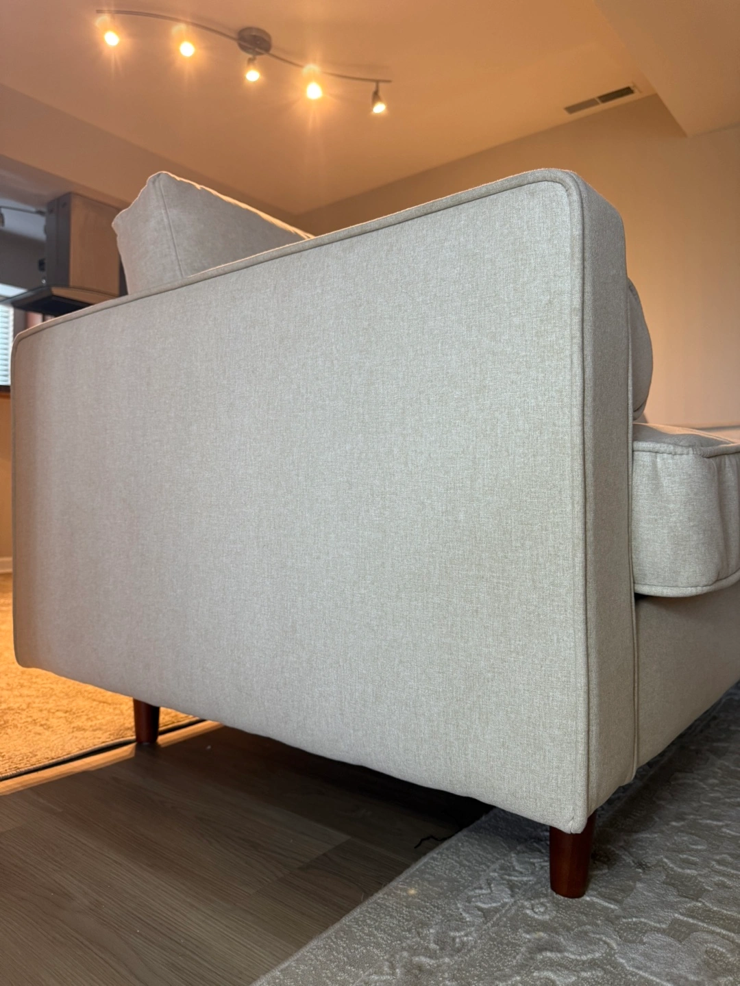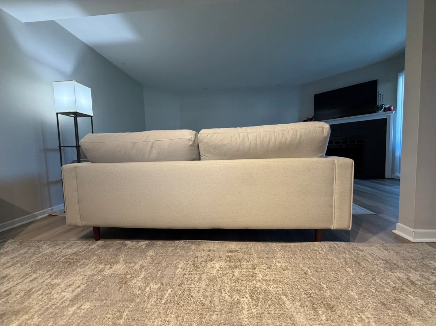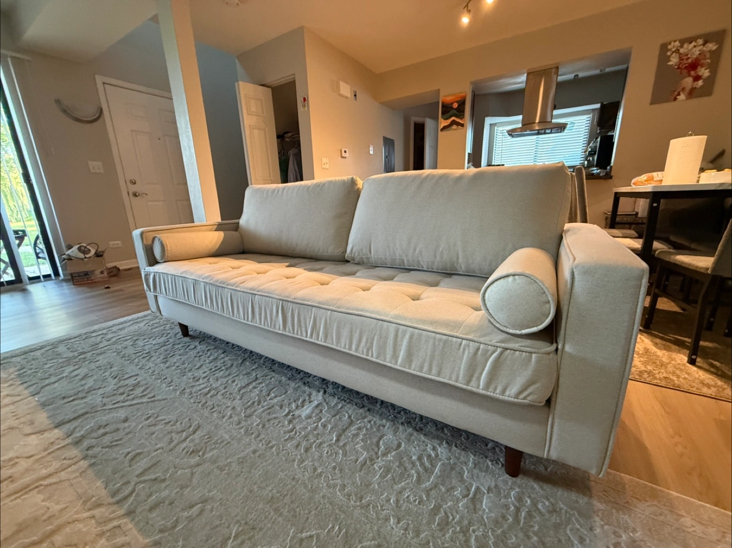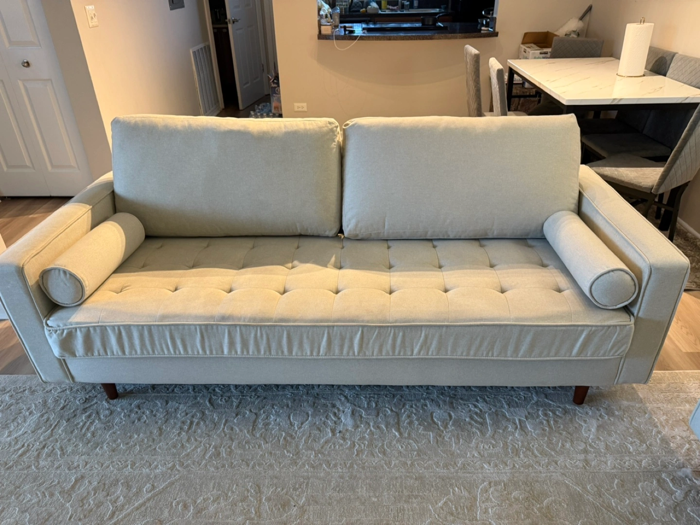 Selling a comfortable ivory sofa. It's in good condition and would look great in any living room! Mid-century vibes. This sofa features track arms, tapered dowel legs, and a button-tufted seat cushion for lots of vintage-inspired style in your living room or den. It's built with a solid wood frame and wrapped in richly colored velvet upholstery. This couch is also filled with foam to provide just the right amount of support as you lie back and lounge. Welted seams + cylindrical throw pillows add a few tailored finishing touches.