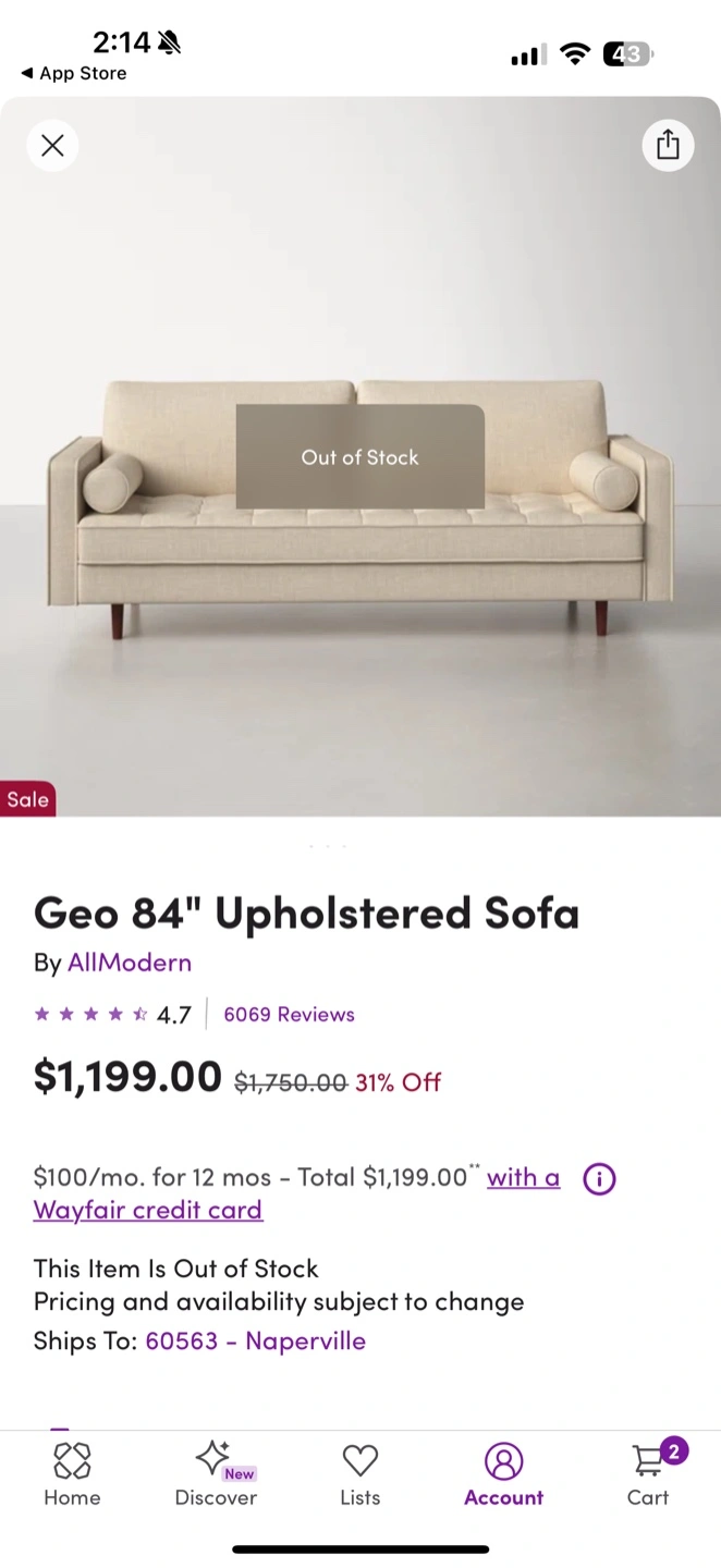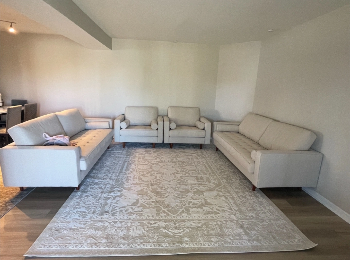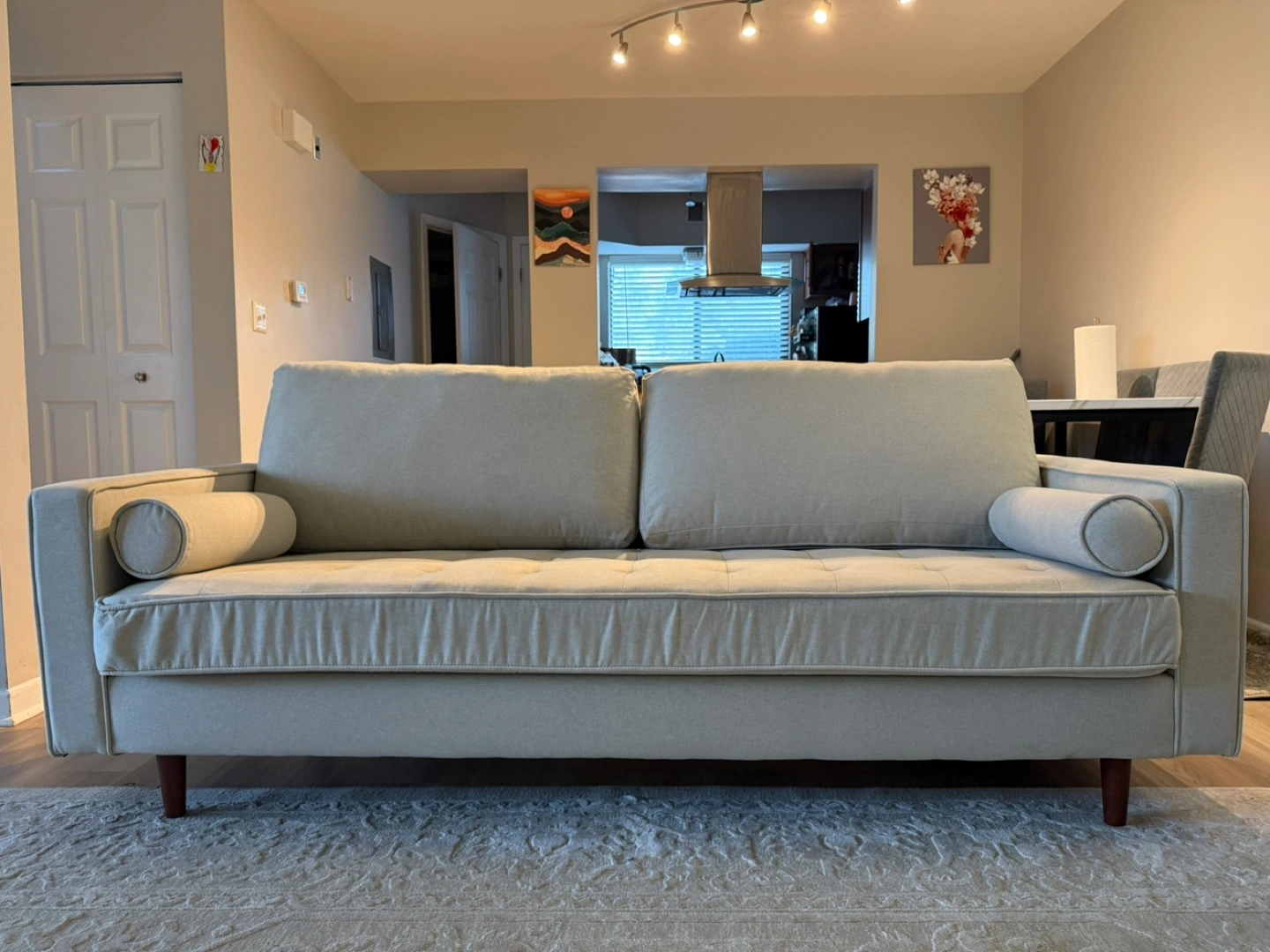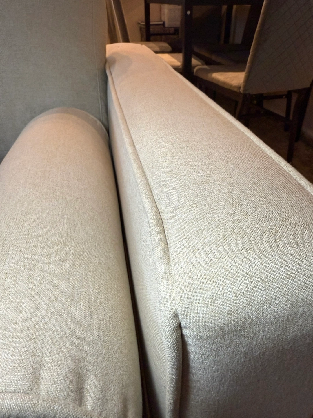 Selling a comfortable ivory sofa. It's in good condition and would look great in any living room! Mid-century vibes. This sofa features track arms, tapered dowel legs, and a button-tufted seat cushion for lots of vintage-inspired style in your living room or den. It's built with a solid wood frame and wrapped in richly colored velvet upholstery. This couch is also filled with foam to provide just the right amount of support as you lie back and lounge. Welted seams + cylindrical throw pillows add a few tailored finishing touches.