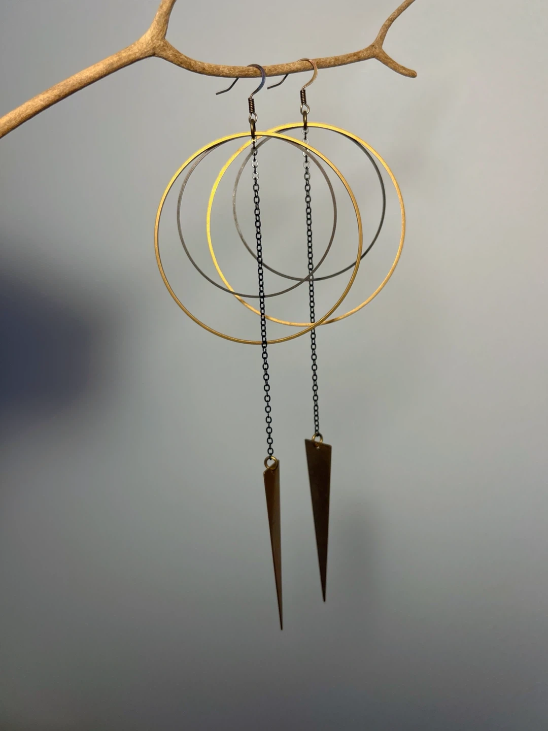 483These are a pair of stylish geometric dangle earrings. They feature a combination of gold and silver-tone hoops with a chain and triangle pendant. Perfect for adding a modern touch to any outfit! ✨ Hand made by local artist. Pick up Dundas and Broadview