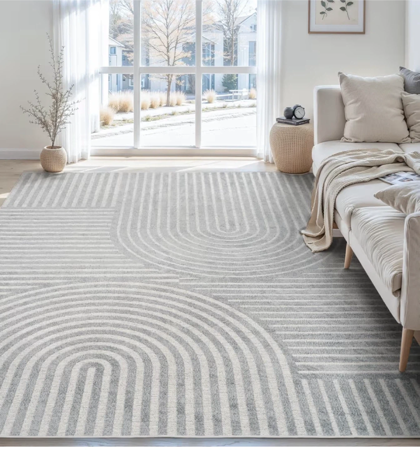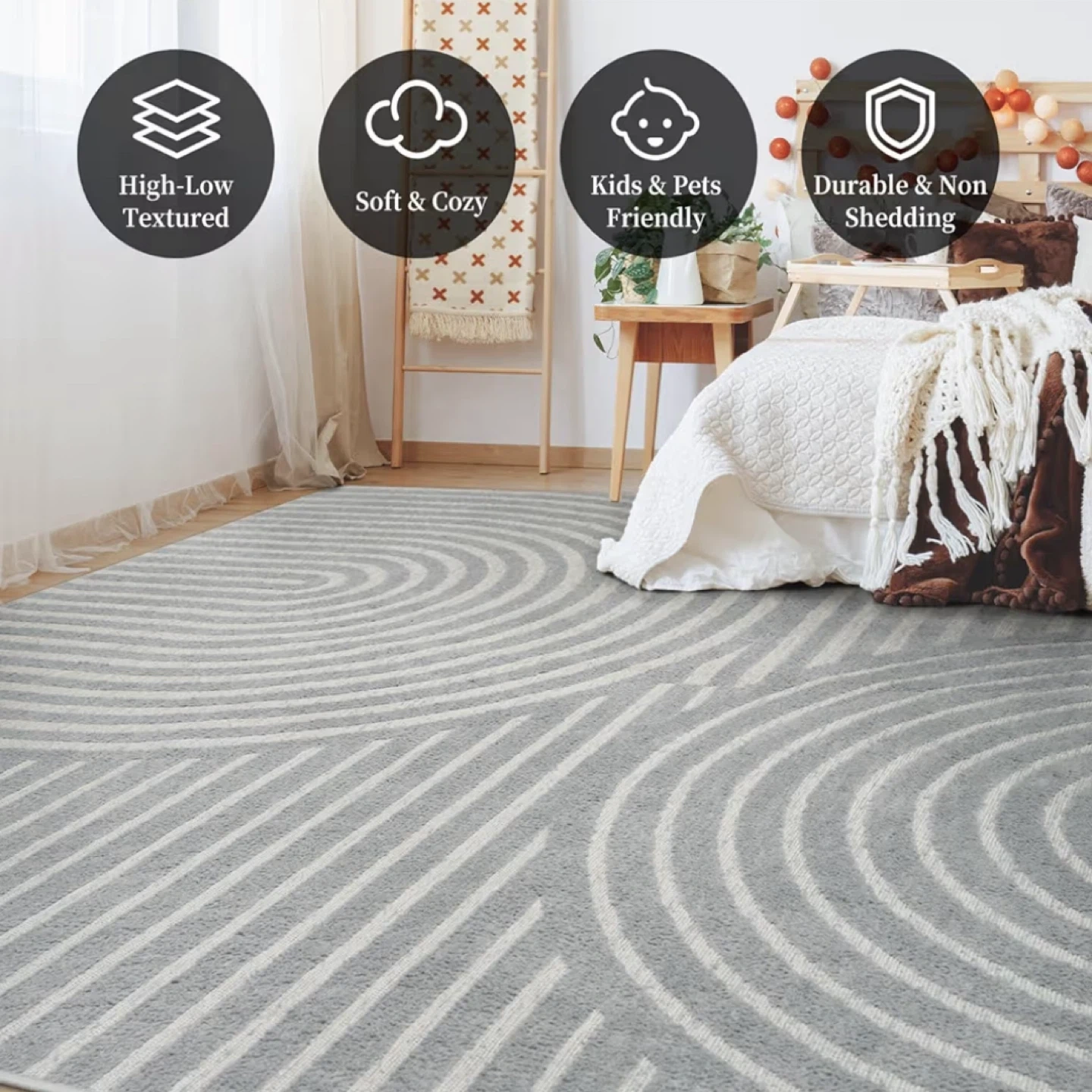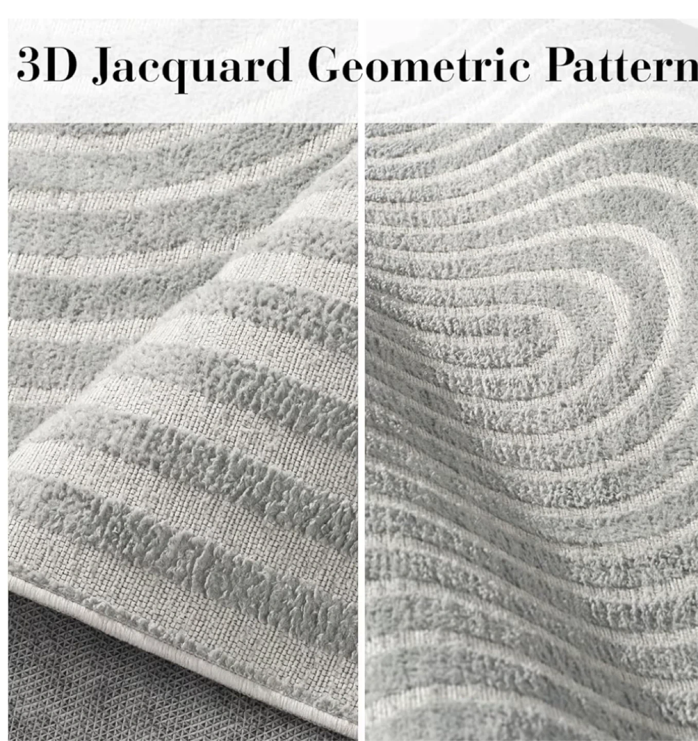 114Add a touch of modern elegance to your space with this stylish area rug! It features a 3D jacquard geometric pattern in a neutral grey and white colour scheme. This rug is soft and cozy, kids & pets friendly, durable & non shedding, and has a high-low textured design. Size is 5ft x 7ft
