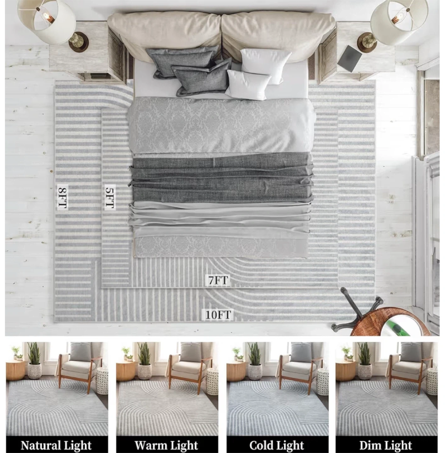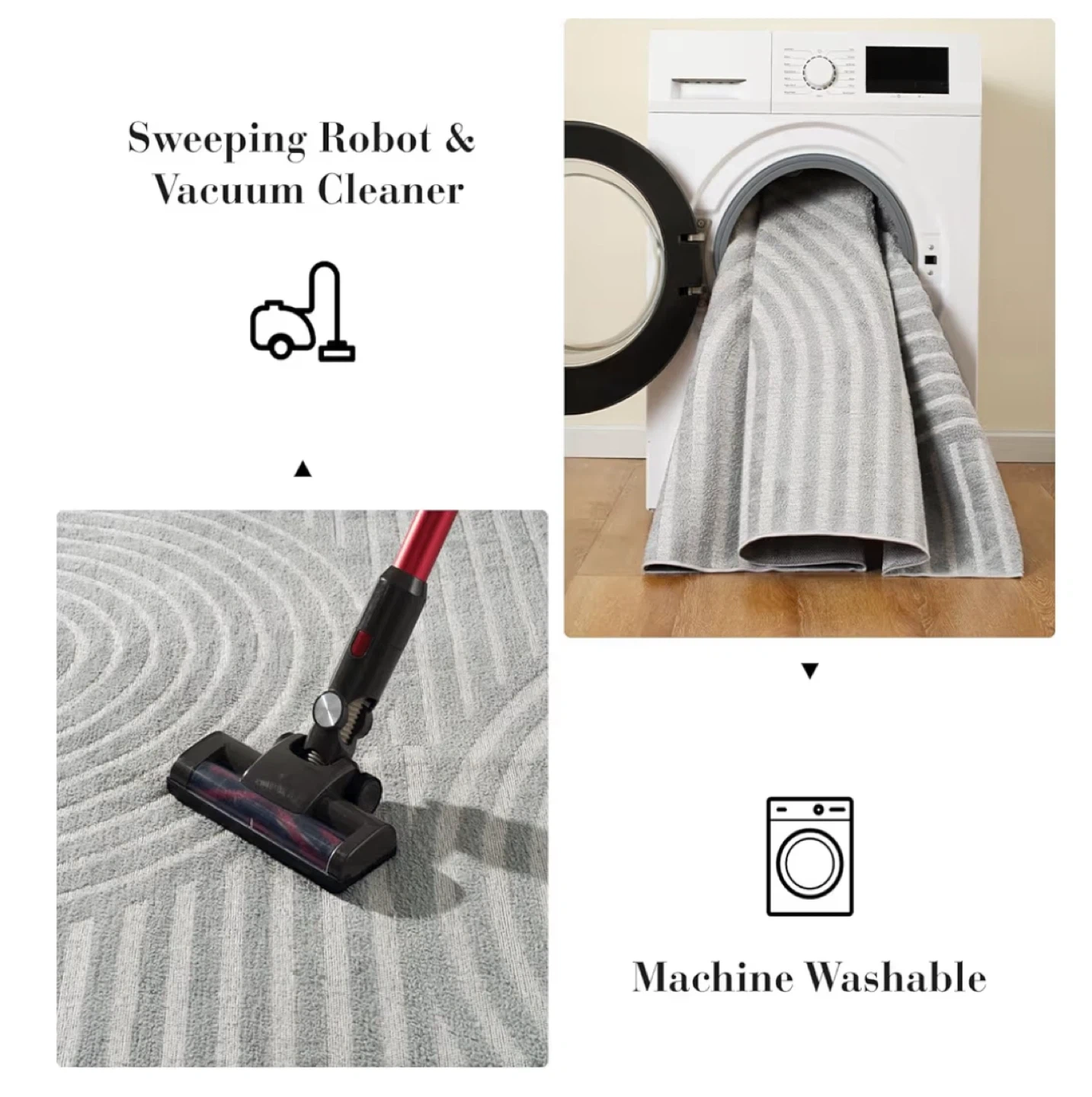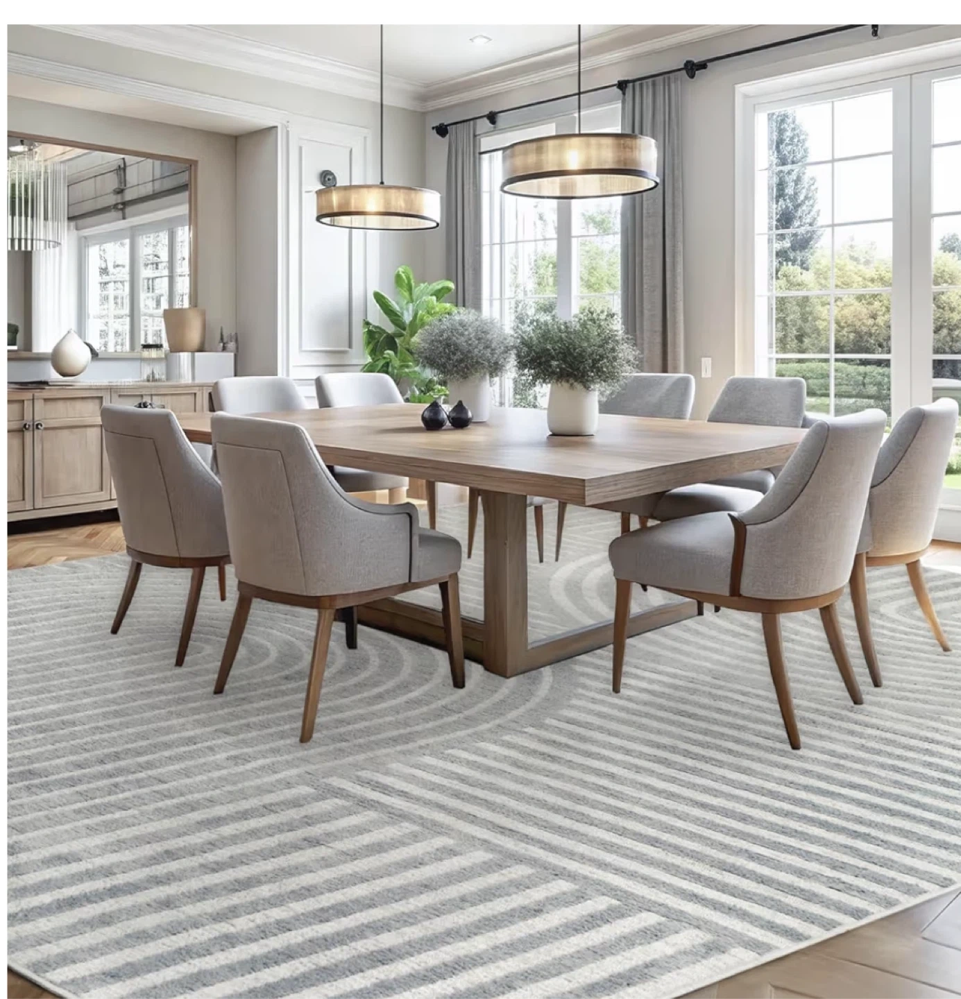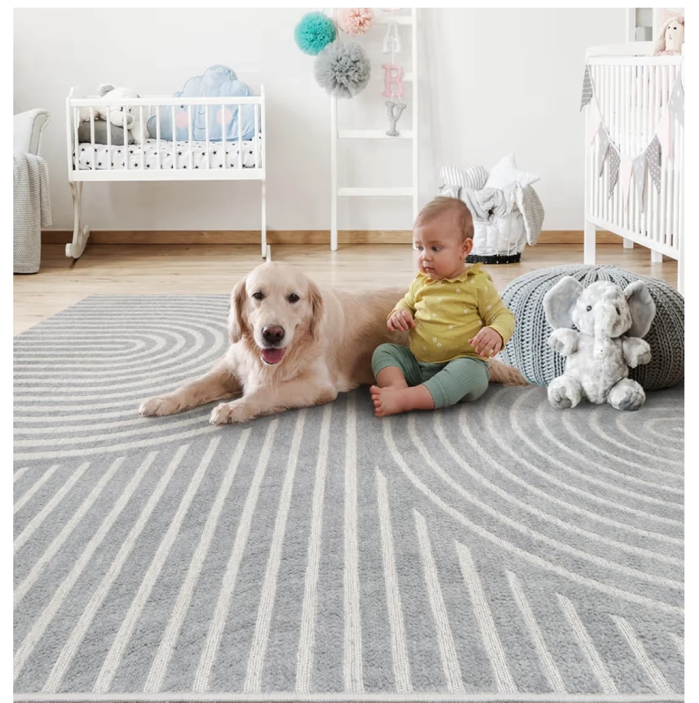 114Add a touch of modern elegance to your space with this stylish area rug! It features a 3D jacquard geometric pattern in a neutral grey and white colour scheme. This rug is soft and cozy, kids & pets friendly, durable & non shedding, and has a high-low textured design. Size is 5ft x 7ft
