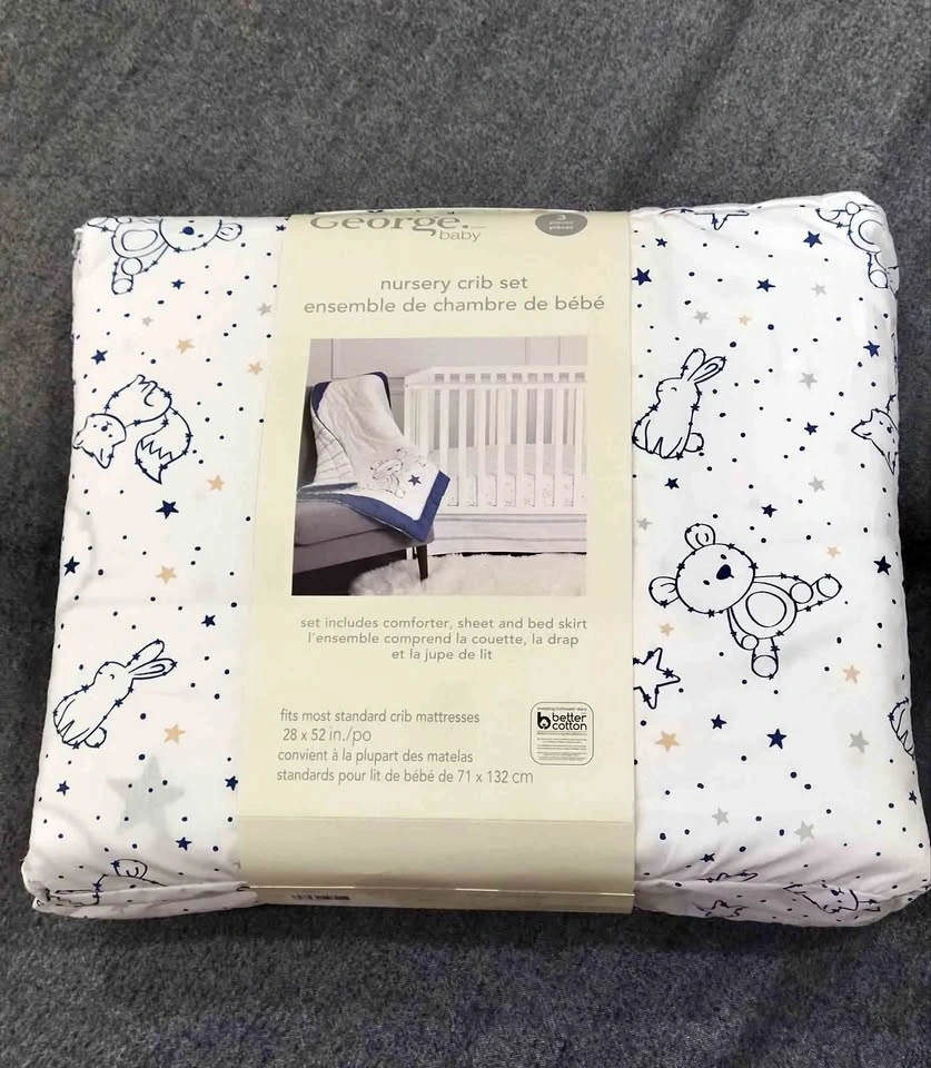Brand new, never used. Includes comforter, fitted sheet, and bed skirt. Fits most standard crib mattresses (28" × 52"). Pickup: Major Mackenzie Dr & Cityview Blvd, Vaughan